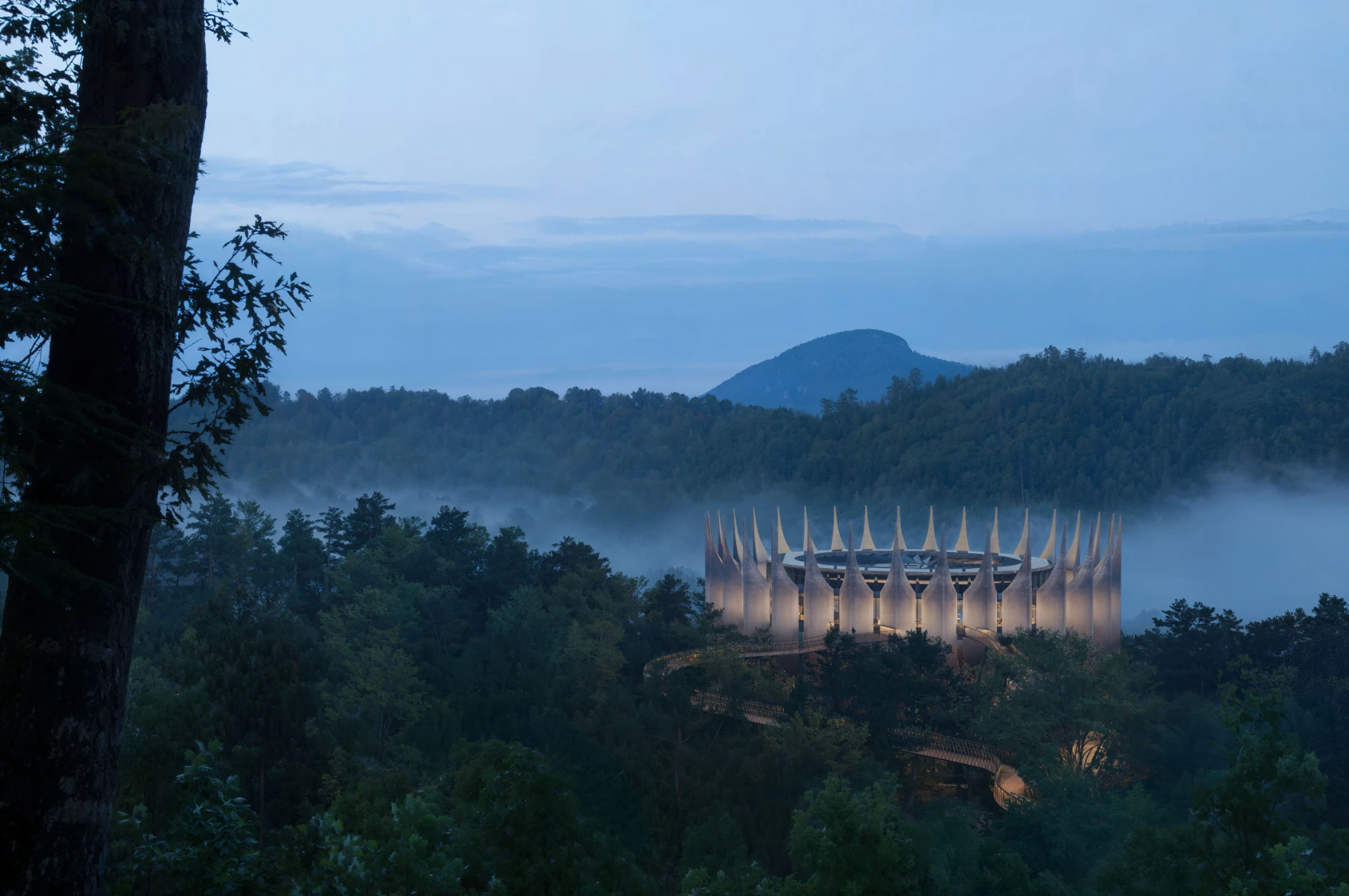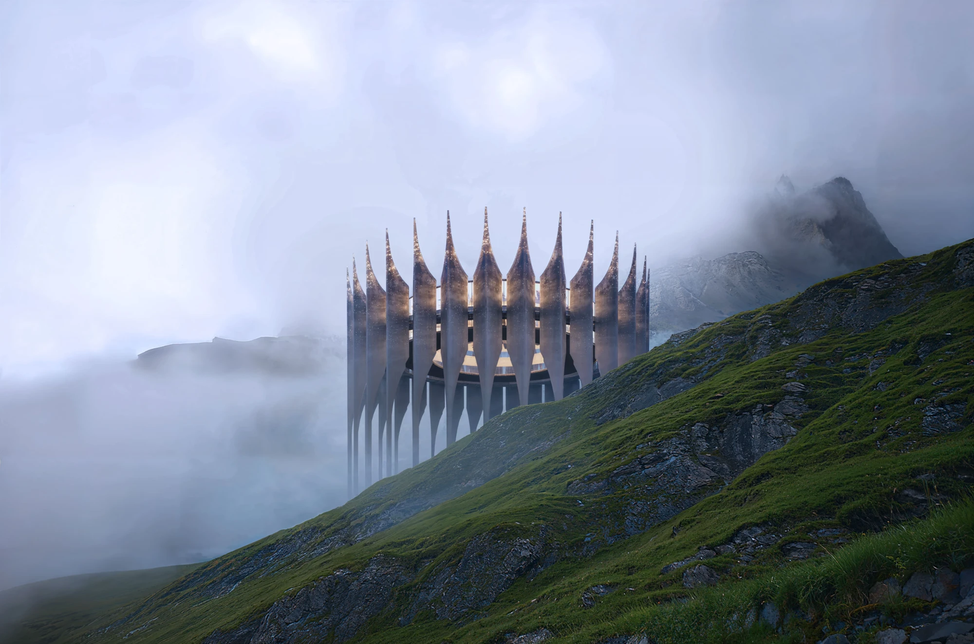 Матеріал зовнішньої конструкції — це інноваційна суміш бетону та скла. У нижній частині домінує бетон, тоді як до верхніх шарів поступово додається більша кількість скляних включень. Завдяки цьому виникає плавний градієнт: від темної монолітності внизу — до напівпрозорої, майже ефемерної структури нагорі. Складається враження, ніби вершини піків розчиняються у хмарах.