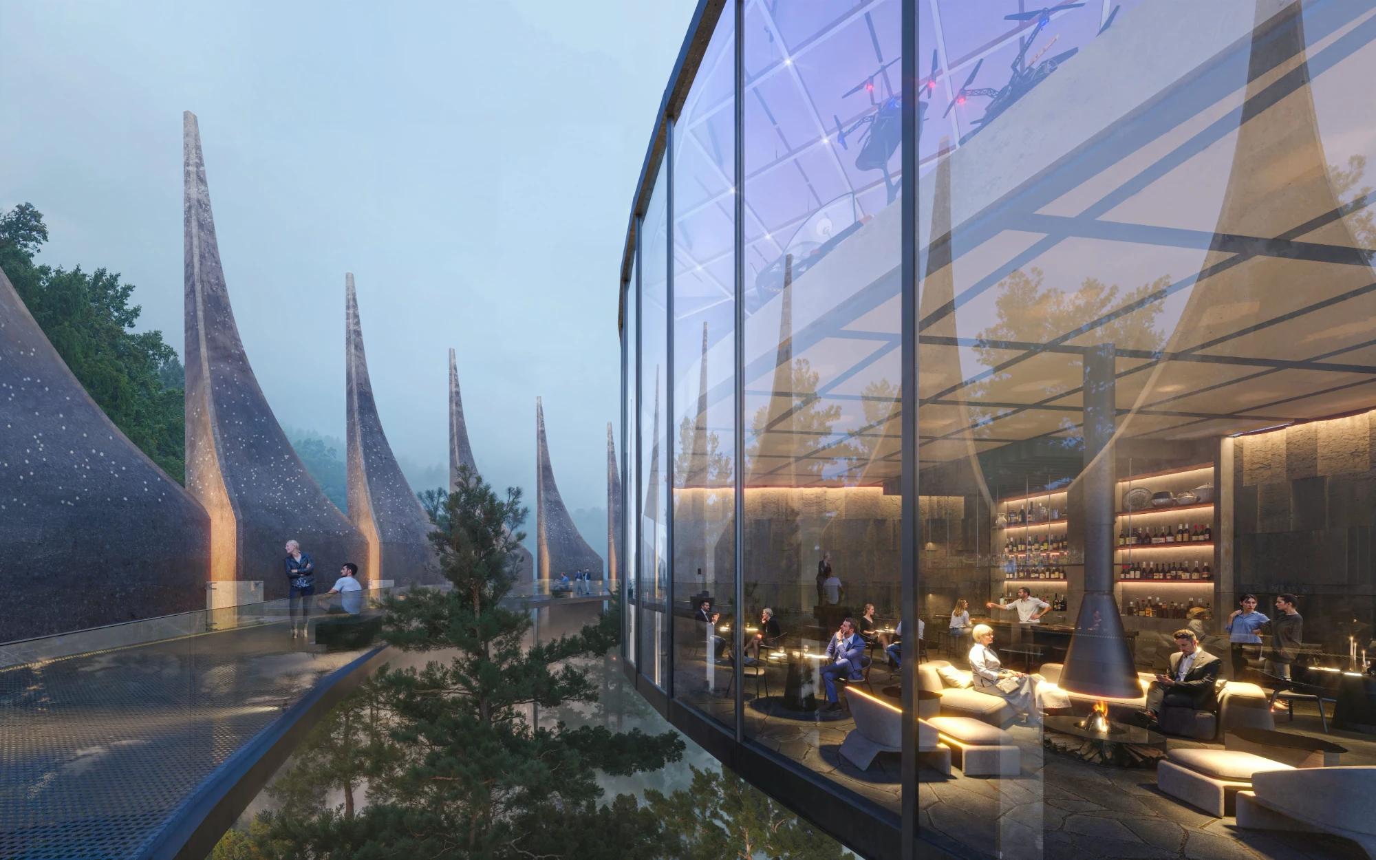 Внутрішній об’єм станції — прозорий та панорамний, що візуально стирає межу між архітектурою та природою.