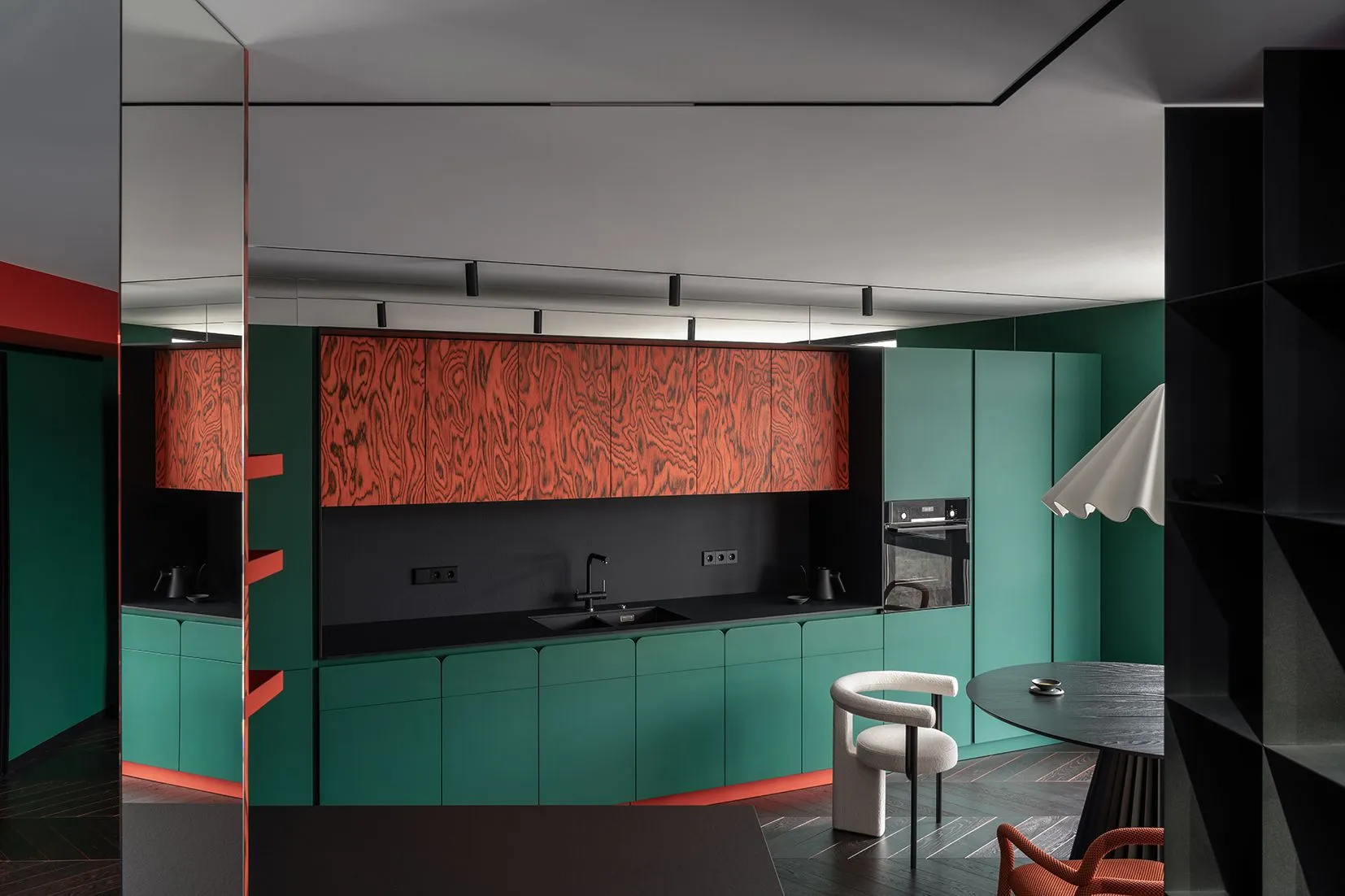 Guests are greeted by a bright red hallway, where in addition to the necessary elements: shelves for shoes, hangers, a large mirror, we have collected all the technical units behind hidden doors. That keeps the room expressive and full of design idea. It flows organically into the green kitchen-living room, which is delimited from the corridor by a glass lattice partition
