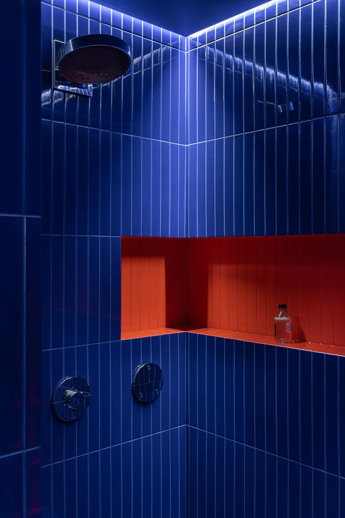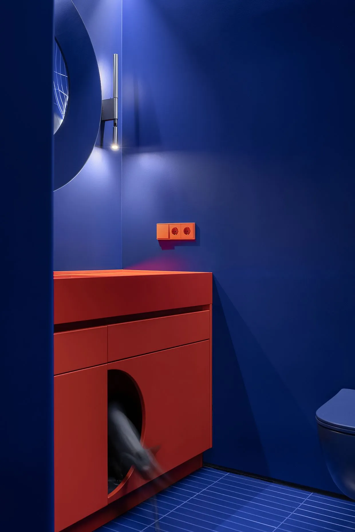 Finally, a cobalt bathroom with bright red accents and a secret hole in the cabinet for your favorite pussy. Emphasizing the preferences of customers and attention to their pet.