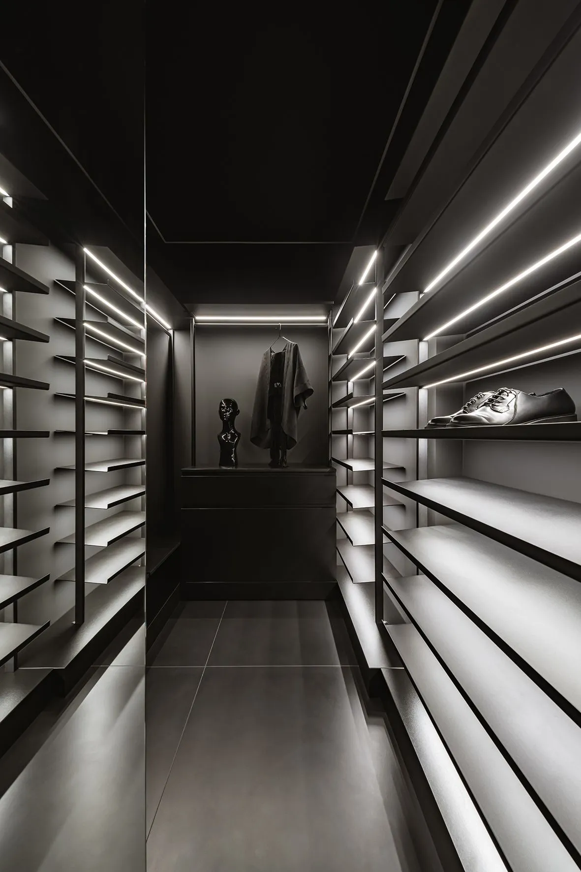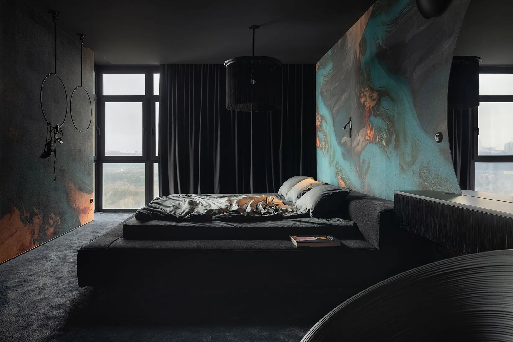 The bedroom, which includes a bed of 7 m², is decorated with fancy wallpaper around the perimeter, all together it creates the effect of a box. From here, through metal curtains leads the entrance to the black dressing room.
