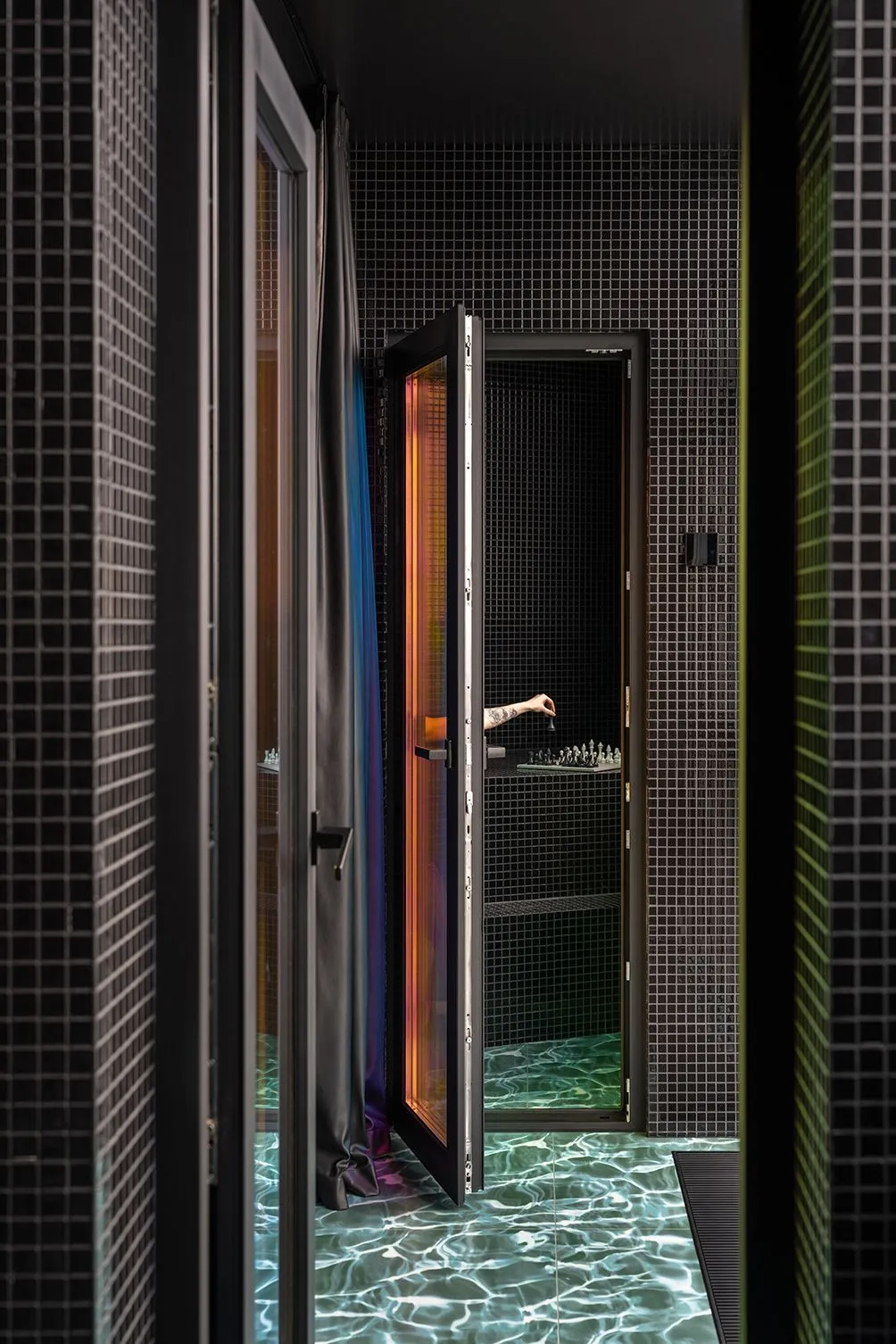 The living room is minimally filled with furniture and objects like the rest of the apartment. In this we saw the sense in order to minimize costs and resources. Most of them are made to order and individual needs of customers. For example, a fur colo-bed with a diameter of 2 meters, from which you can observe a beautiful view from the window. It also serves as a passage to the balconies. Decorated with black mosaic and floor imitating water. One of the wow effects that turns balconies into a kind of “pools” inside the apartment.