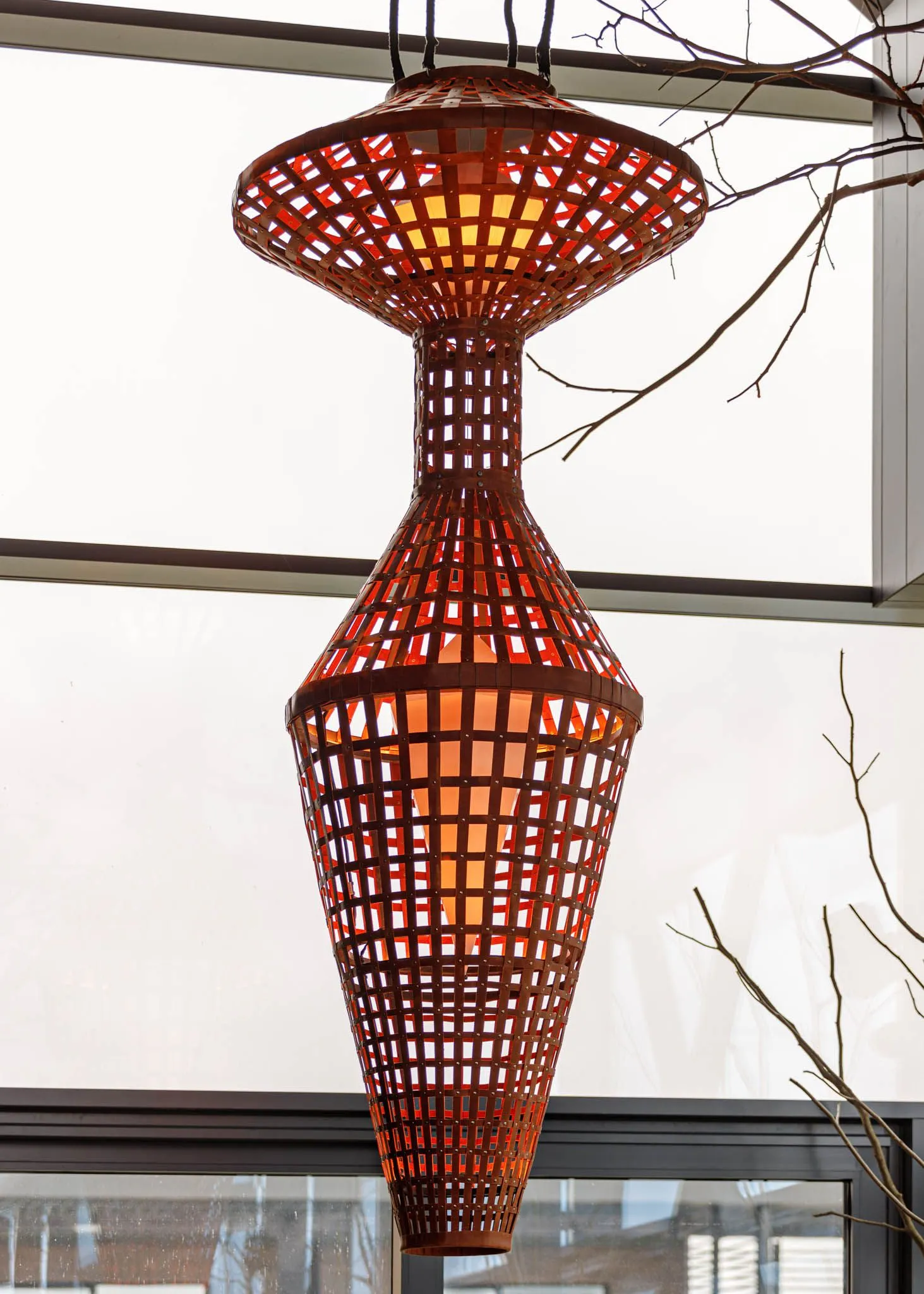 “Svitlotin” - a unique designer chandelier, created from high-quality eco-leather, stretched on a durable metal frame. Its geometry resembles a double prism that grows in the center, forming a feeling of strength and balance. The interweaving of eco-leather forms a rhythmic grid through which the warm light of the inner light bulb penetrates, repeating the shape of the outer frame.
