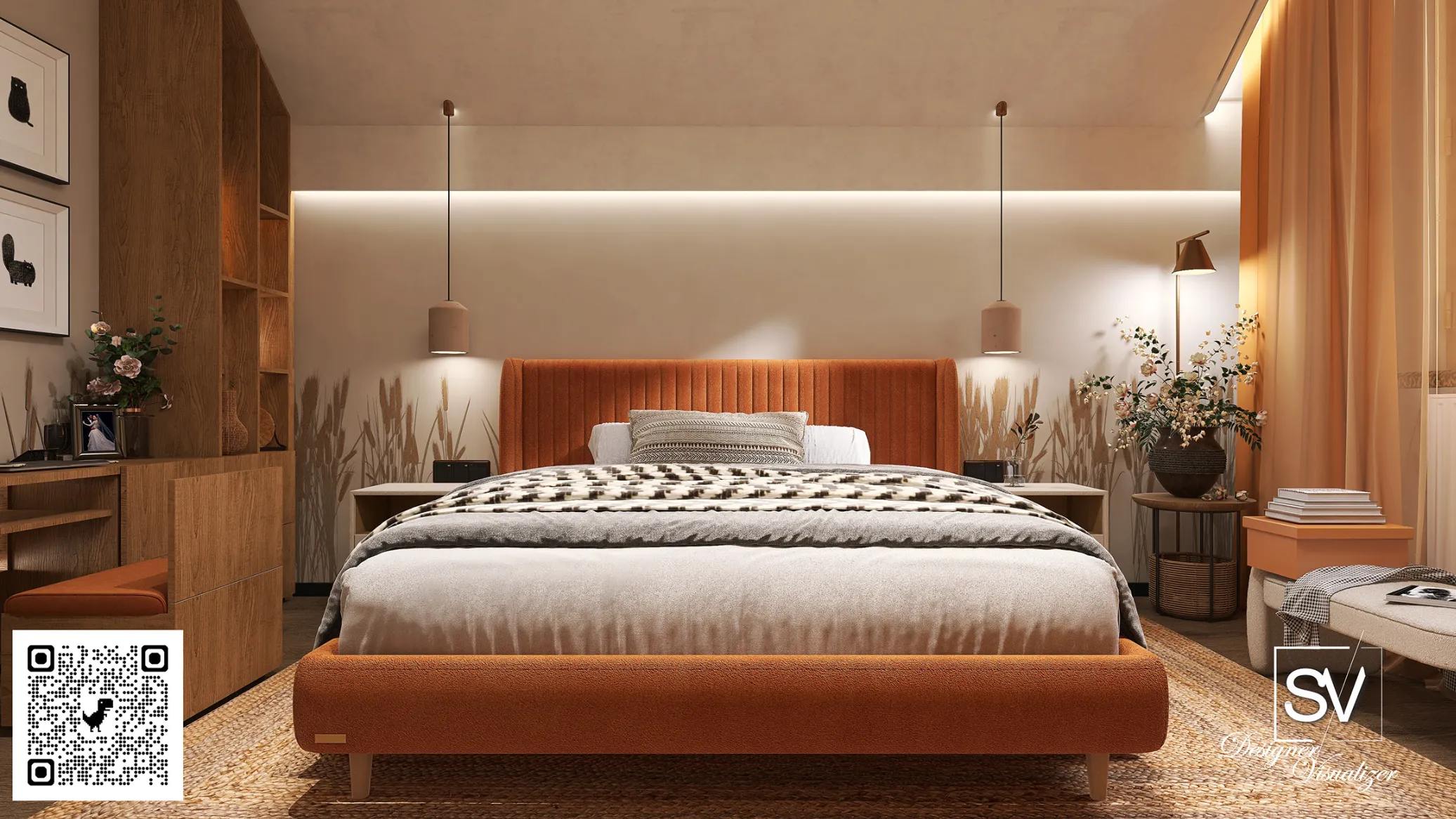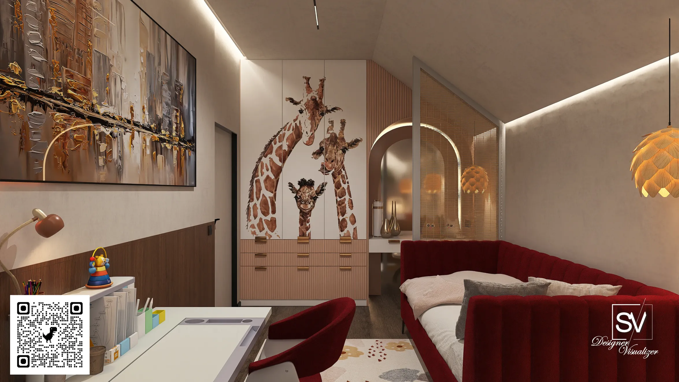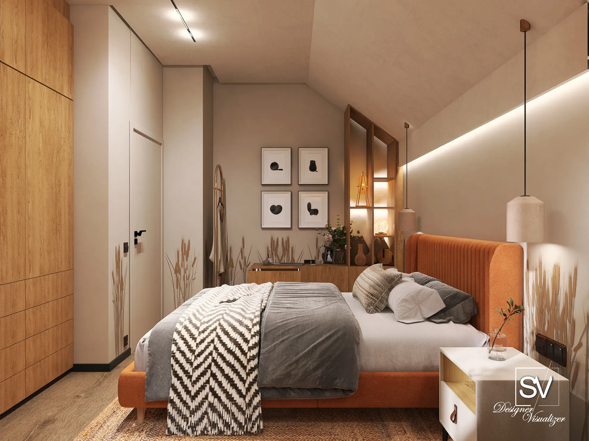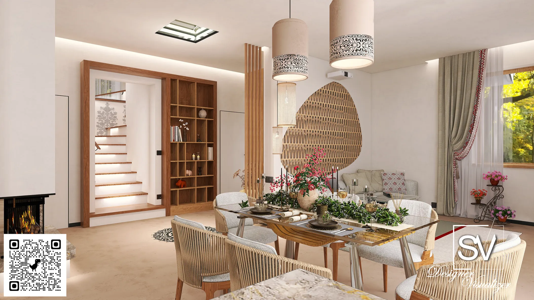 The interior design gives the impression of comfort and warmth, harmoniously combining modern aesthetics with expressive ethnic motifs.
