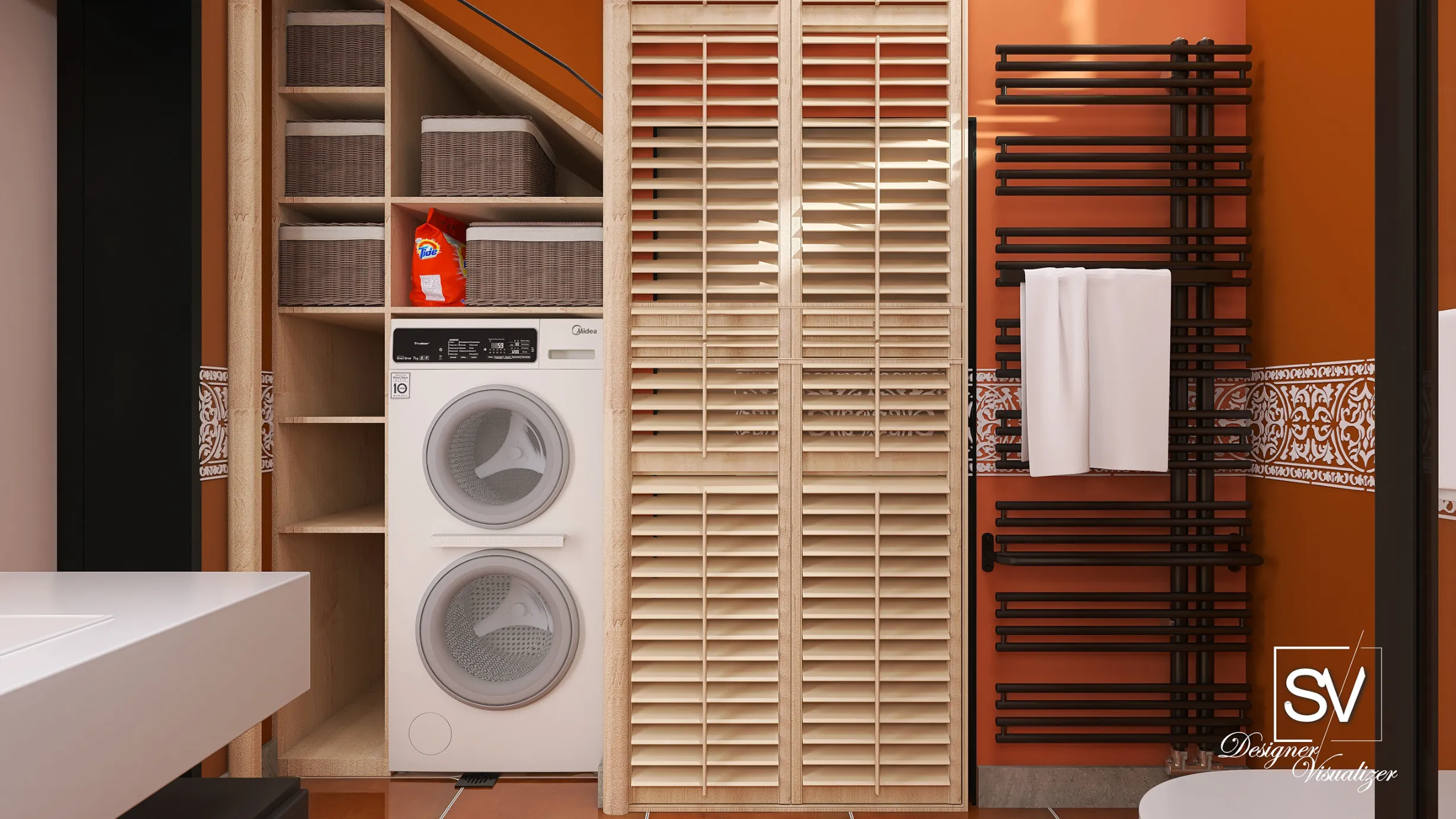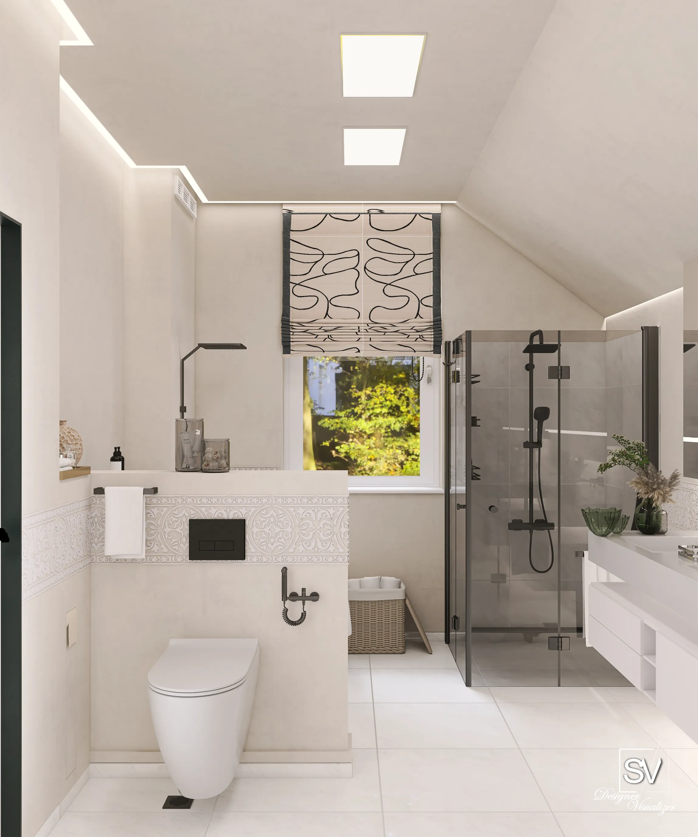 Color palette: The basis of the interior is light, natural shades - beige, white, cream, which are complemented by warm tones of natural wood, clay, brick. Bright accents are added by patterns in red and black colors that give the space character and dynamism.