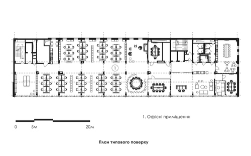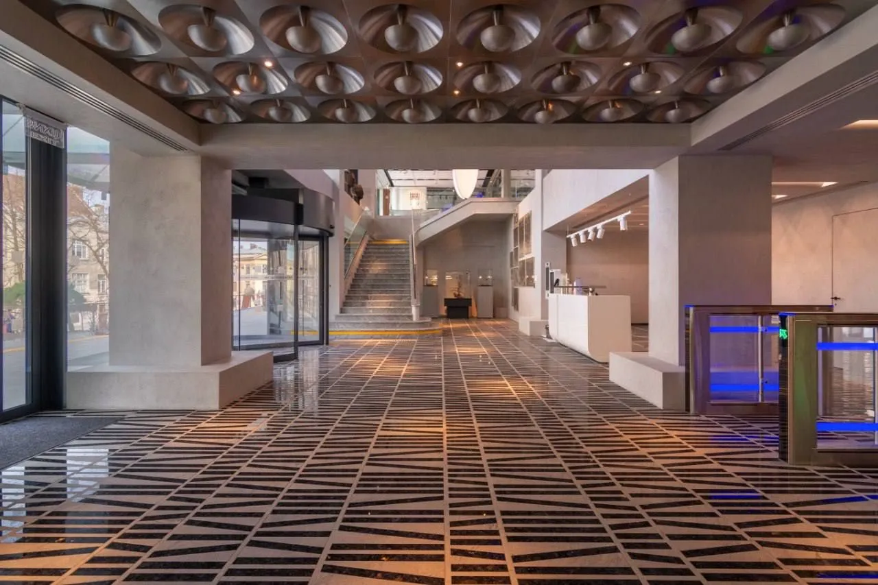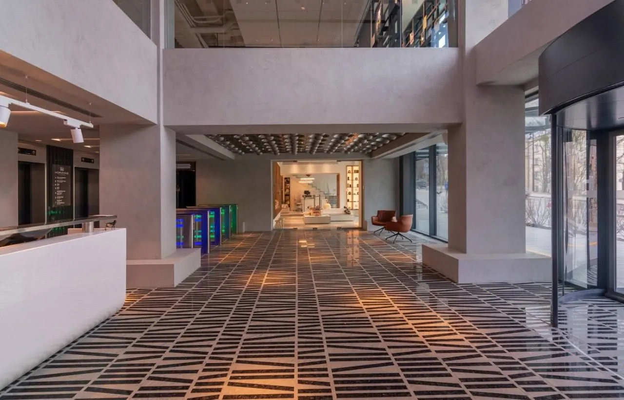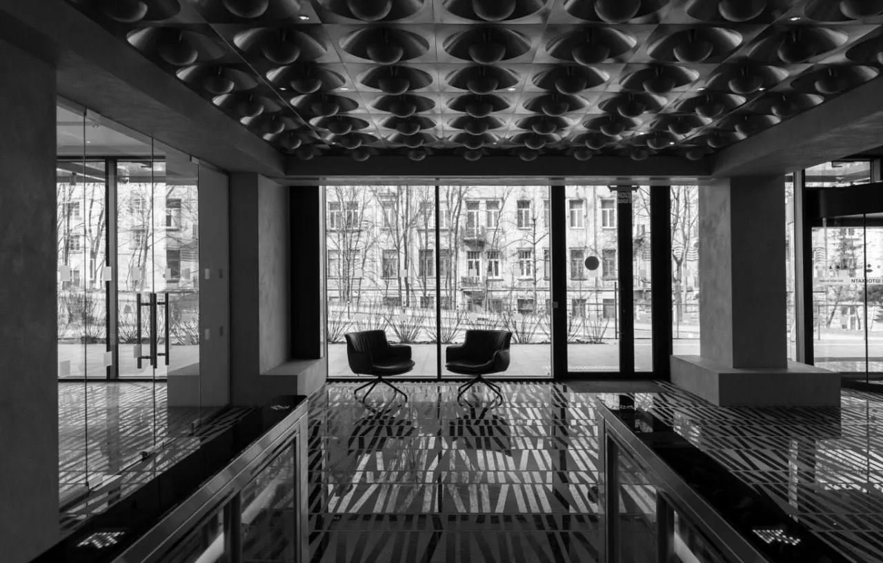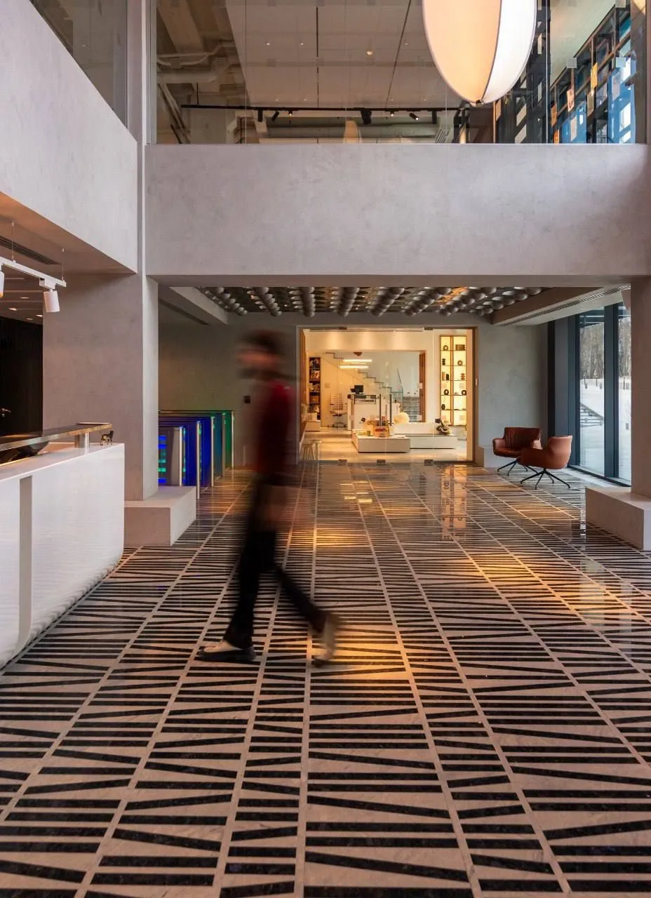 The space of the business center “Horizons” speaks through materials, textures and light. The lobby of the gallery remains visually elegant and functionally understandable. The graphic motif of the façade — a rhythmic pattern resembling dominoes or books on shelves — is repeated in the interior: on the marble floor of the lobby and conference hall.