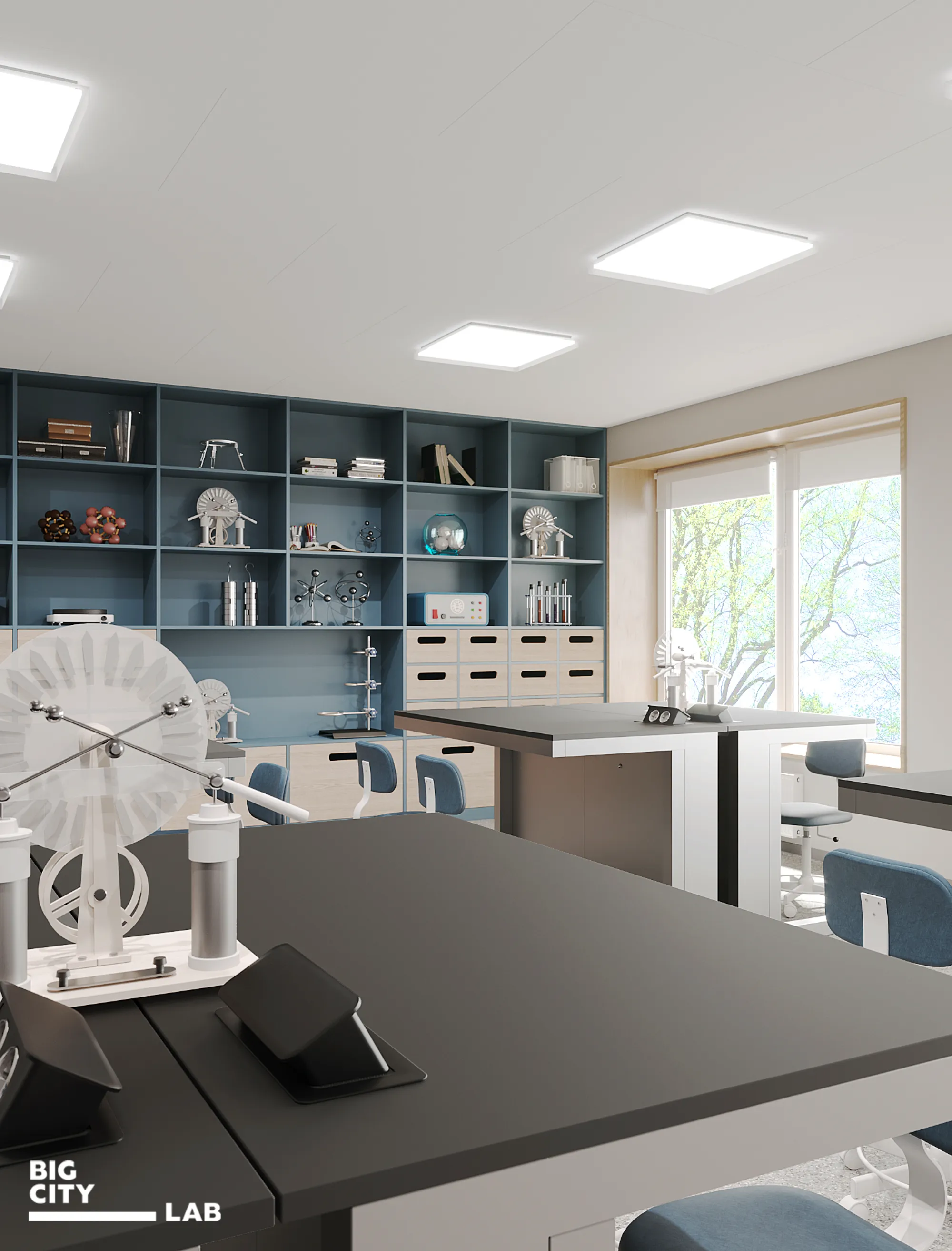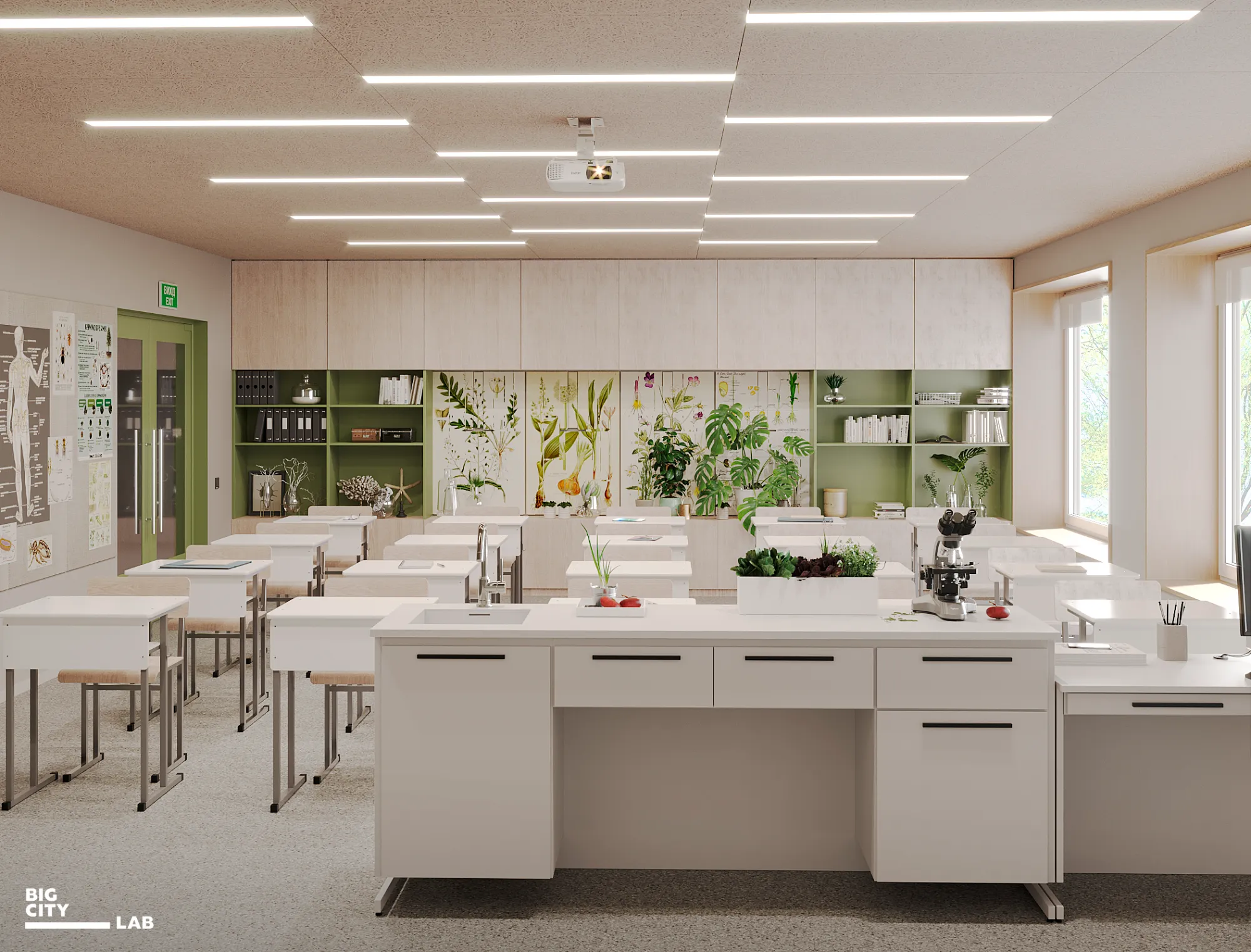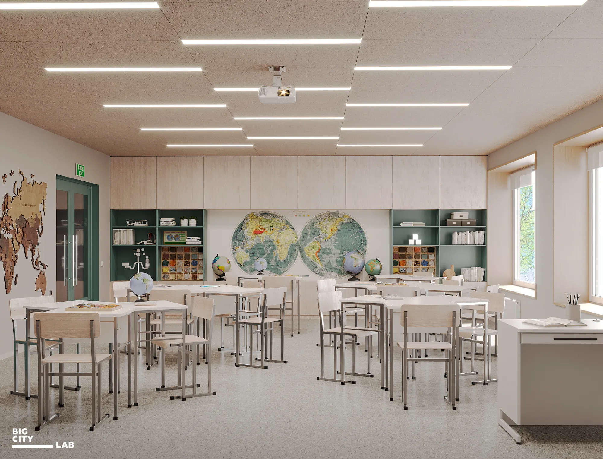 The colors of natural science classrooms and laboratories are turquoise, mint, sky blue, and deep purple. It is these shades that form a sense of connection with nature, the environment and science.