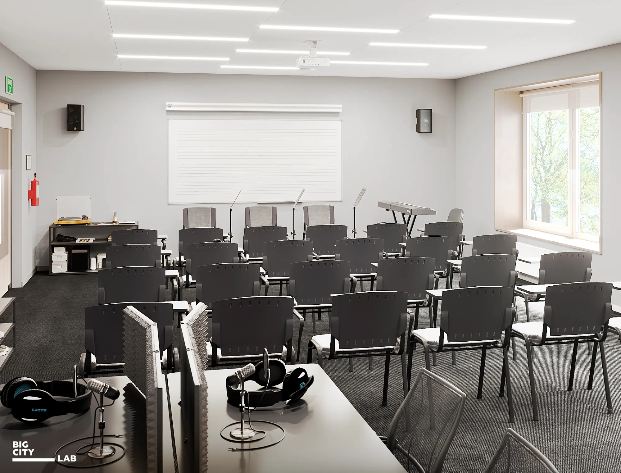 For theoretical classrooms, light neutral colors were chosen — warm white, sand, olive, light wood. Because they are classes of daily learning practice, so the space should be calm and neutral, not dominating, but maintaining concentration.