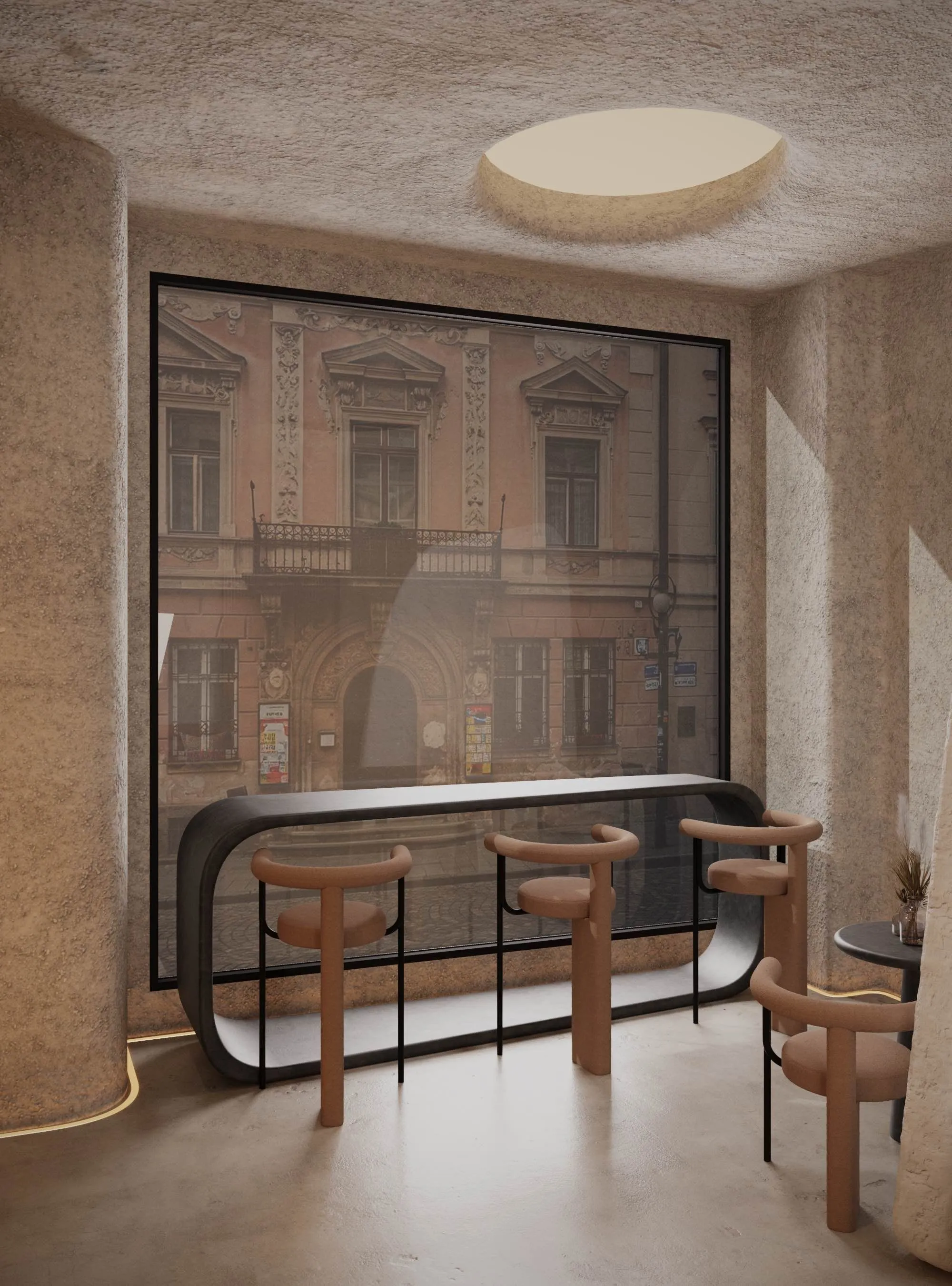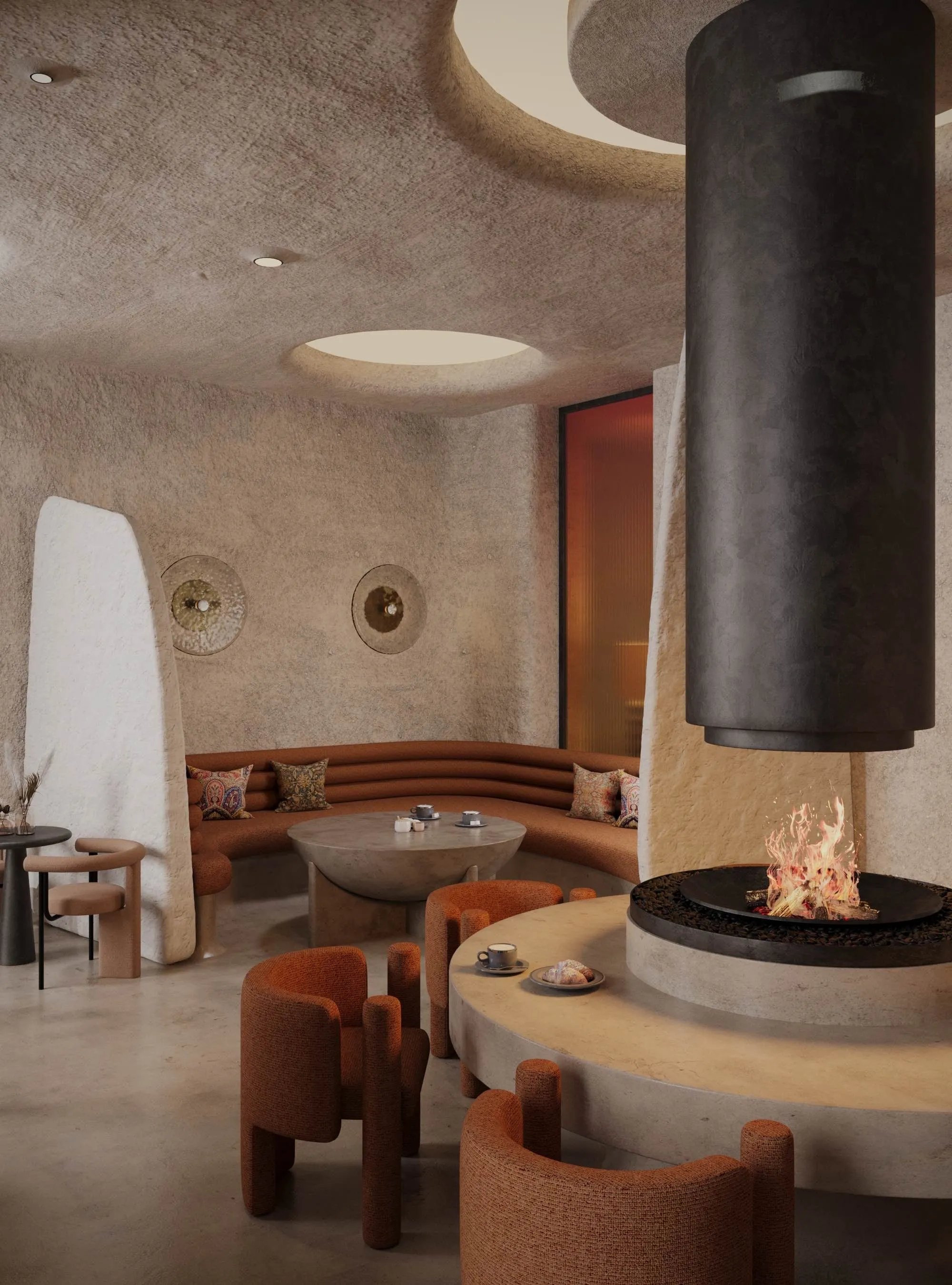 The interior of the cafe is influenced by the aesthetics of the film “Dune” - with an emphasis on tranquility, warm natural shades and tactile materials. Space forms a sense of isolation and immersion.