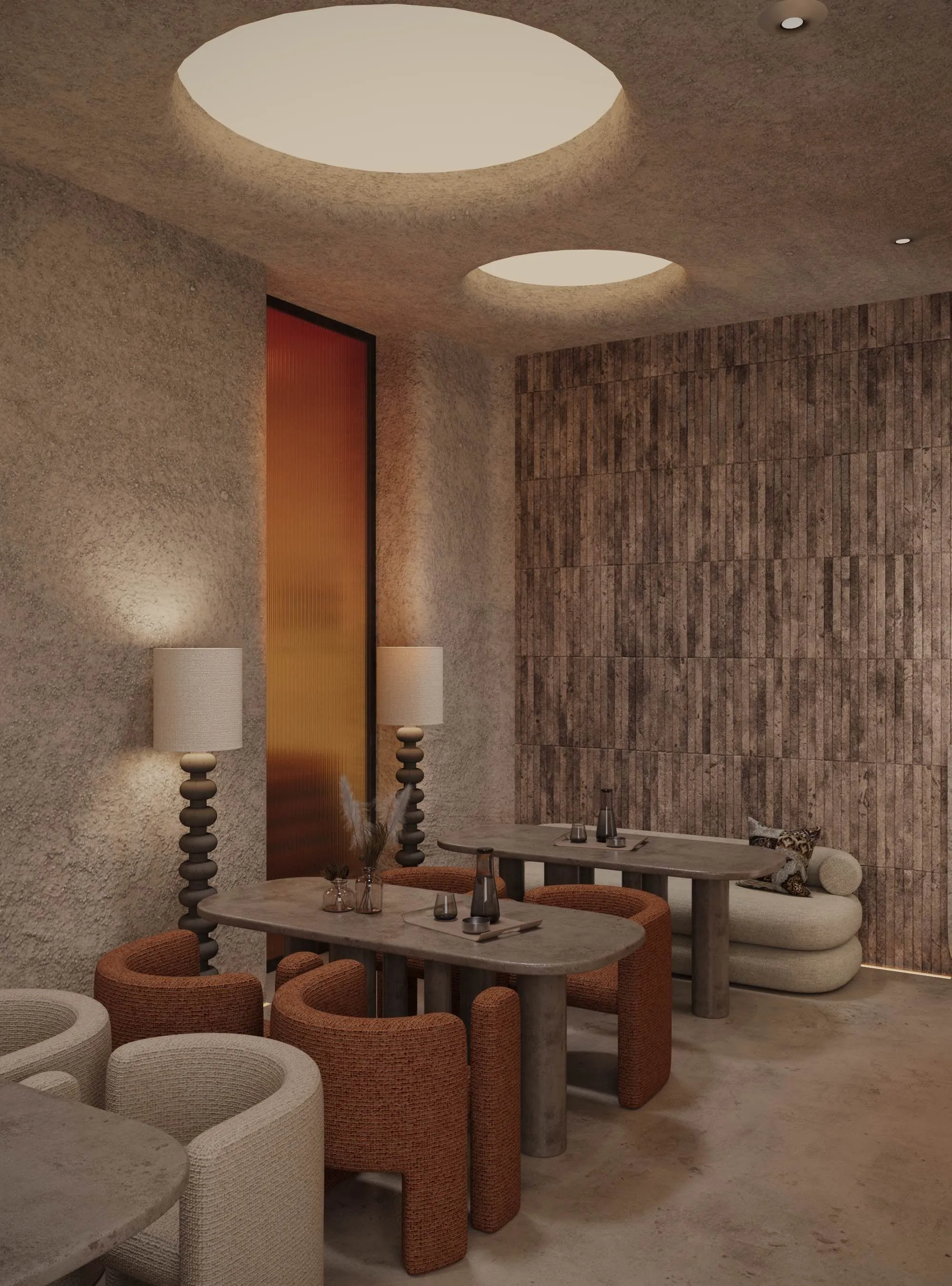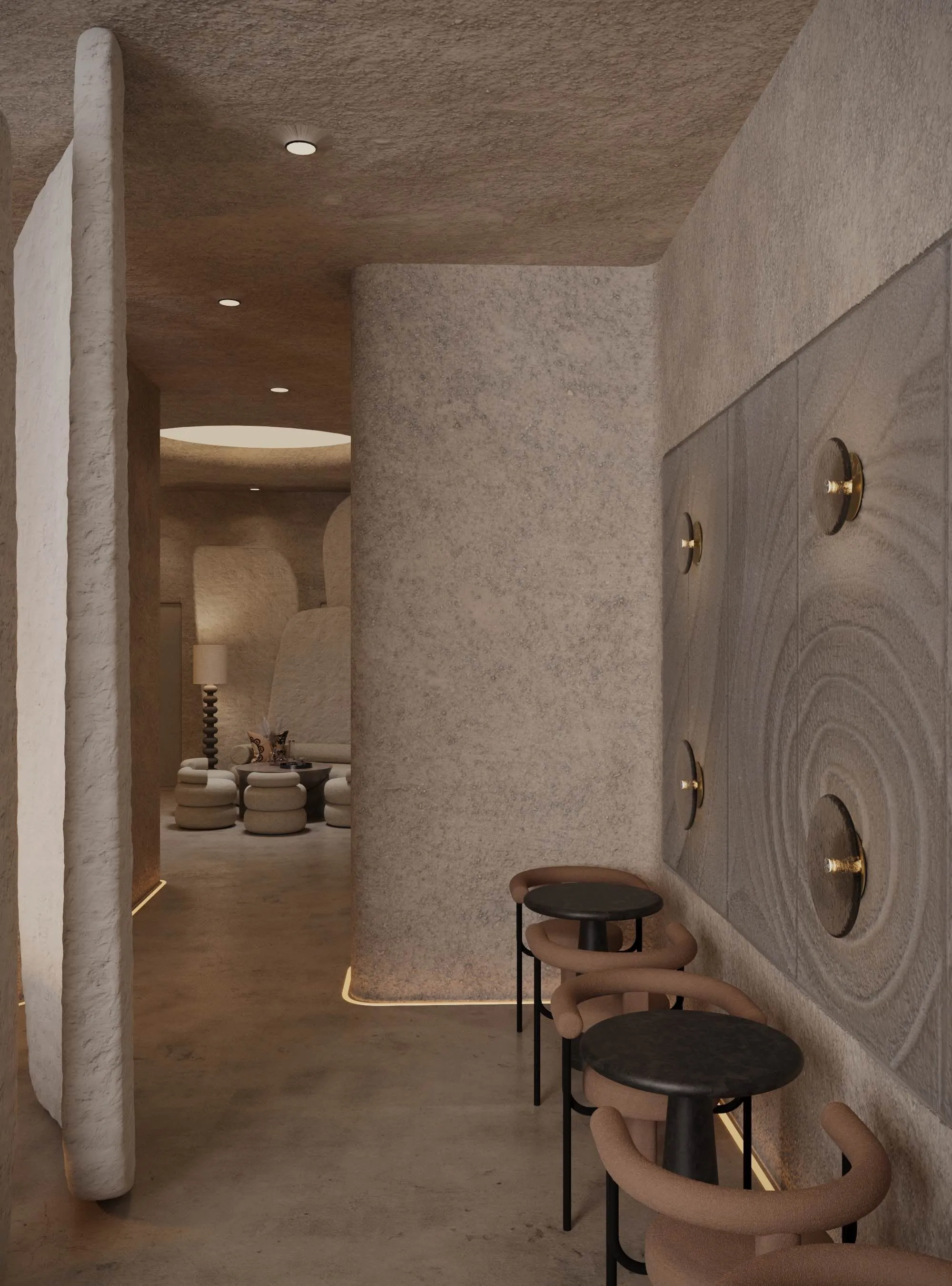 Textured walls, soft lighting and plastic shapes create a discreet, holistic atmosphere where each element works for an overall sense of calm and presence.