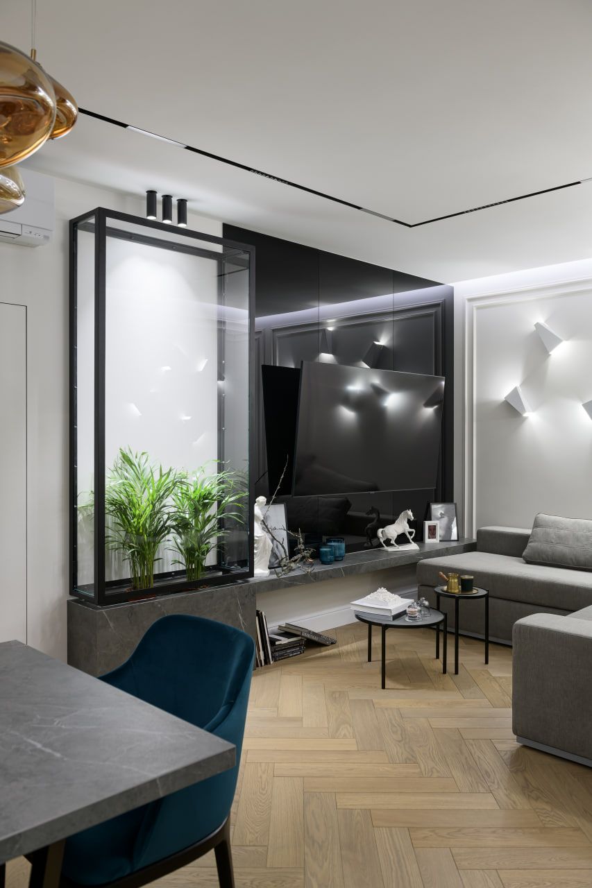 This interior demonstrates that even within a compact apartment you can realize all the desired scenarios of life — from concentrated work to a cozy family evening.