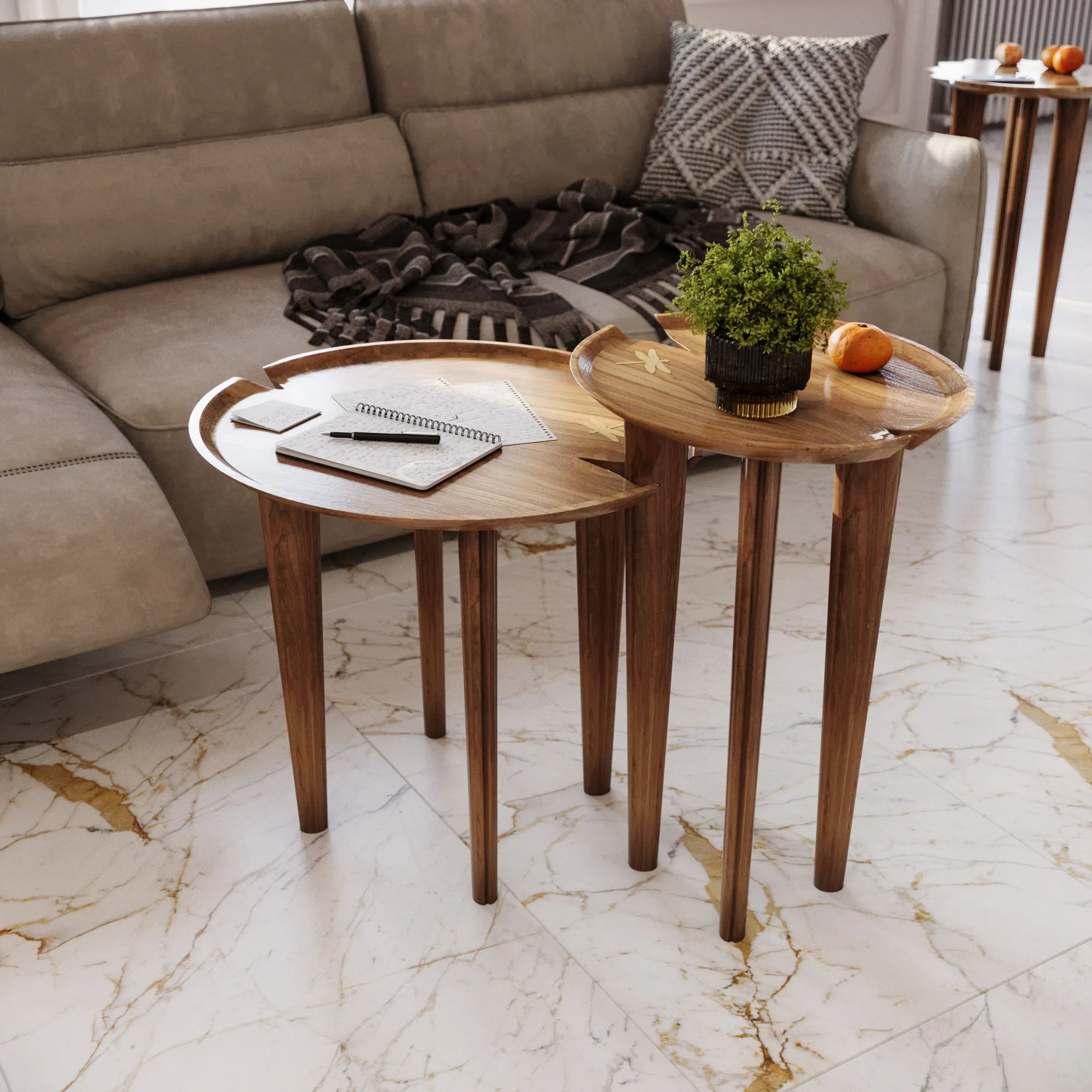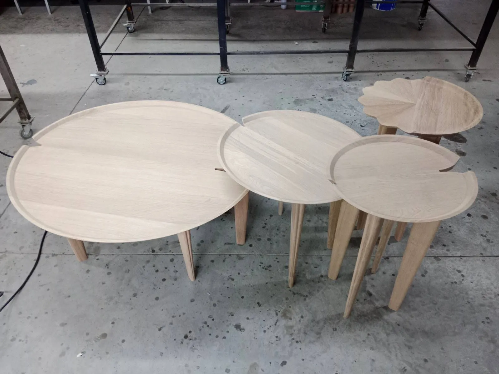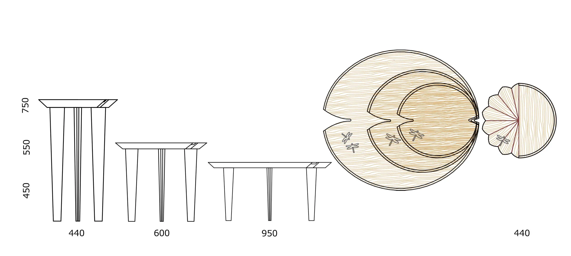 Execution: made of solid wood with decoration of the countertop with brass insect Dragonfly. Two forms - flowers and leaves, different sizes of tables, can make up a composition on the same theme, which makes it possible to diversify the set of forms in your interior.