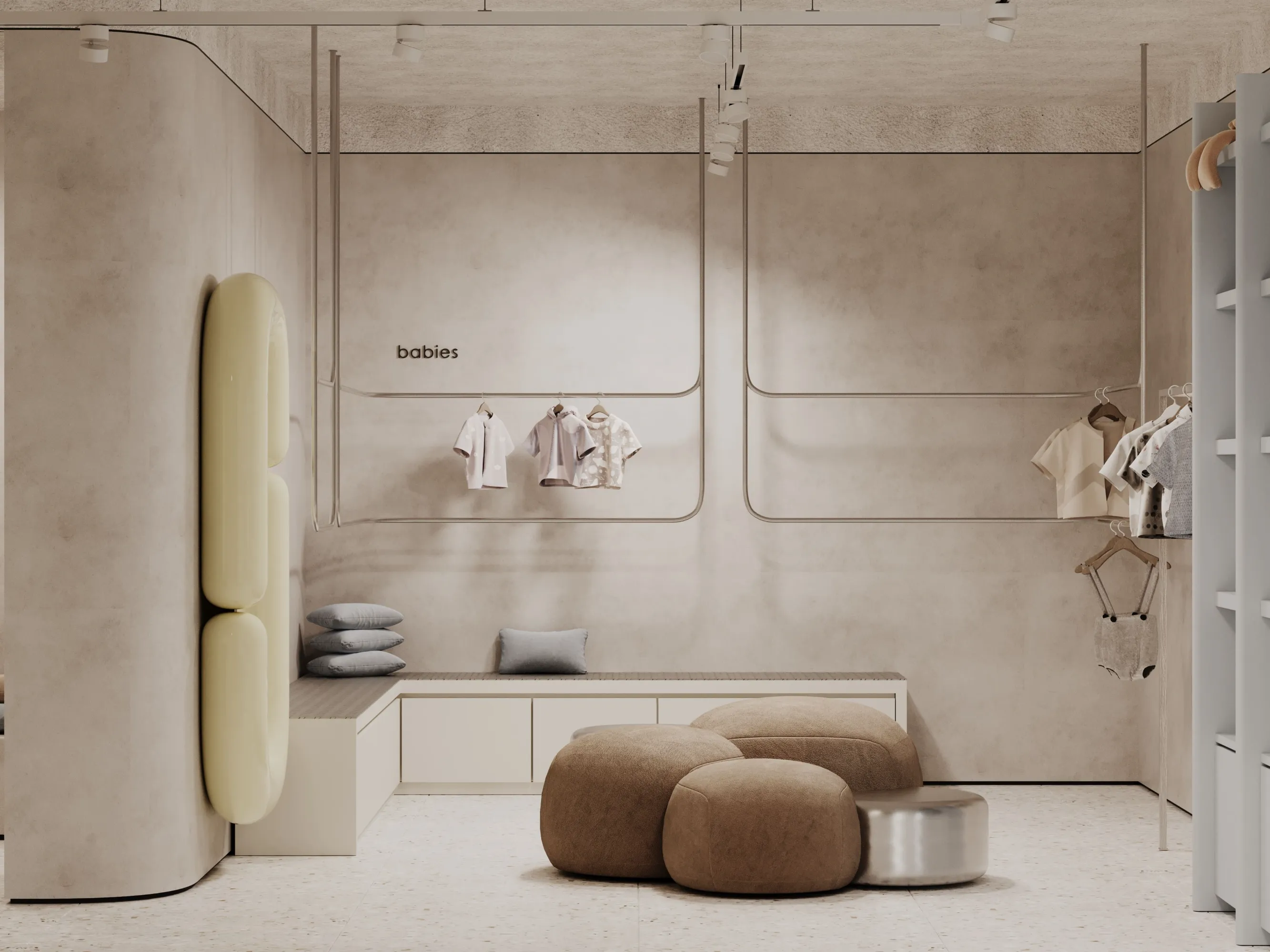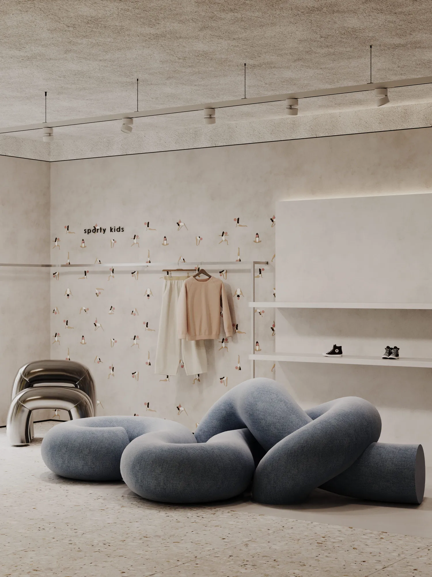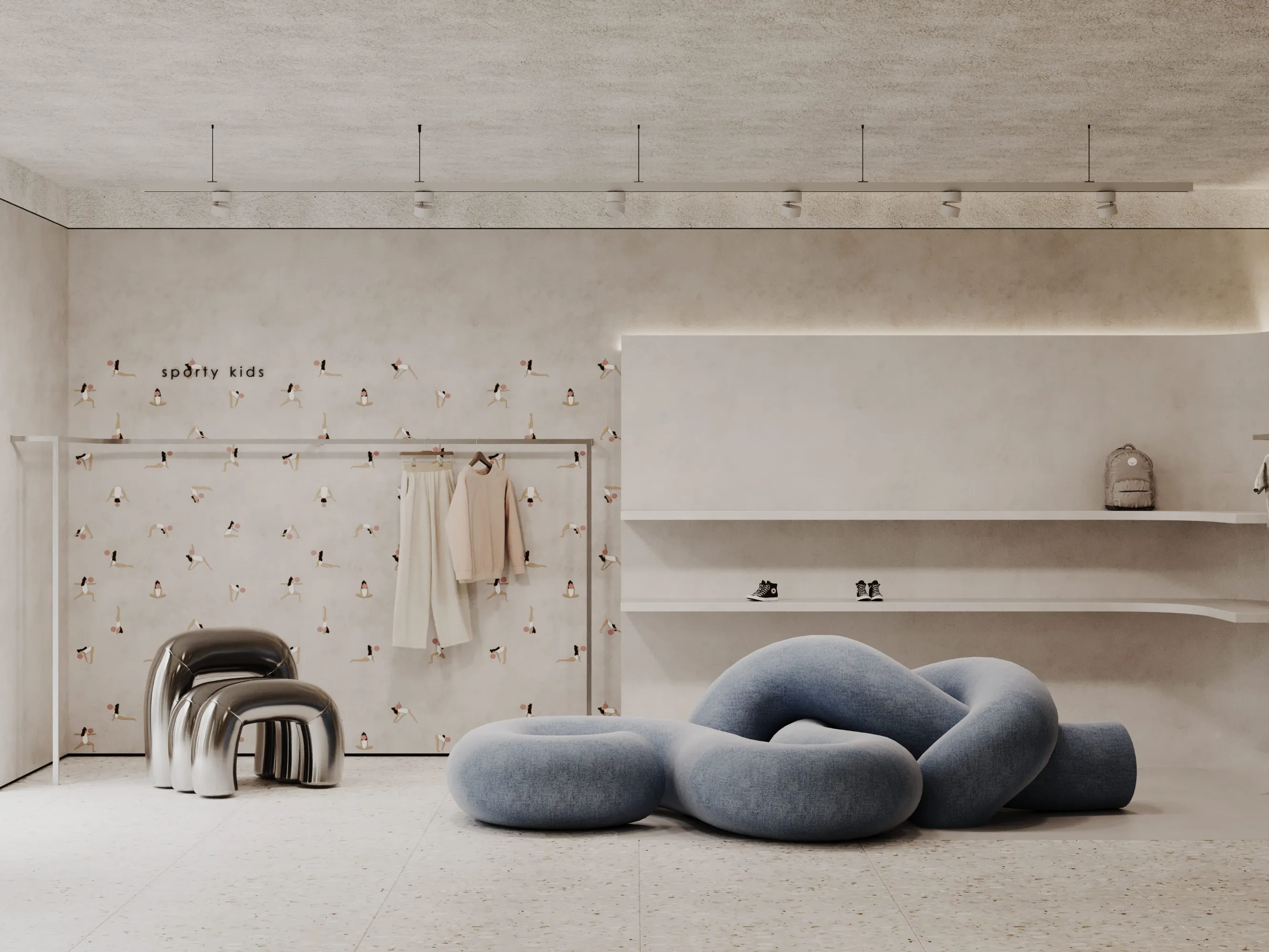 A playful project of a children's clothing store space in which the theme of chewing gum develops. The central place is occupied by the play area, which is associated with small chewing gum balls and where mothers can leave the smallest clienites while they choose clothes. Sofas of interesting shapes that resemble stretched chewing gum, or fabrics with a print of chewing gum. Metallized elements that resemble wrappers. The colors are selected accordingly. And once again, they emphasize the mood in the sportswear area, little gymnasts who inflate chewing gum bubbles.