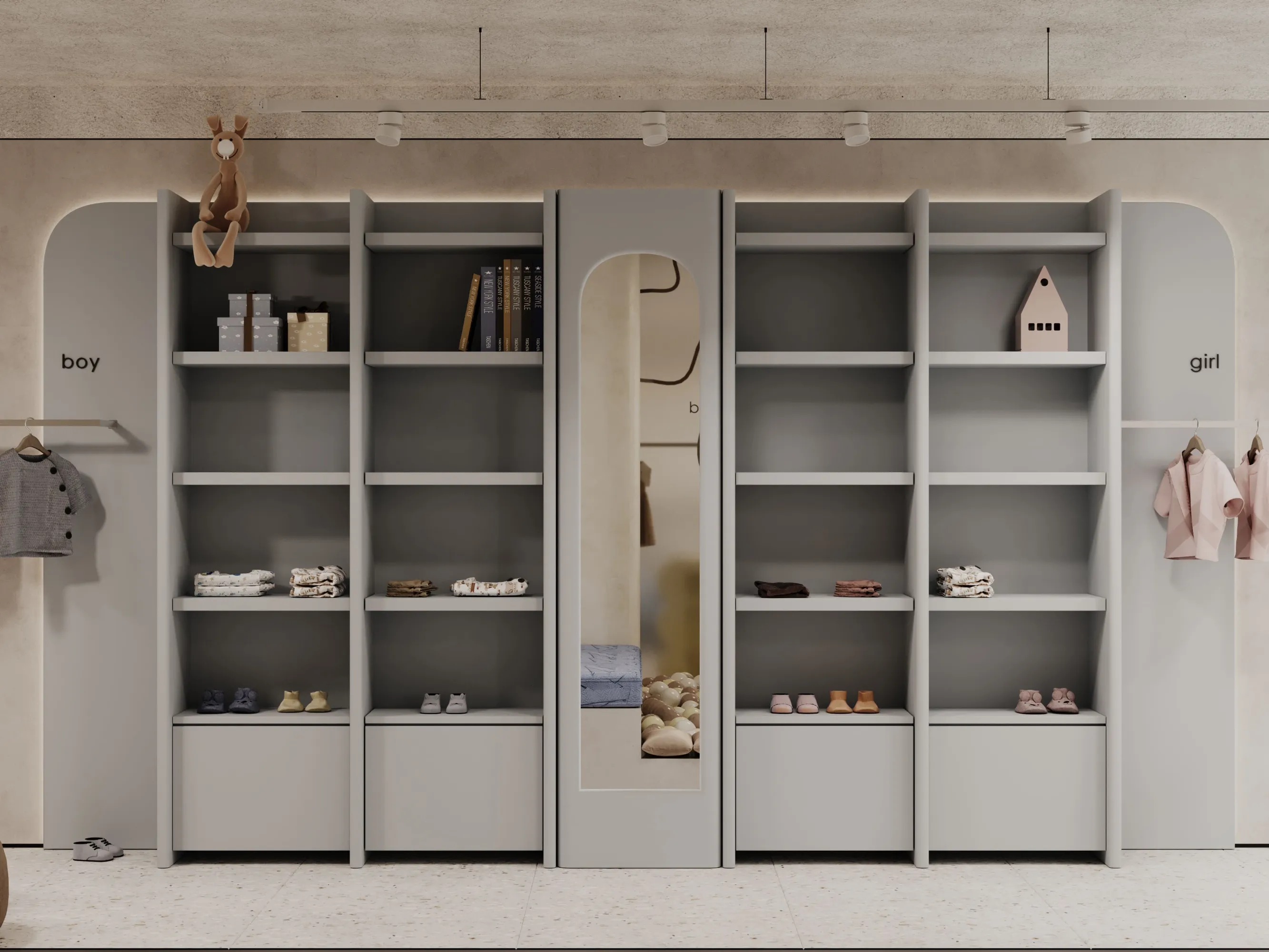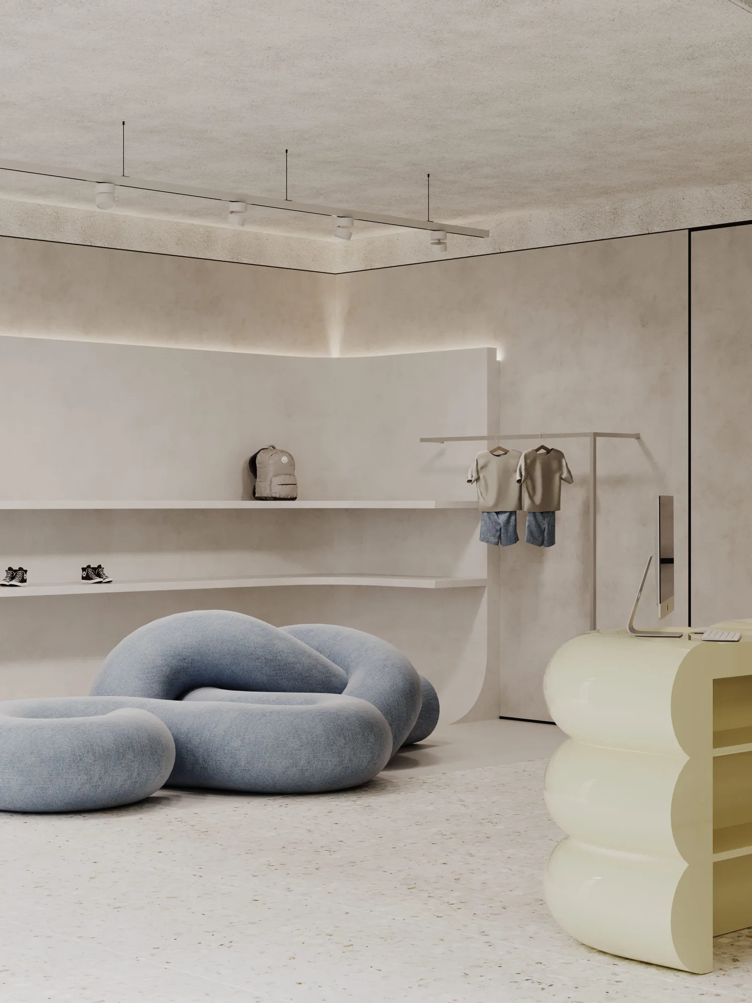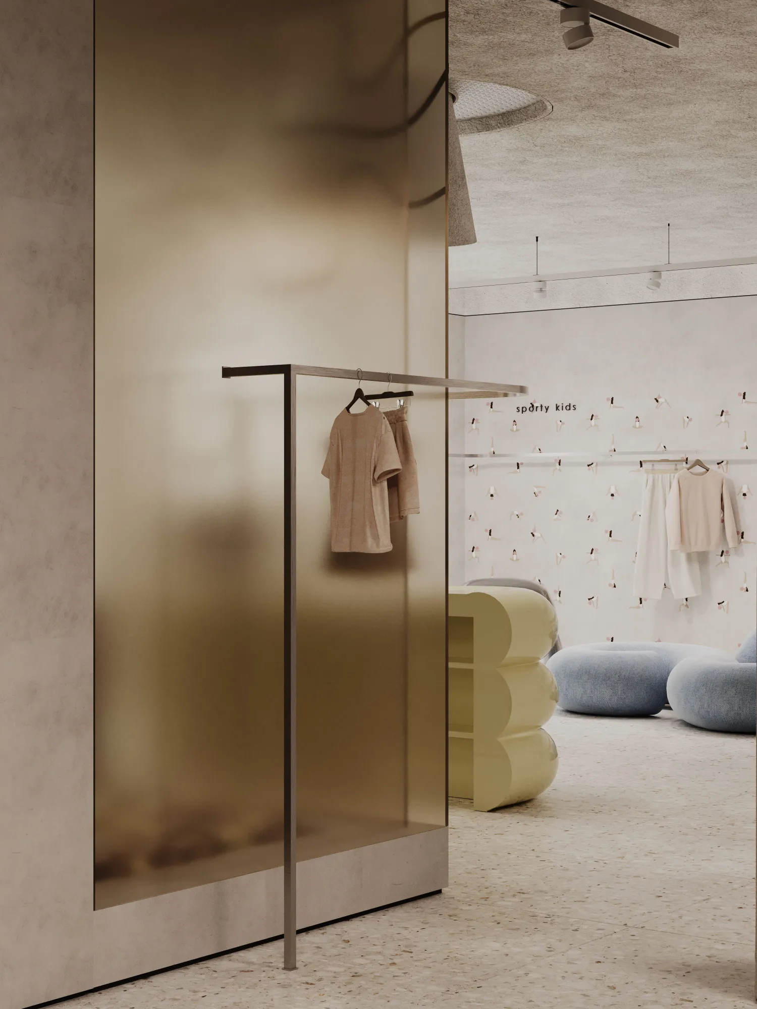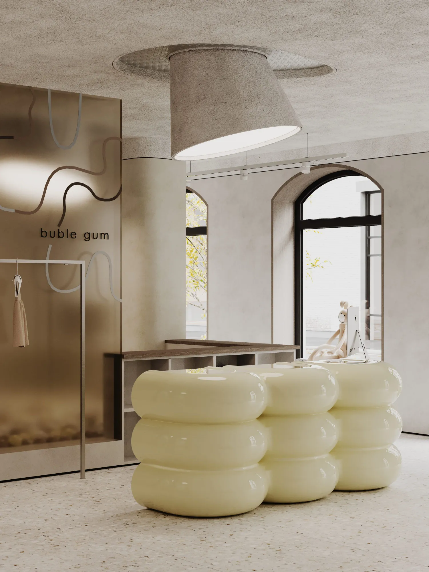 A playful project of a children's clothing store space in which the theme of chewing gum develops. The central place is occupied by the play area, which is associated with small chewing gum balls and where mothers can leave the smallest clienites while they choose clothes. Sofas of interesting shapes that resemble stretched chewing gum, or fabrics with a print of chewing gum. Metallized elements that resemble wrappers. The colors are selected accordingly. And once again, they emphasize the mood in the sportswear area, little gymnasts who inflate chewing gum bubbles.