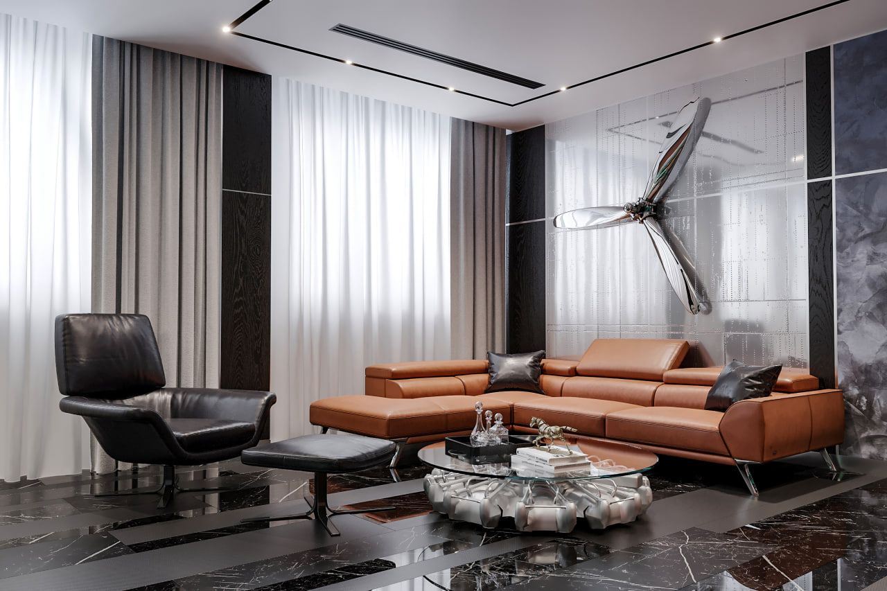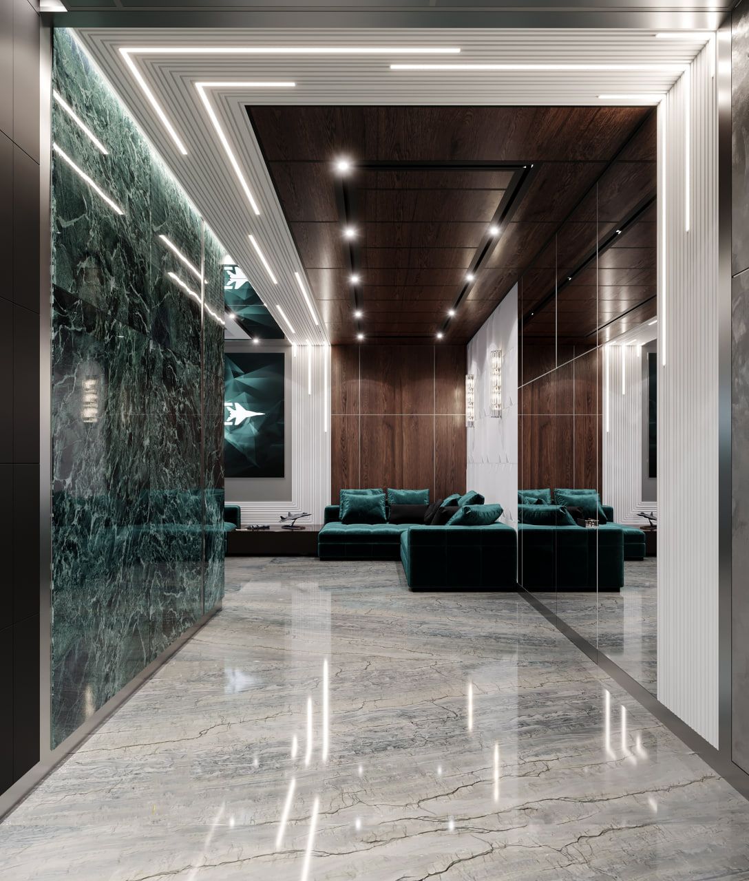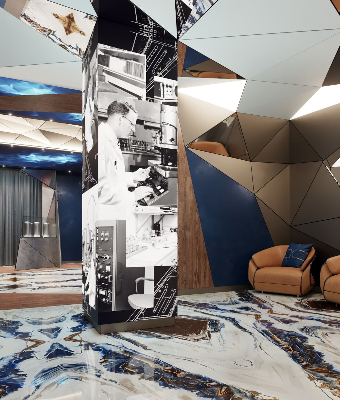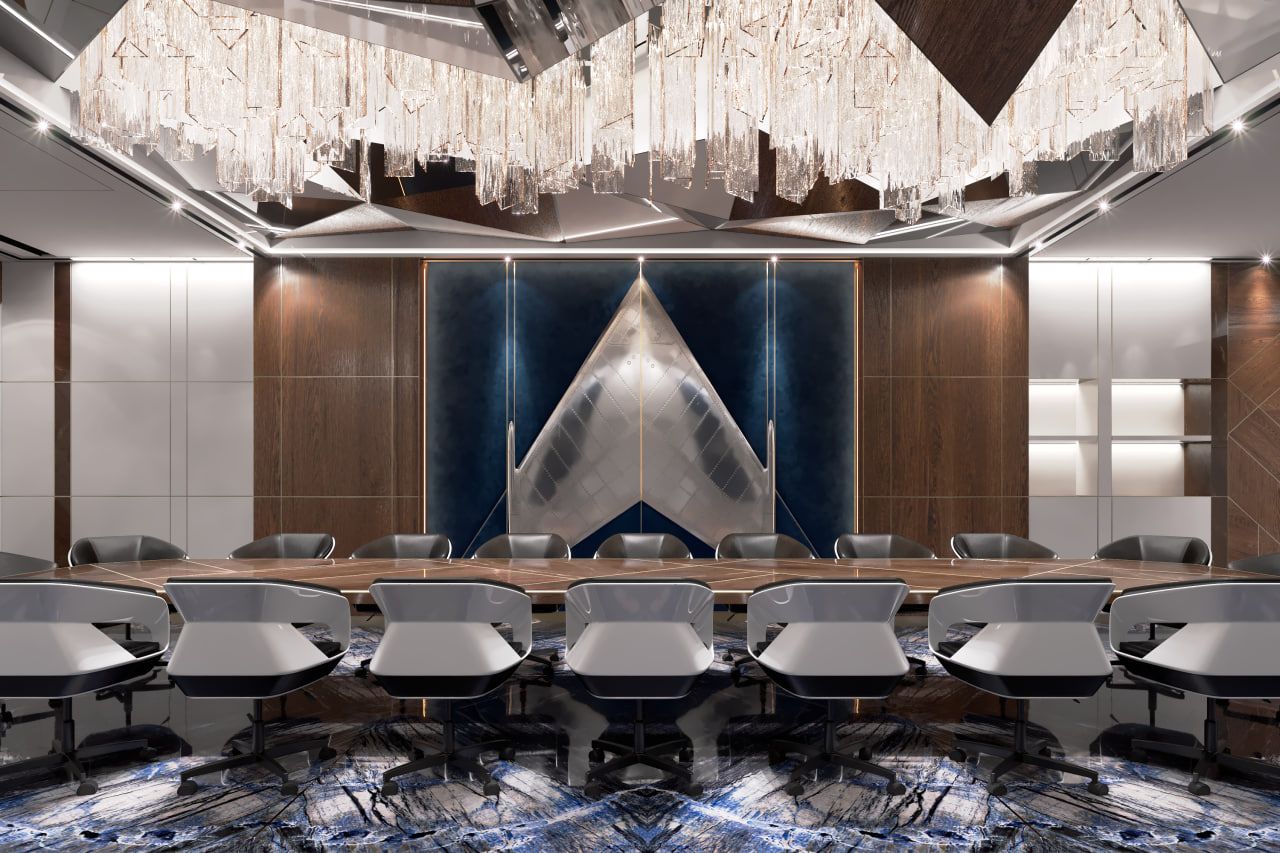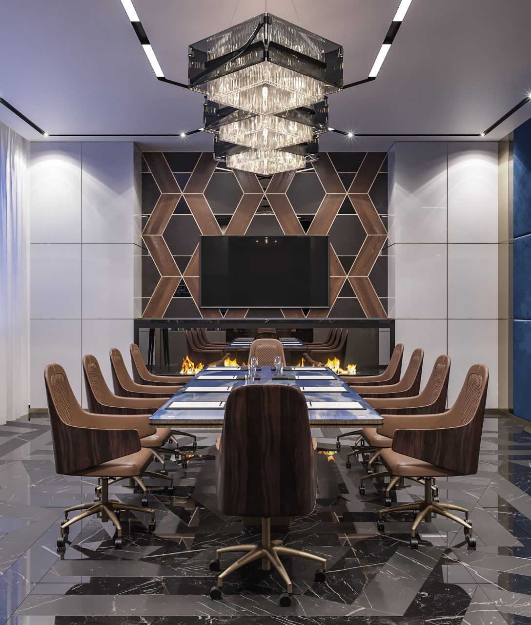 This office is not just a work environment. It is a manifesto of modern business, where architecture becomes a communication tool, and the design reflects the company's ambitions.4 floors, 8000 m² — a holistic space that combines prestige and functionality. The idea was to create an environment where the rigor of geometry meets the dynamics of light, the natural texture of materials — with technological accents.The first step in these interiors evokes a feeling of strength and stability, and the subsequent immersion reveals comfort, thoughtfulness and even coziness. Key areas of the project:Cabinets leaders — monumental tables, accent walls made of stone and art objects that emphasize the status and character of the space. Large and small meeting rooms are places for strategic decisions and daily meetings in which technology and design work on the only result.Hallways and corridors are real art installations, where the geometry of planes, mirrors and lighting create the effect of endless space.Kitchens and dining rooms are discreet, but with character; here wood, stone and bold colors create an environment for informal communications.Bathrooms are not just functional and conceptual; each stands out for its own style, from black marble to innovative sink shapes.This concept demonstrates that the office can be not only a place to work, but also a space of strength, inspiration and new possibilities.
