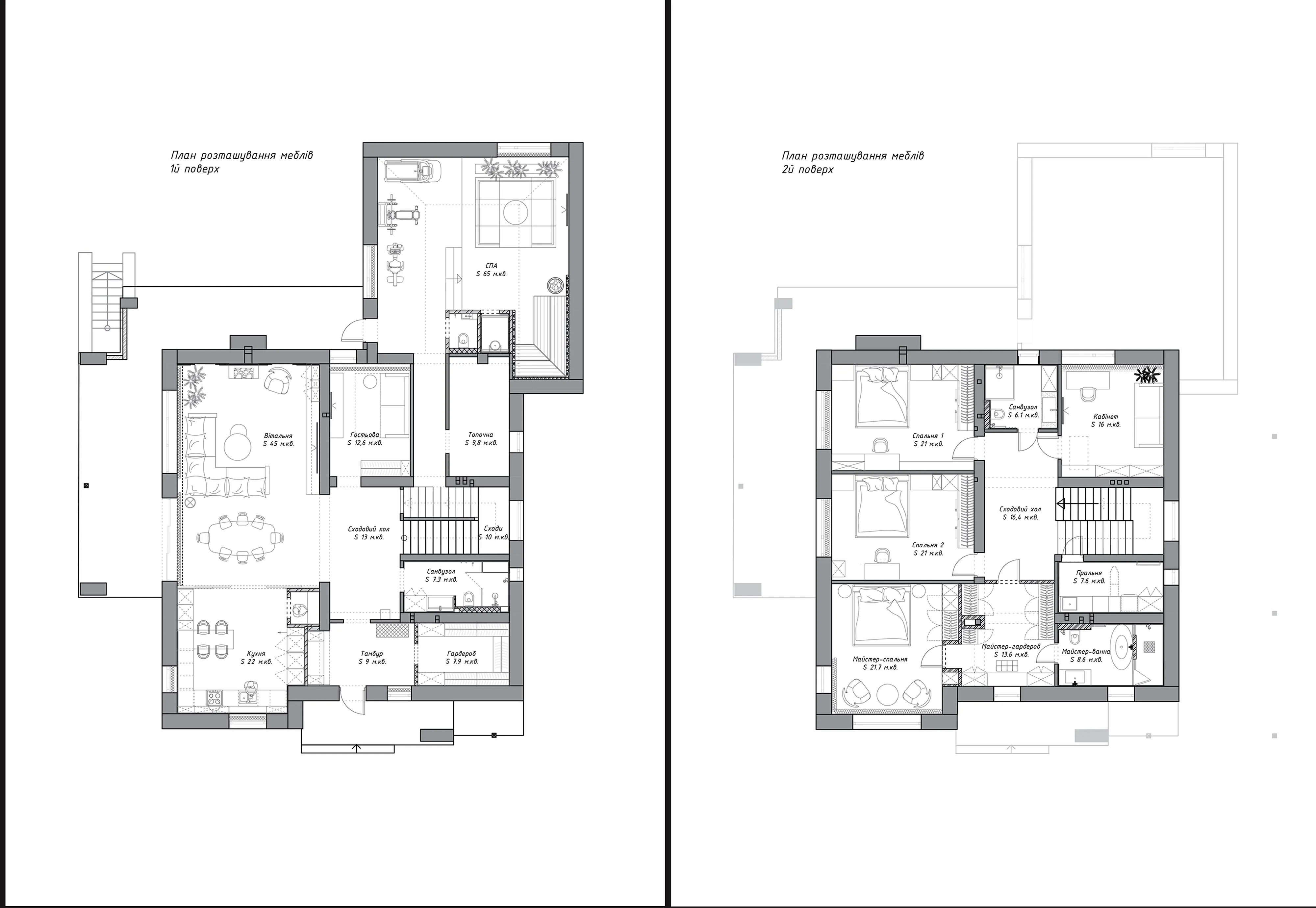There is an office and children's rooms with a separate bathroom, laundry and the main pride of the project is the master block. We rethought the layout so that each passage was logical and convenient: through the spacious dressing room you can get on the right into the bedroom with a panoramic window, and on the left into the bathroom with a freestanding bath and shower. The orientation of the bed in the bedroom allows you to wake up with a view of the pine trees outside the window.