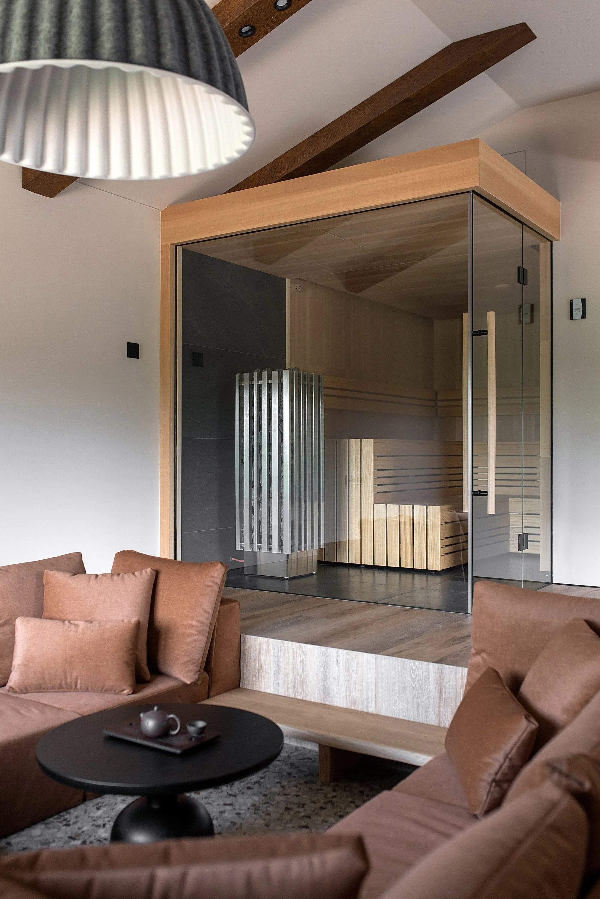 The first floor is an open area for communication. Kitchen-living room, guest room, bathroom — everything is permeated with light and an experienced warm palette. A separate unit has a spa area with sauna, lounge space and access to an outdoor eco-pool. This part of the project was completely redesigned: we raised the sauna to the podium, and in the niche that arose in the podium, we created space for a large sofa - a place to relax.
