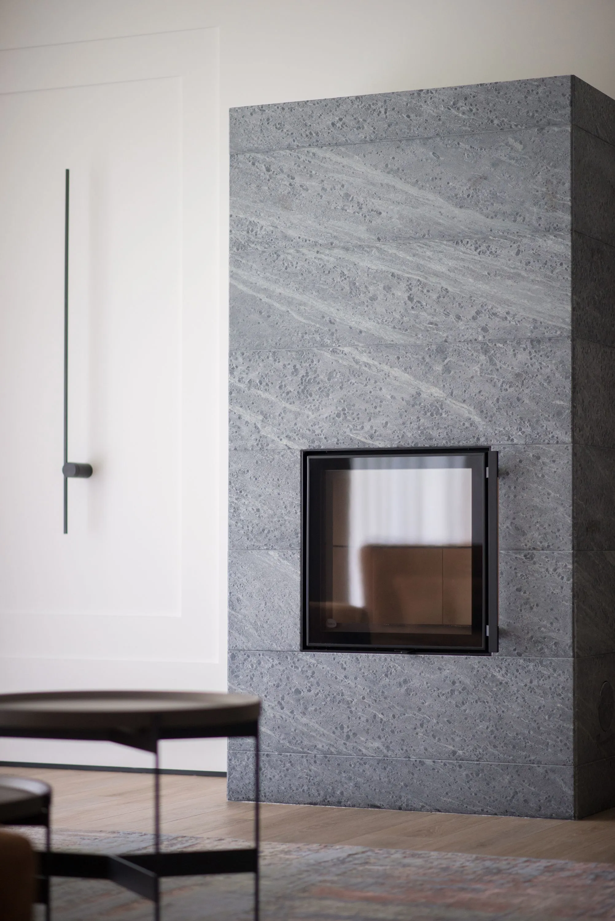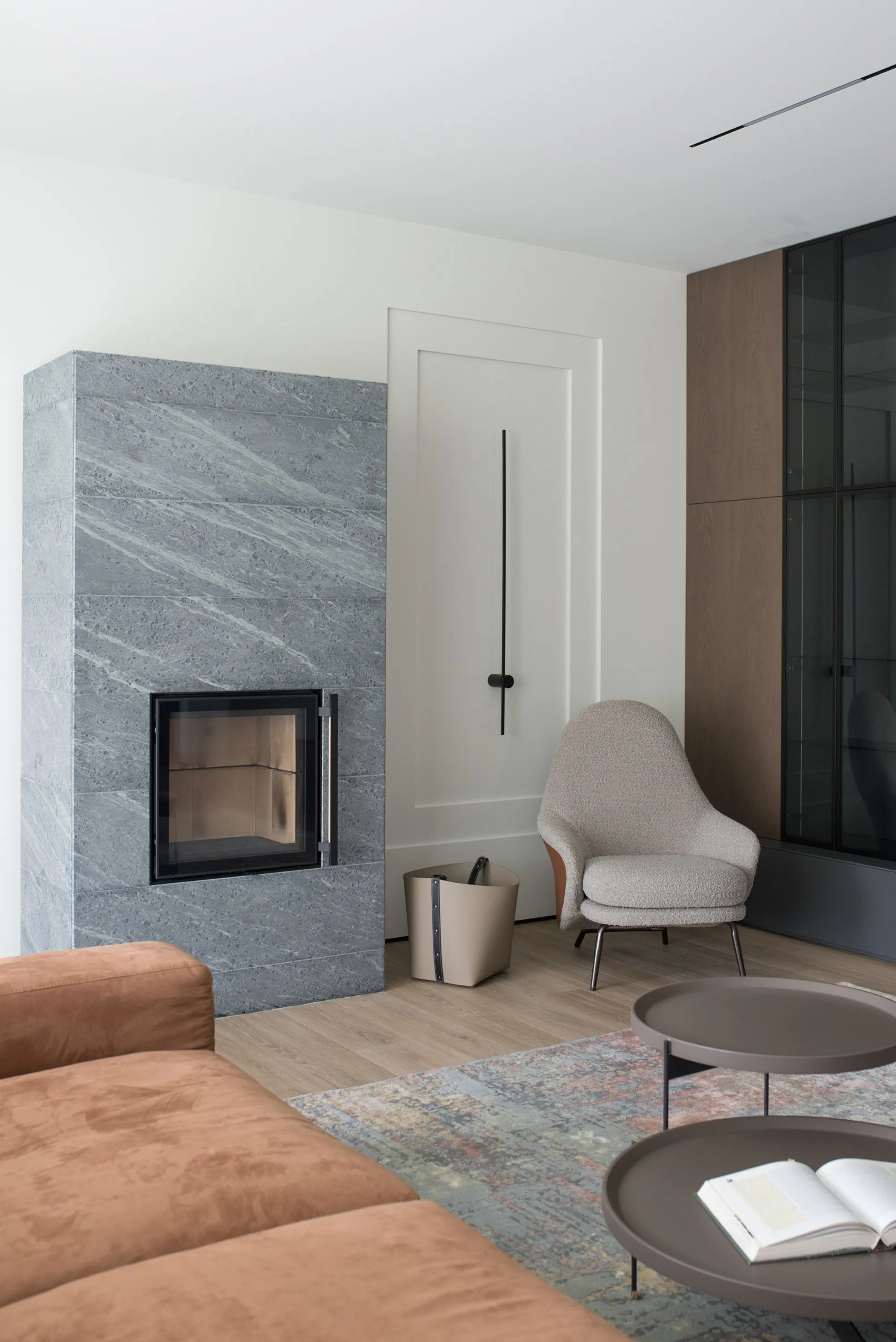 The starting point for the design was a fireplace made of soapstone — at the request of the Owner, it was to become the center of the interior. His choice was rational: the fireplace keeps the heat for a long time. However, it was this element that set the tone of the whole design — the natural texture of the stone, the feeling of strength and tranquility, deep “masculine” materials in a delicate combination. It was this game of opposites that formed the basis of the whole concept.