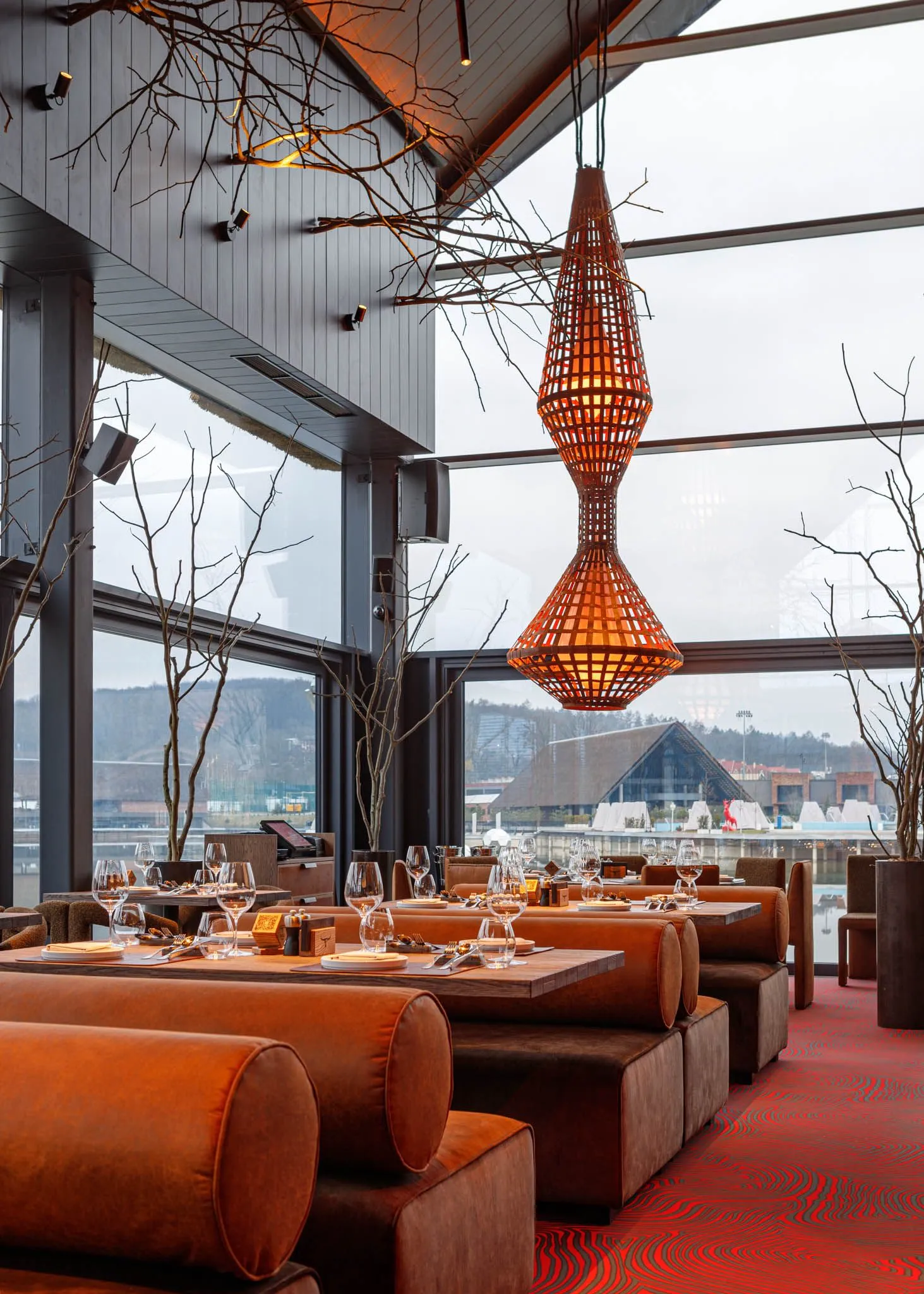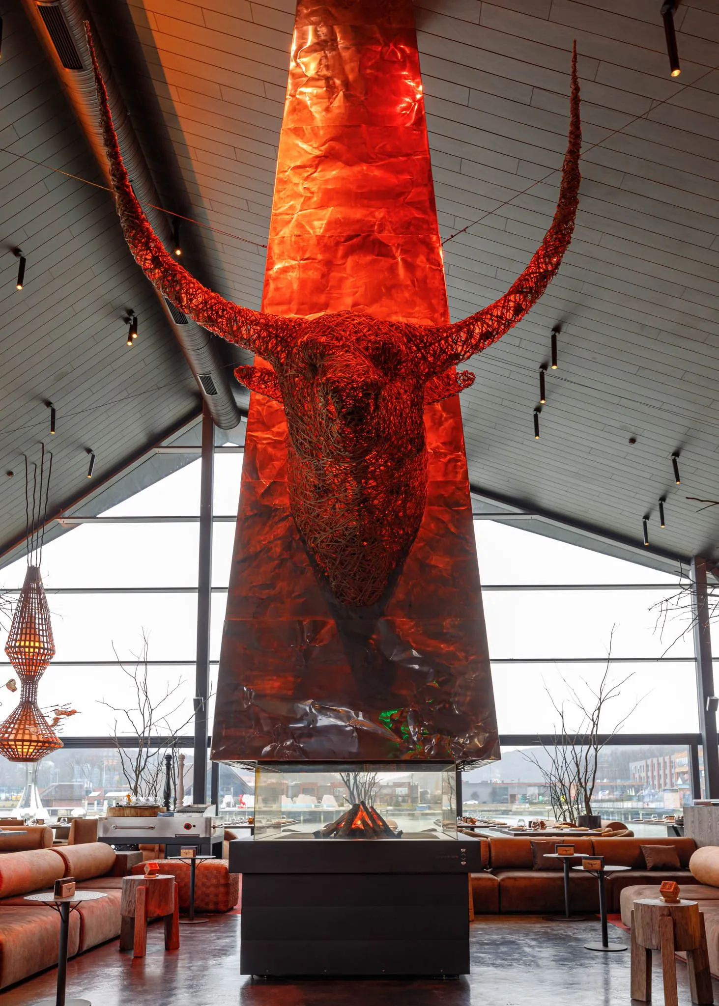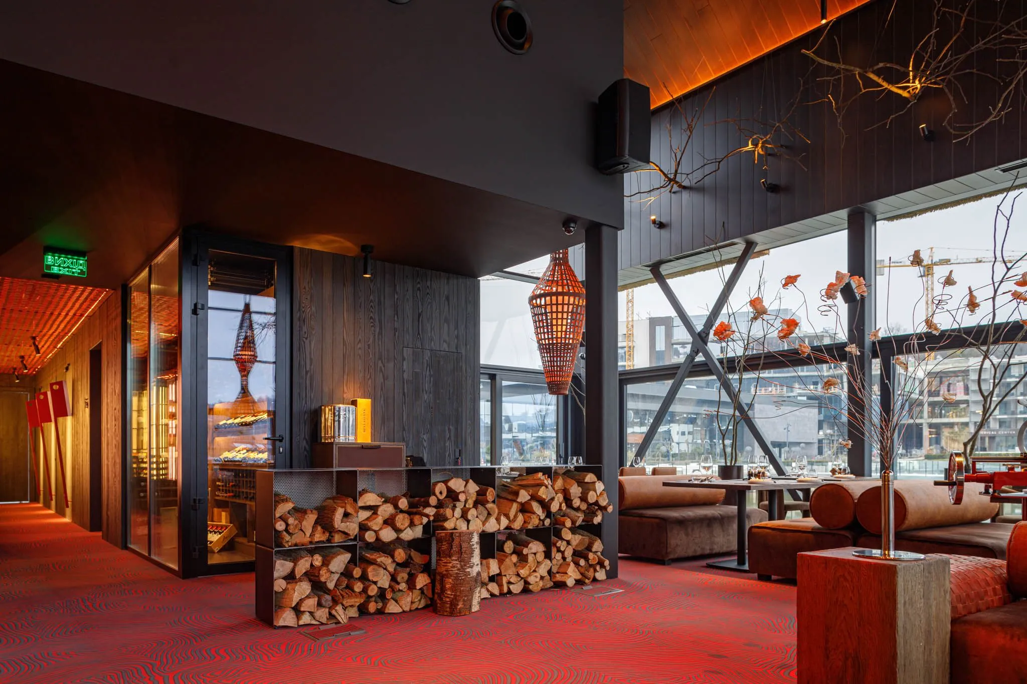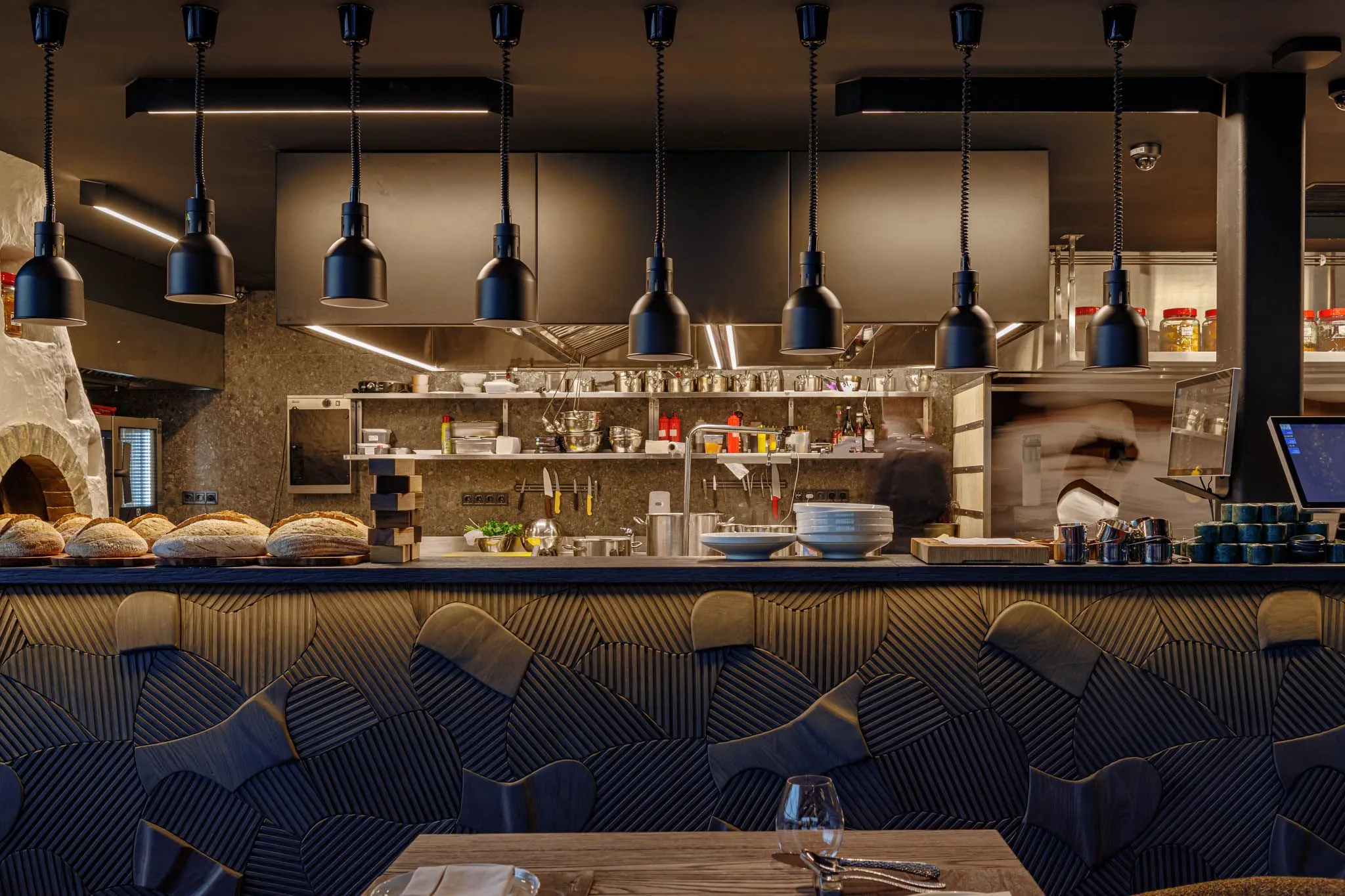The design of the restaurant is based on the principles of scale, openness and naturalness. Brutal wood, metal and stone structures emphasize the monumentality of the space, and the restaurant's location on the water adds lightness and elegance to it. The open kitchen is a key element of the concept — it is a living center where you can observe the process of creating dishes, which becomes part of the overall emotional experience.