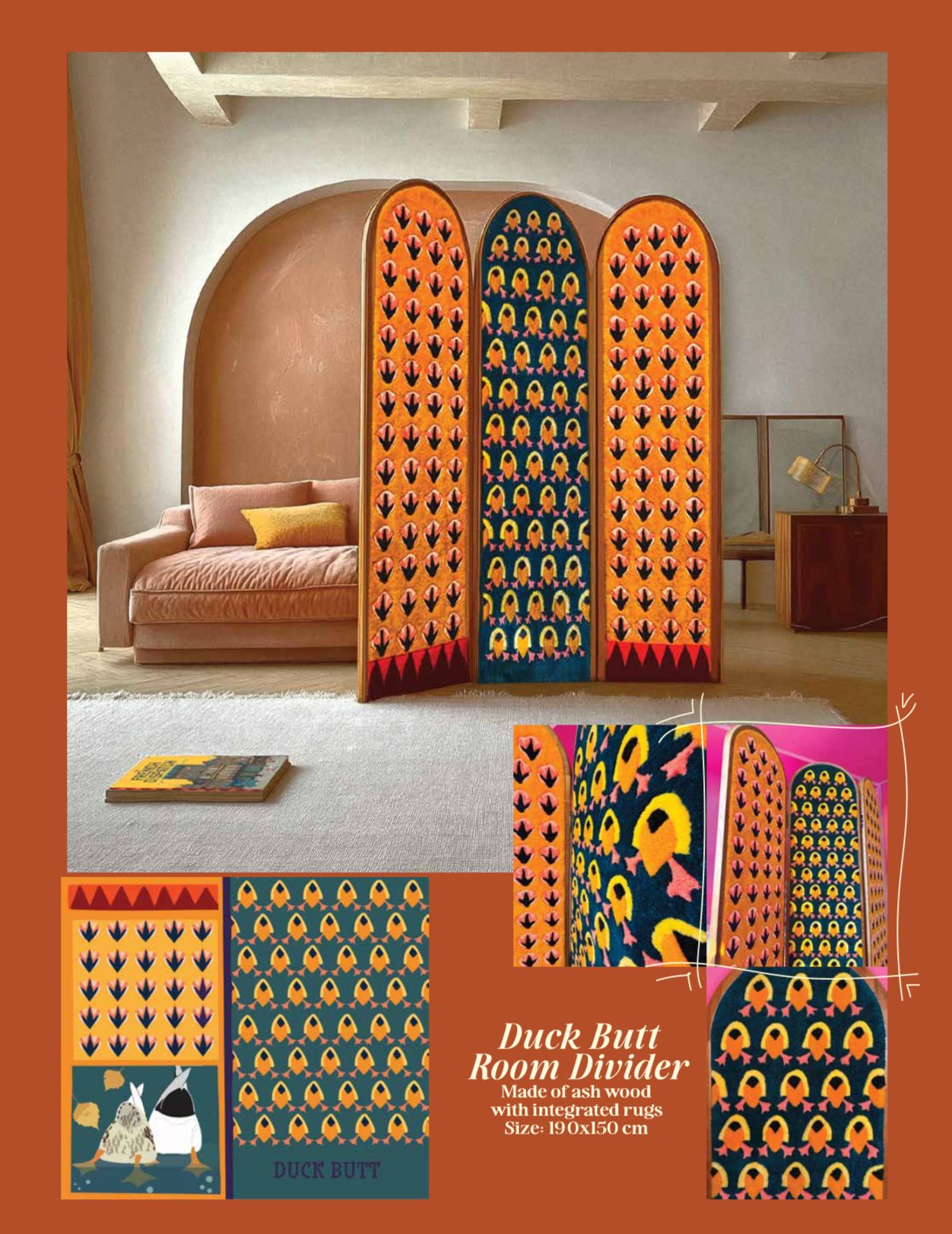 Ironic, functional and visually recognizable, this interior screen combines natural ash and handmade carpet inserts to form a story composition of duck silhouettes (paws and asses). The center of attention is the stylized duck butts - as a playful gesture towards strict subject design.