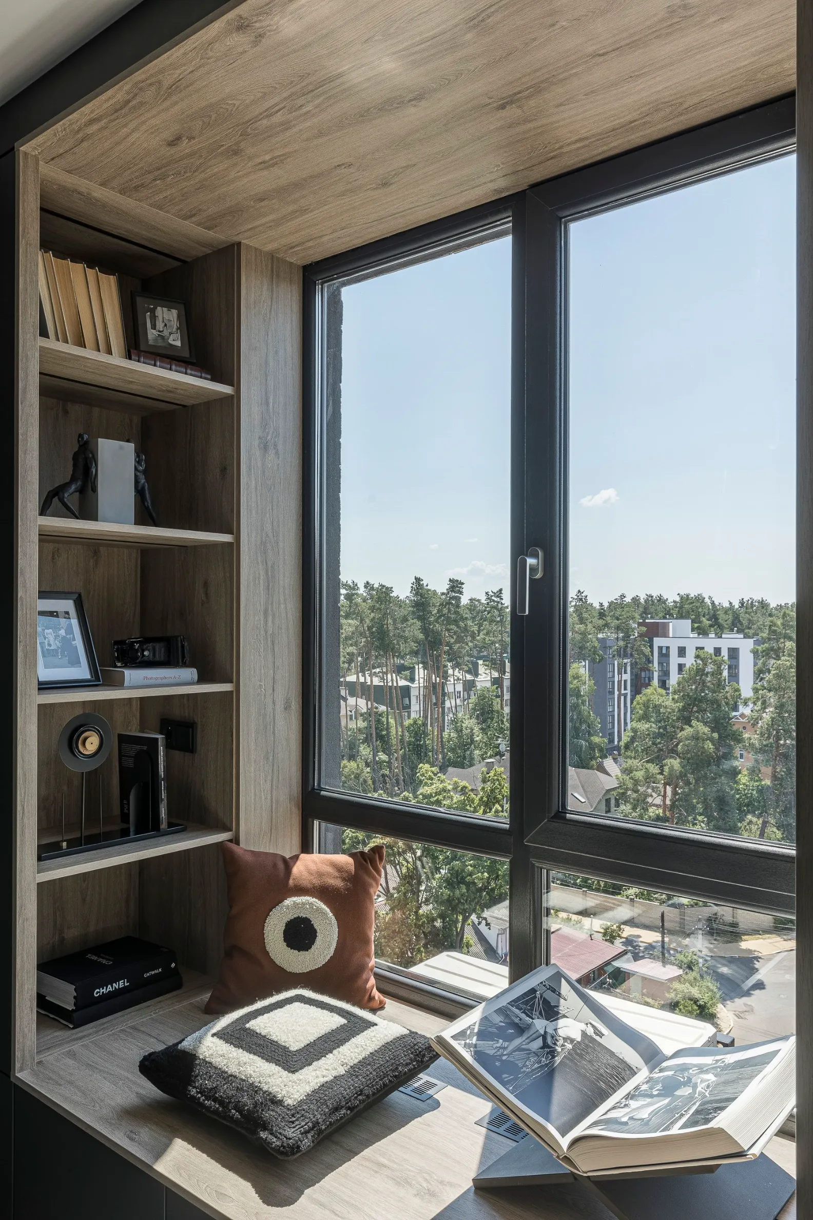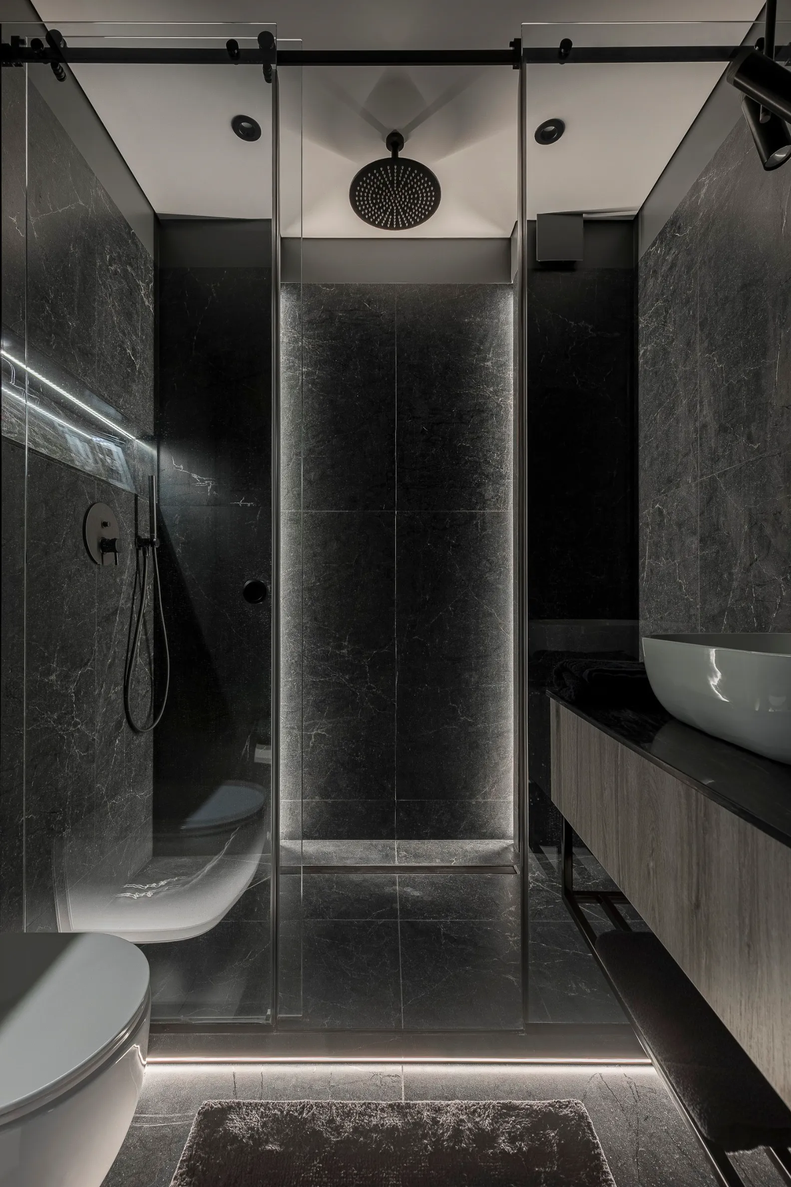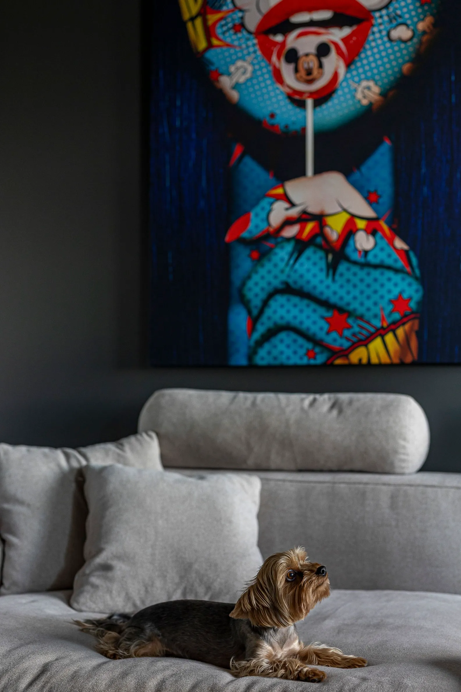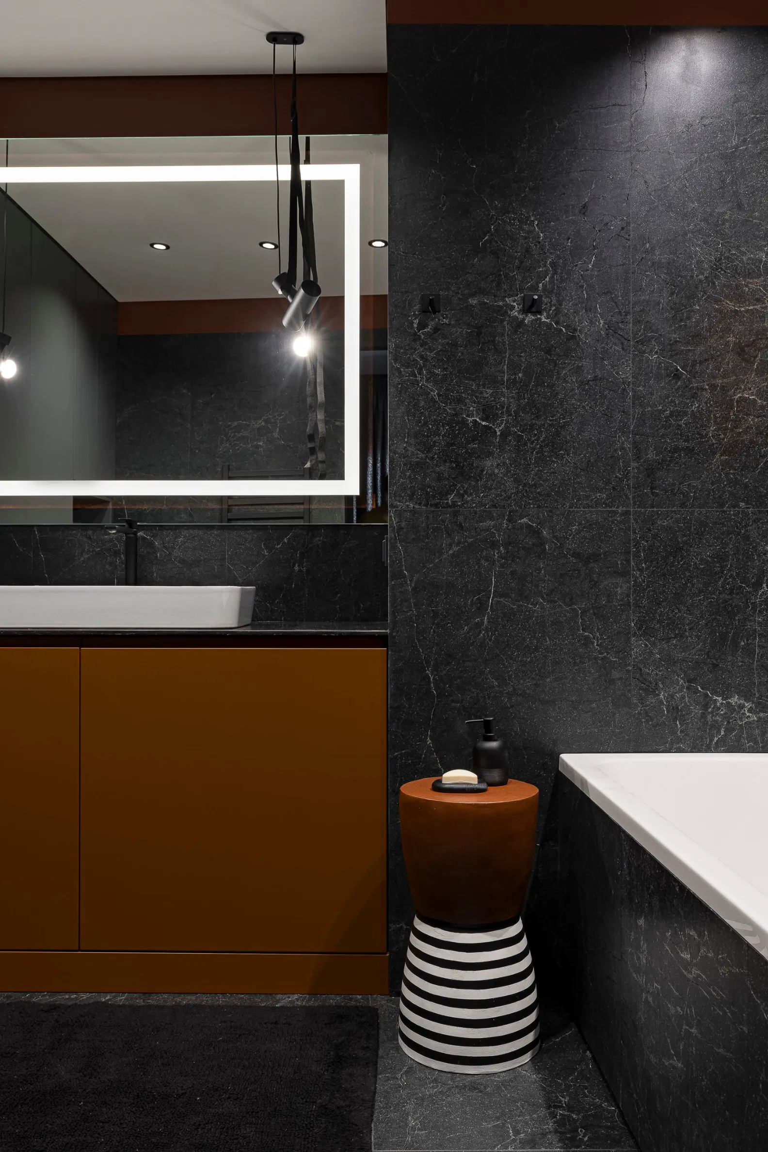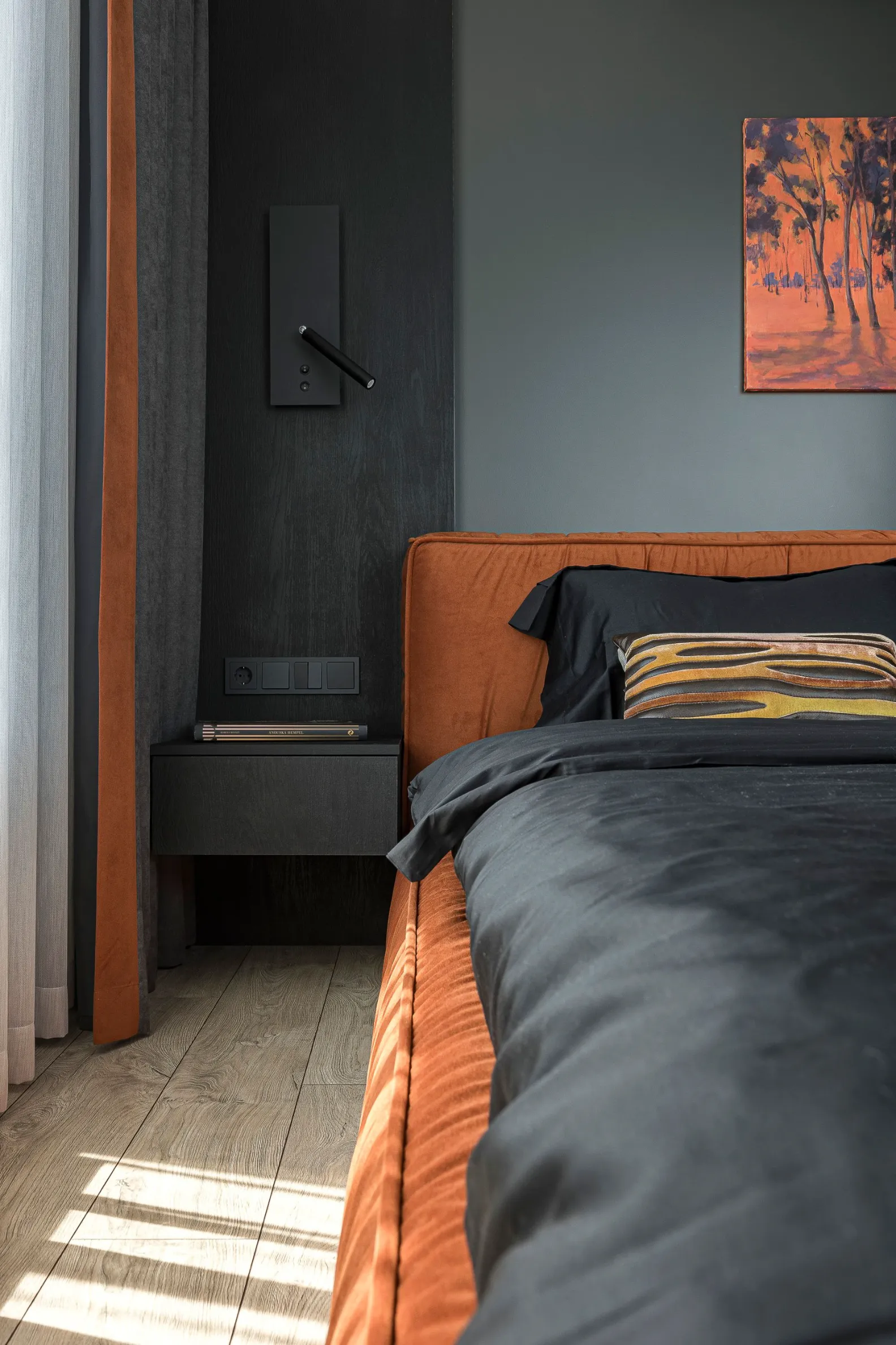 A special wish is to make a comfortable space -master-bedroom. Due to the redevelopment, we managed to enlarge the bathroom, organize a comfortable dressing room and a cozy bedroom. In the living room there was a fireplace and a large TV area for pleasant meetings and watching your favorite movies. The office is organized not only for work, but also for comfortable contemplation and immersion with your favorite book in a soft corner arranged near the window. On the open terrace you can not only relax, but also have a barbecue party. Of course, in the interior one of the main places is occupied by art. The living room used the French poster Brand New from Eyefood Factory, which adds a touch of brightness and uniqueness to the space. In the bedroom, the painting “Dawn” by the local artist Svetlana Lodina adds comfort and tranquility, but in the bathroom, the painting from this artist brings intrigue. Thanks to the high doors and baseboards of concealed installation, straight and simple furniture, we managed to create a modern and comfortable interior.