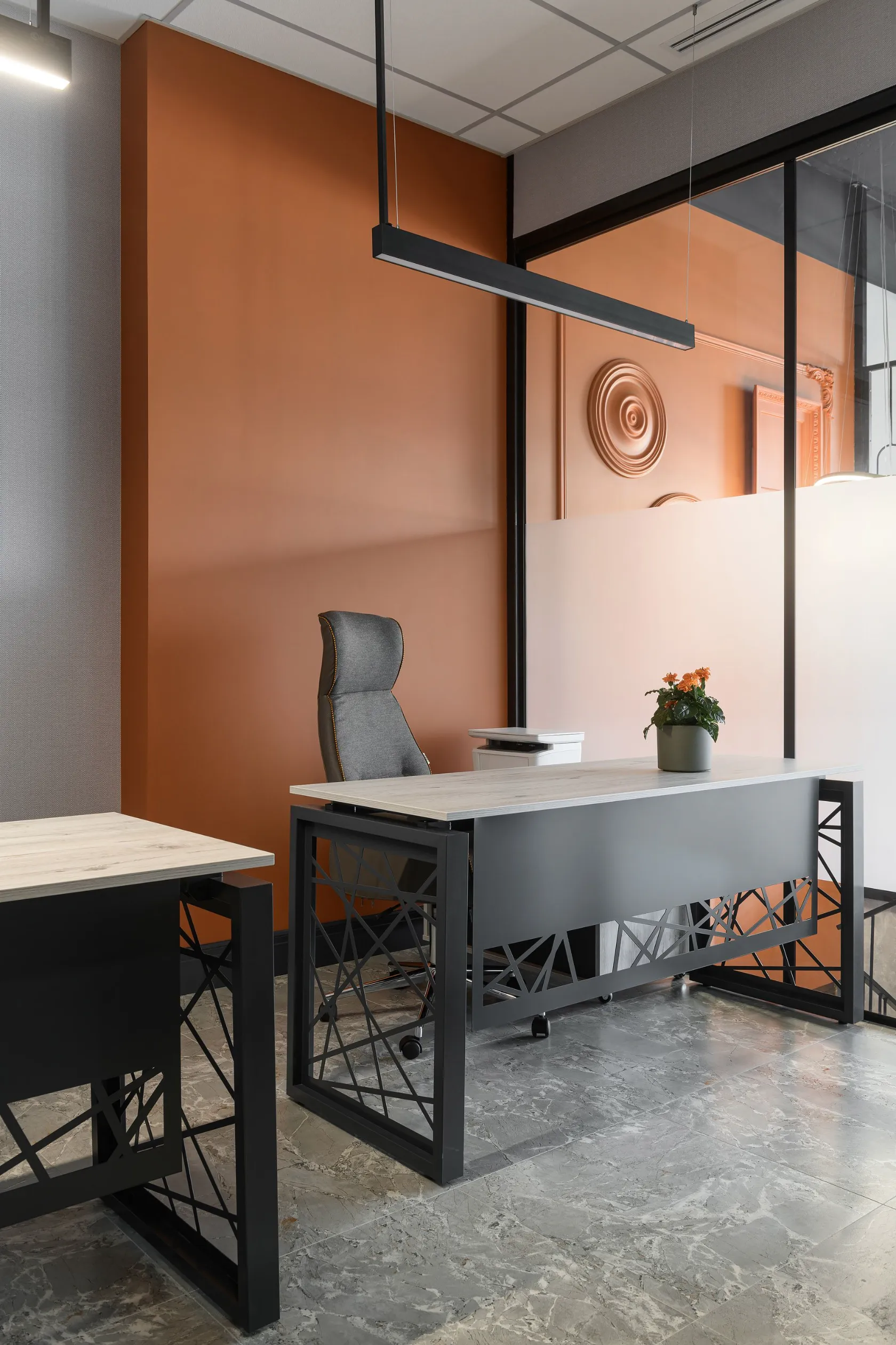 The design and decoration are based on the use of modern materials. Ceramic tiles, glass and metal were used for decoration of walls and floors. The membranes between the offices are made of glass, which preserves the openness of the space and provides privacy.