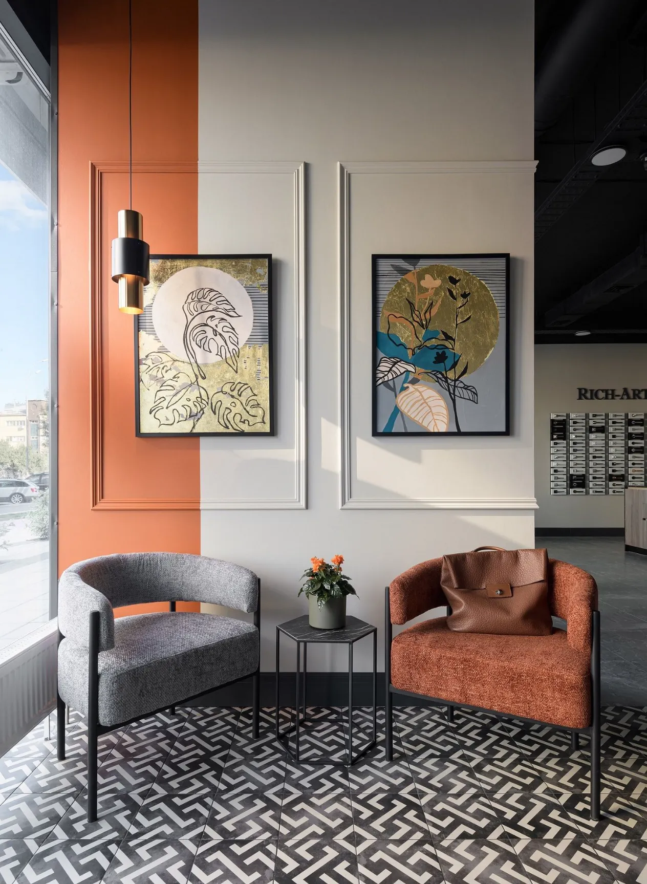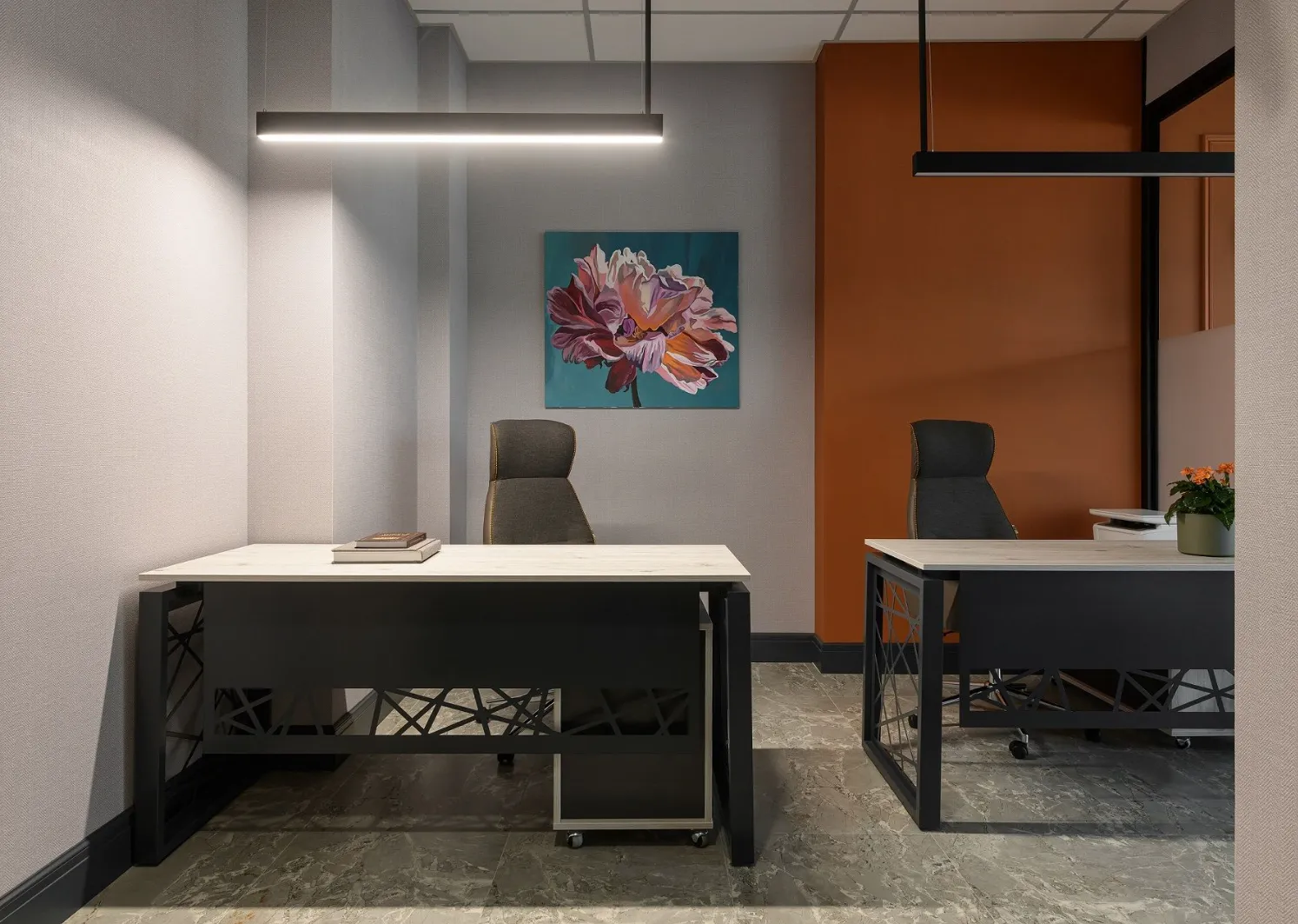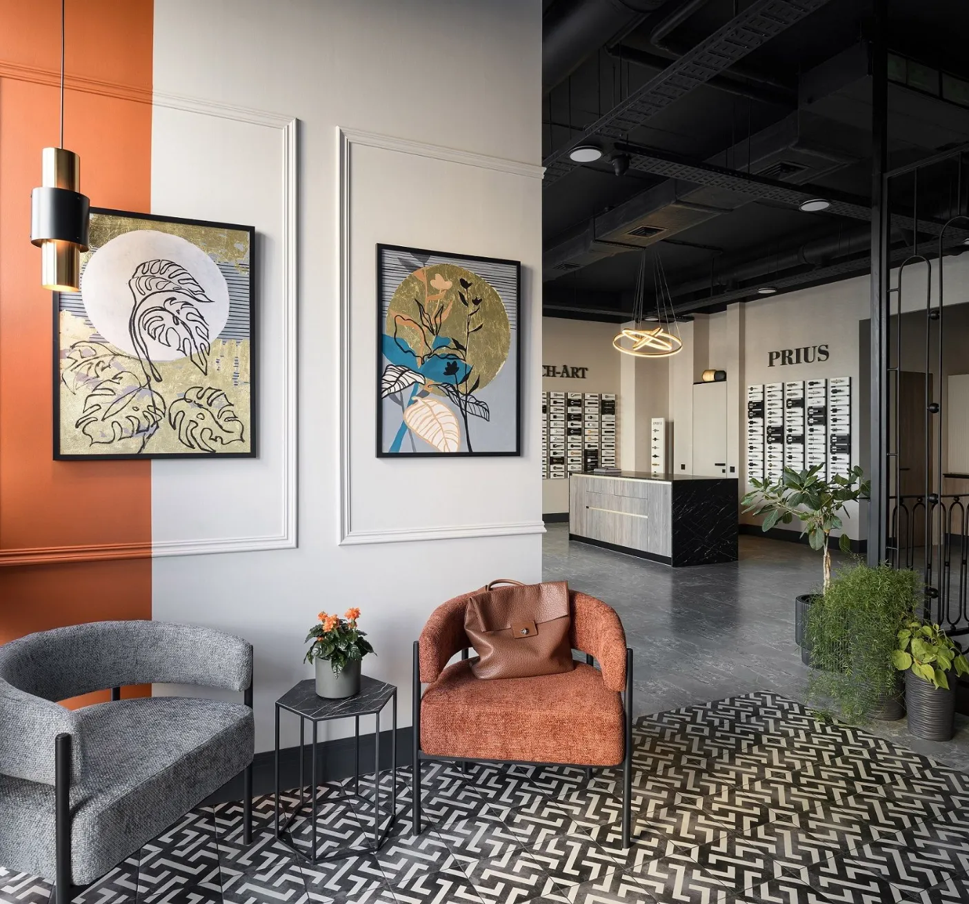 The interior uses paintings by Anastasia Putilovskaya, which add brightness and special charm, creating the uniqueness of the space. The flowers in the picture in the manager's office and near the entrance group seem to come to life, and create a harmonious connection with the overall aesthetics of the office. And the works hung in the hall meet guests adding personality to the space. It is a great combination of art and design.