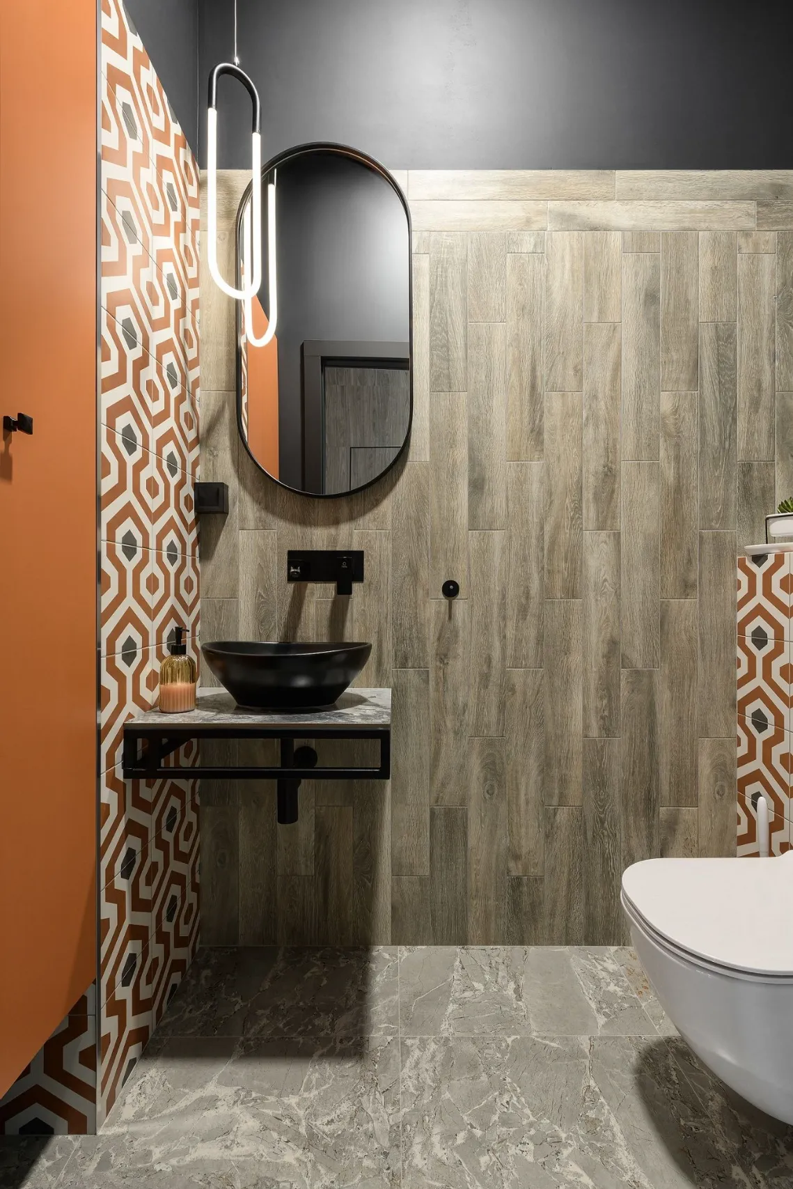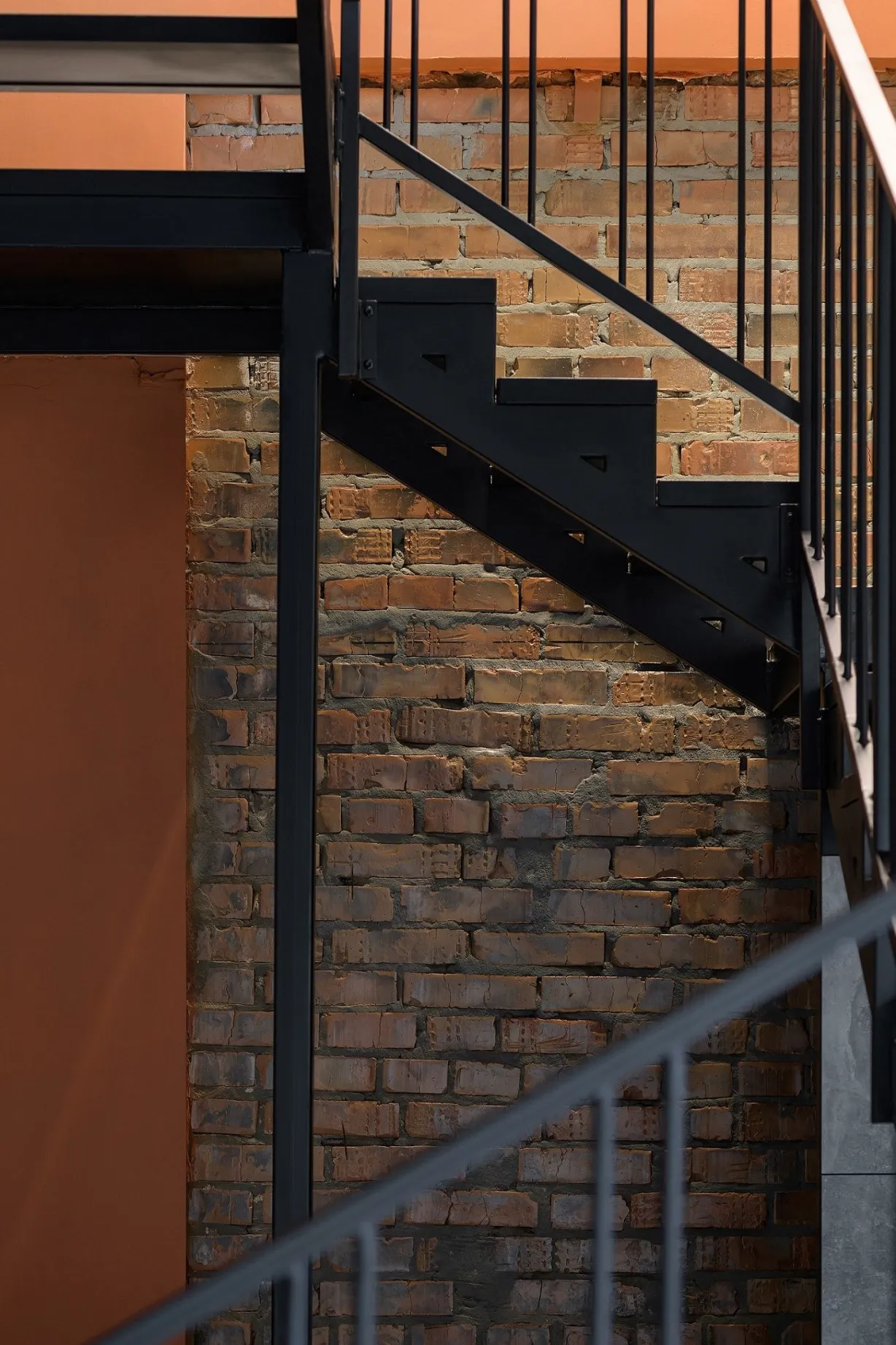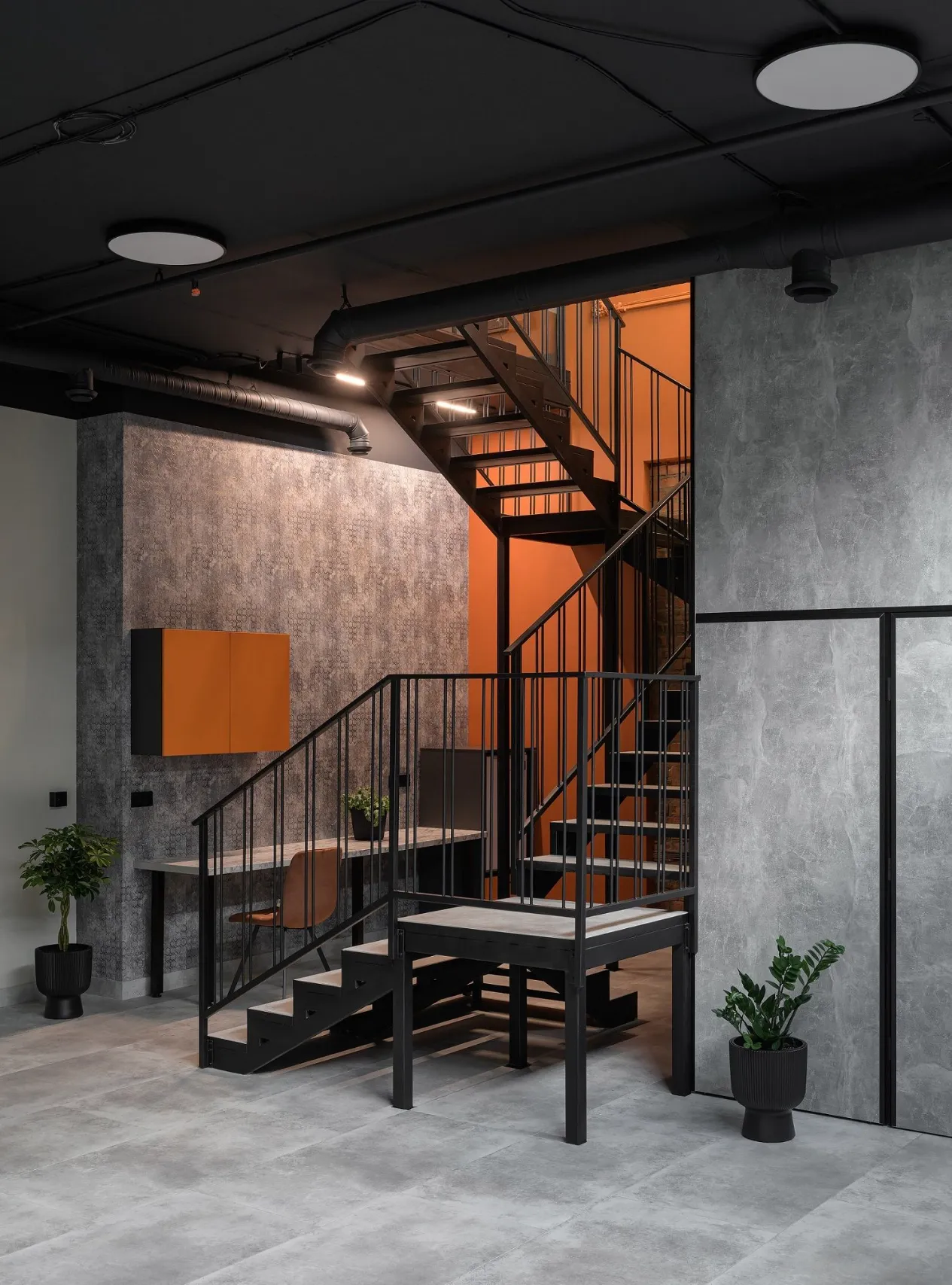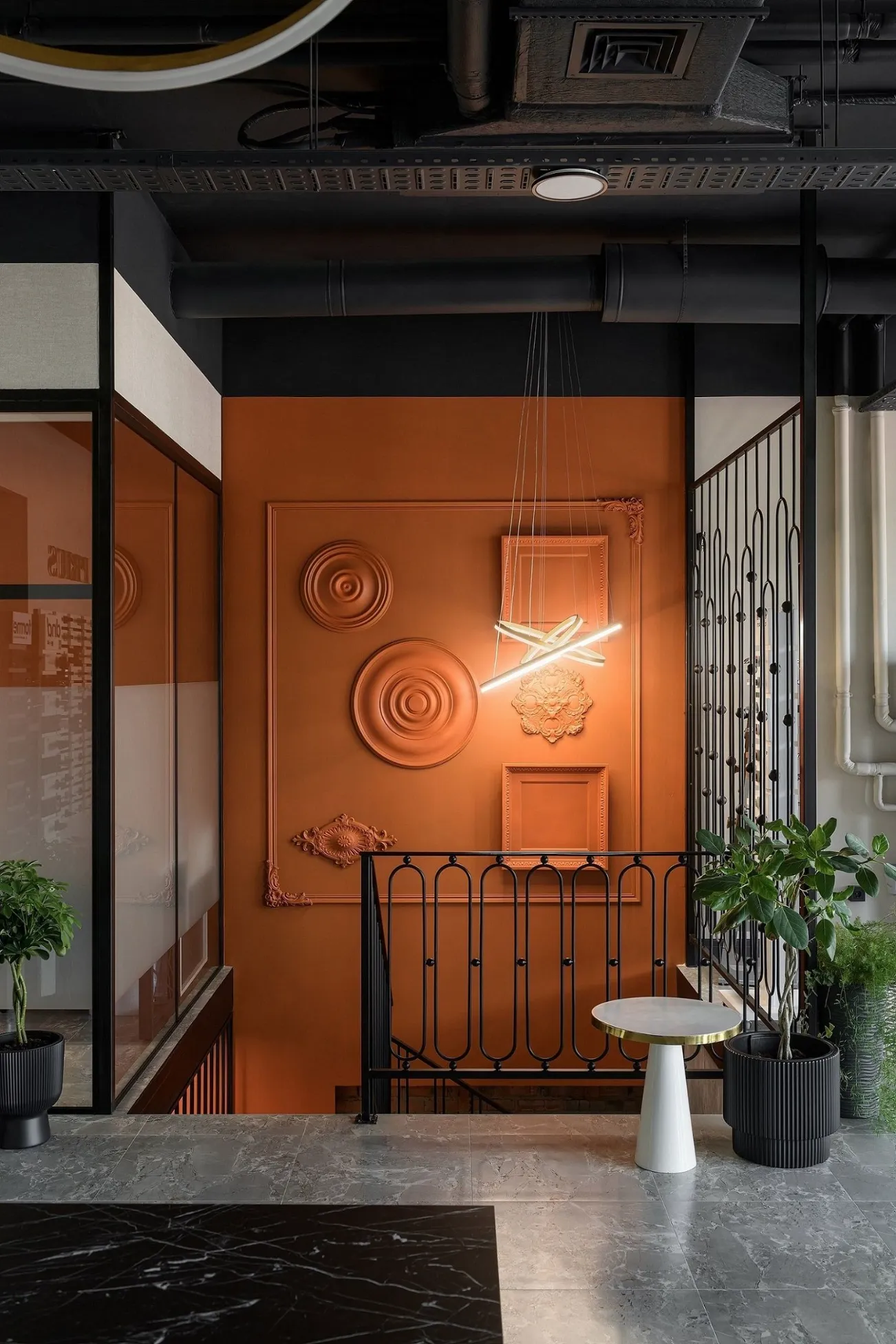 To illuminate the office, pendant lamps, spotlights and LED lamps of the brand “Svitoket” were used, which made the interior very modern. The color palette includes light and neutral shades to emphasize the space and visually enlarge the rooms. Terracotta color is the accent. The use of stucco elements and metal products in graphite color as accents, gave the interior a sense of graphics and a sense of status. Stairs connecting floors are made of metal and have a complex configuration, but look easy and transparent. Handrails with an interesting pattern add softness to the rigid lines of the metal structure.