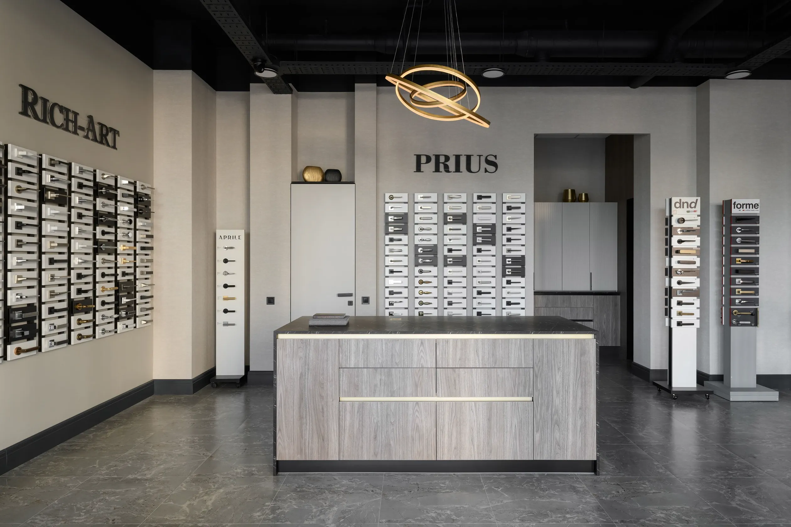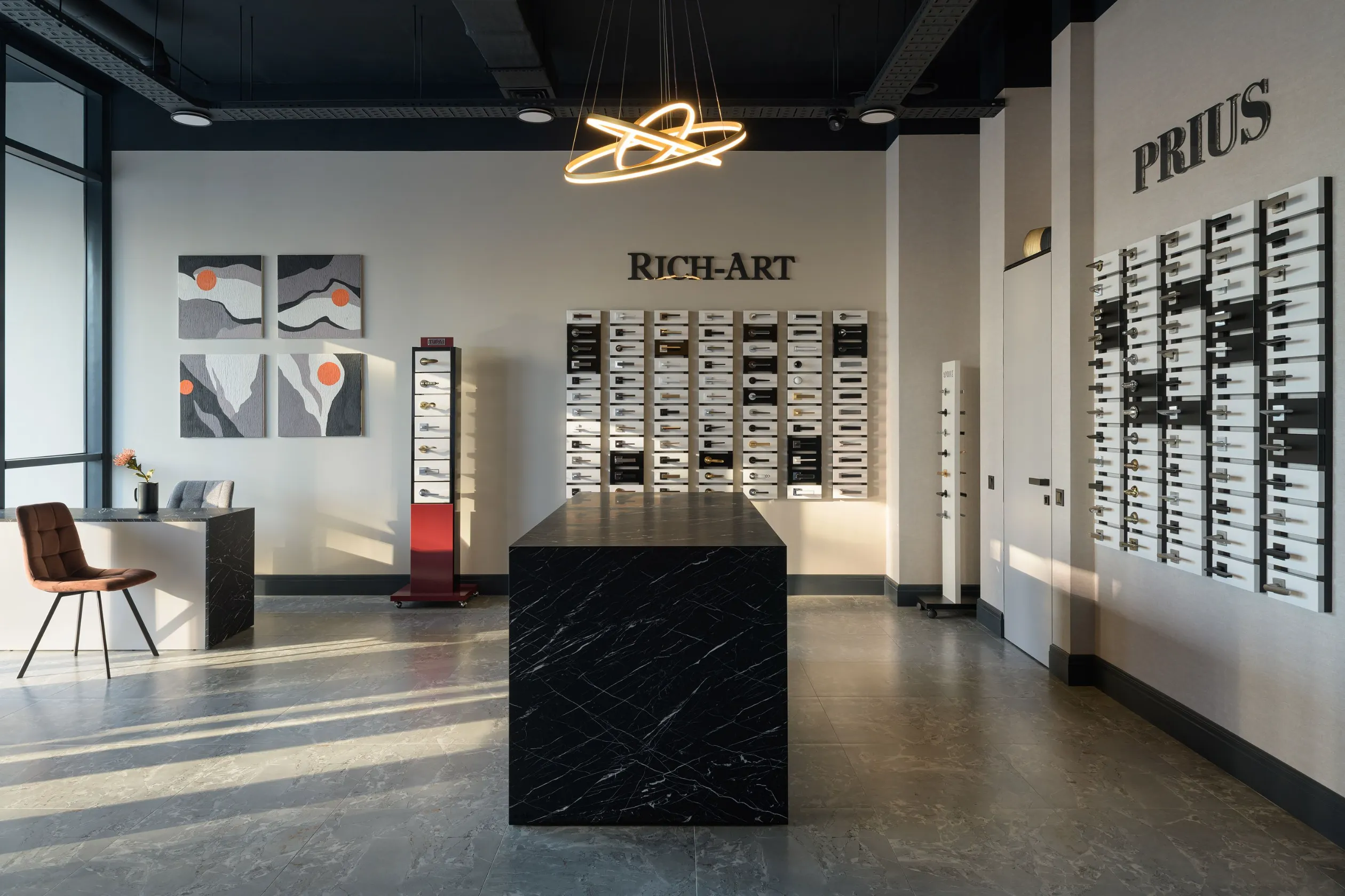 An office that deals with door fittings needs an organized and functional space. The convenient location of the stands around the perimeter of the room allows employees to quickly and easily display samples, which ensures efficient operation and quality customer service. It also facilitates the process of selecting items for each specific order. The harmonious combination of this functional purpose with the aesthetics of the office is essential to create a comfortable working environment.