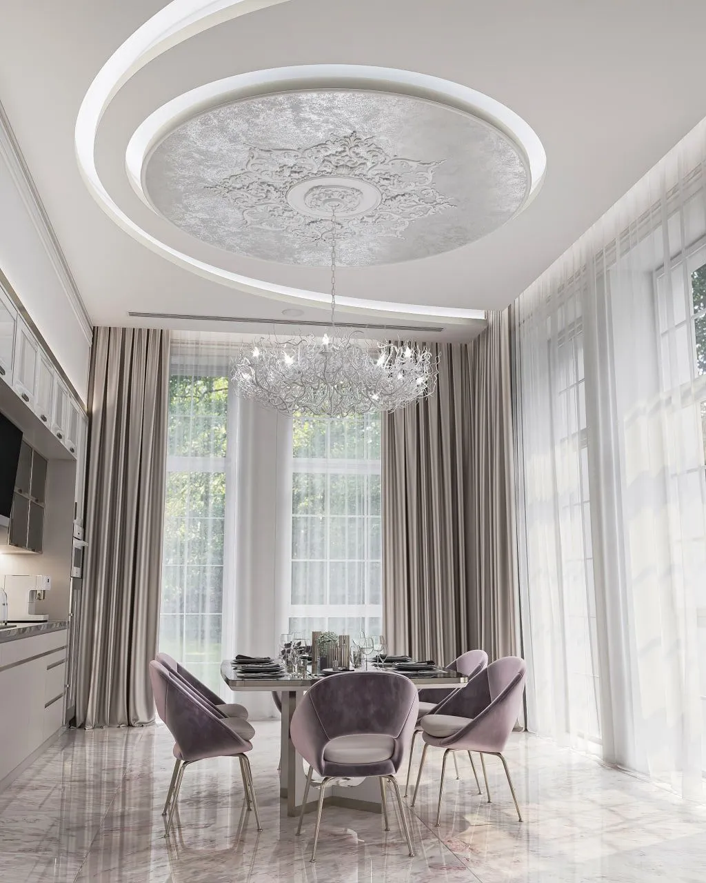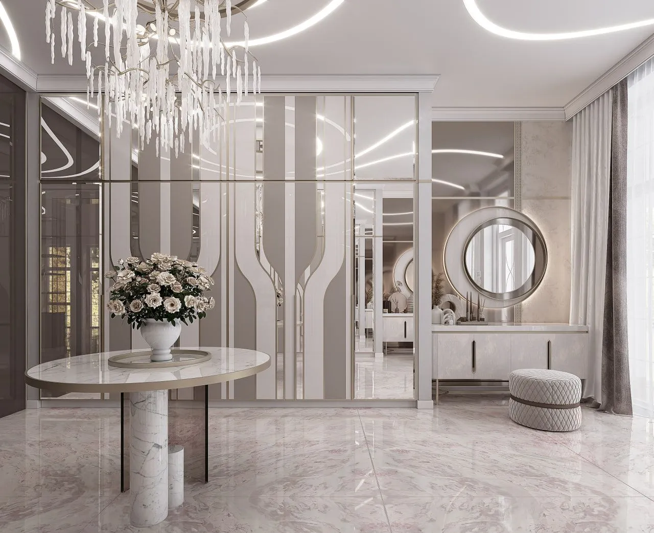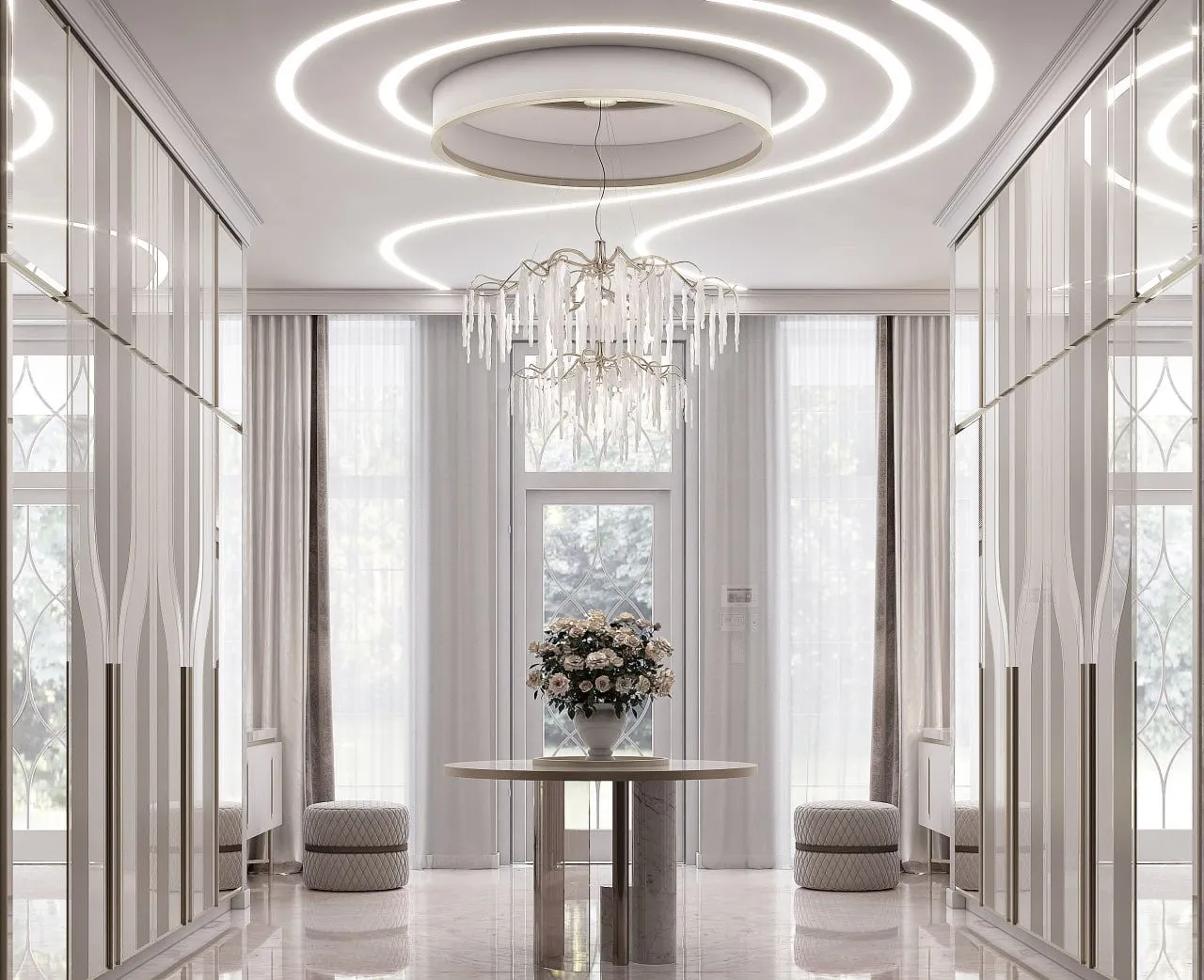 This concept of a private house of 760 m² was an attempt to reimagine classic elegance in a modern way. The project demonstrates the synthesis of exquisite decorativeness and the latest design solutions, creating a space where luxury is combined with lightness and light. The key concept is to create a living space that radiates purity, light and aristocratic tranquility. The interior plunges into the atmosphere of luxury without excessive pomp: a white palette with shades of silver and mother-of-pearl, mirror surfaces, noble stone and elegant textures. The main bedroom is made in an almost monochrome white-silver gamut, where textiles and light play the main role. A bed with a high soft headboard, drapery made of heavy fabrics, cascading lamps with metal chains create the feeling of a theatrical scene. Mirror inserts on the walls and ceiling visually double the space, enhancing the effect of radiance. The bathrooms are solved in solemn materials: marble surfaces, panels with stone patterns and mosaic accents. A separate bathroom area with large arched windows turns into a place of relaxation with a view of the garden. The combination of cream tones, deep chocolate marble and crystal lamps creates a spa atmosphere. The center of the space was the dining room with high windows, marble floors and expressive ceiling decor. Round and oval shapes in the ceiling, crystal chandeliers and light velvet chairs in pastel lilac shade emphasize elegance. A showcase wall with decorative elements and an aquarium make the interior lively, adding dynamics. The spacious hall is decorated with mirror panels and decorative inserts made of metal and glass. Light circles on the ceiling create a sense of infinity and movement, emphasizing the scale of the space. The dressing rooms are designed as galleries of light and reflections, where functionality borders on art installation. Light scenarios have become a key tool in this project. Built-in linear lamps, cascading chandeliers, decorative lights create multilayeredness and depth, emphasizing textures and architecture. The decor is based on the play of reflections, the shine of glass and polished metal. This concept of a private home demonstrates how contemporary design can interpret classical motifs, creating interiors that resemble palace halls, but at the same time remain comfortable to live in. It is an example of a bold experiment with materials, light and scale, showing new horizons for luxury in the private home.