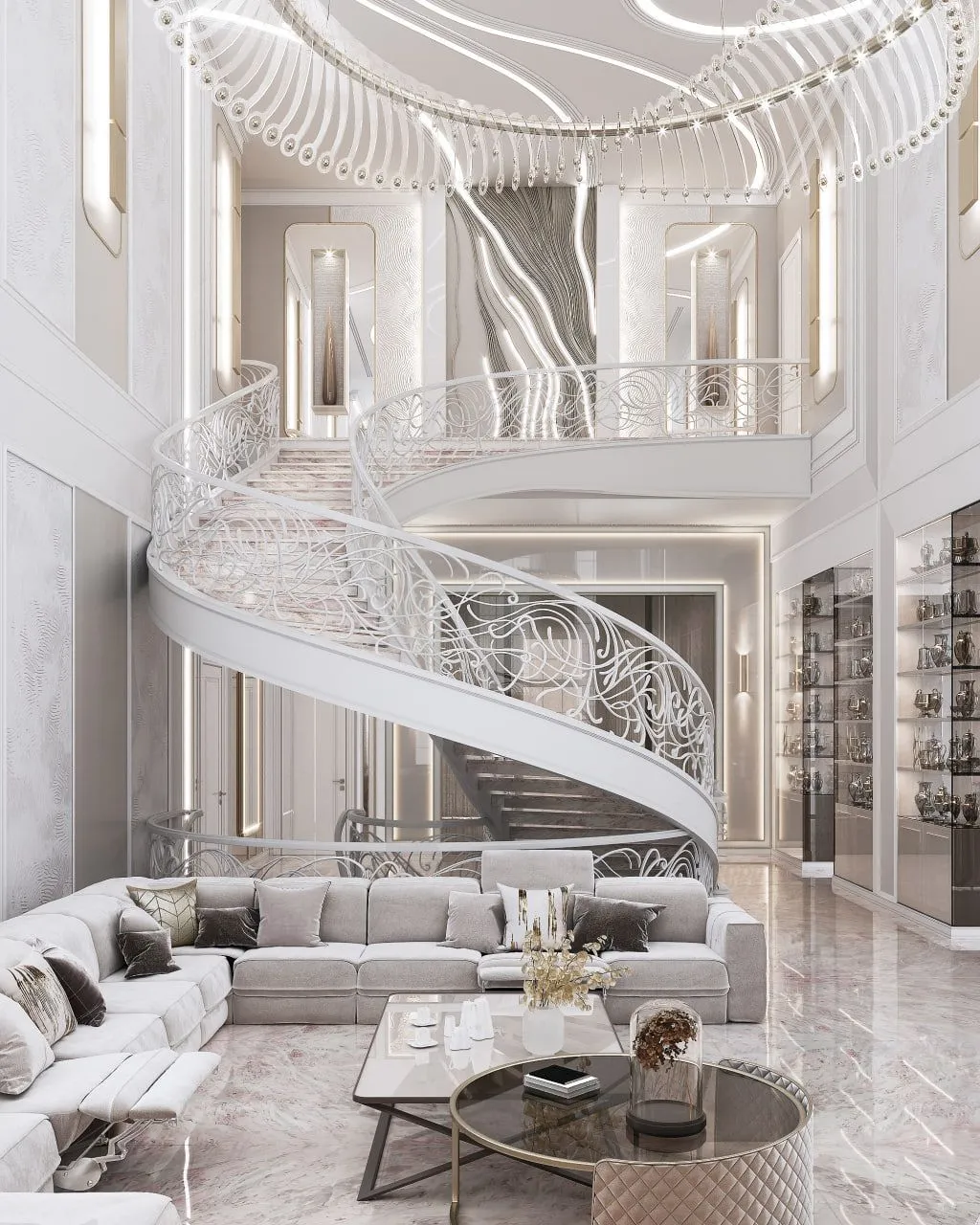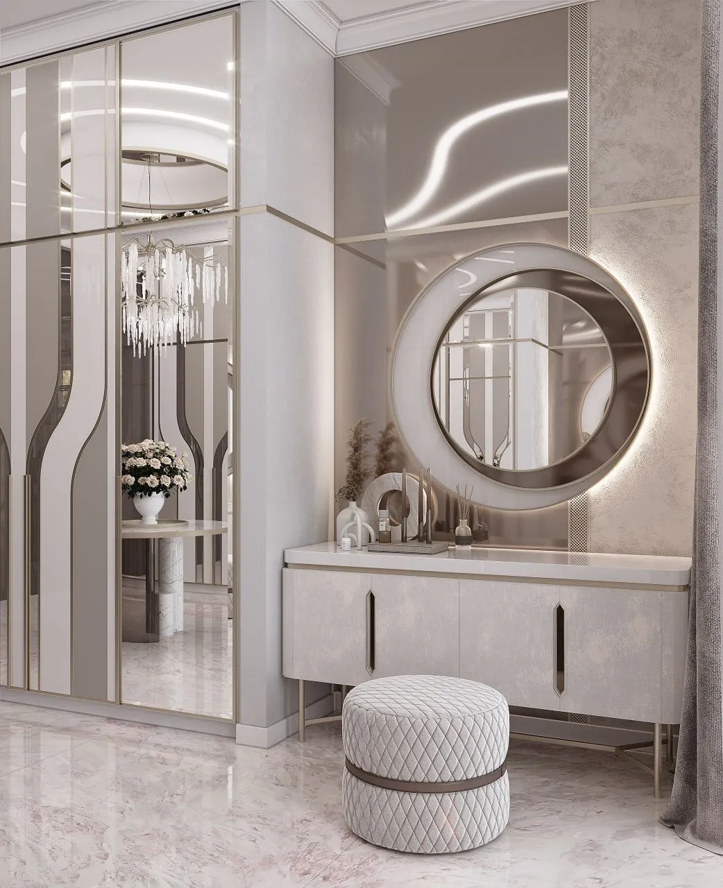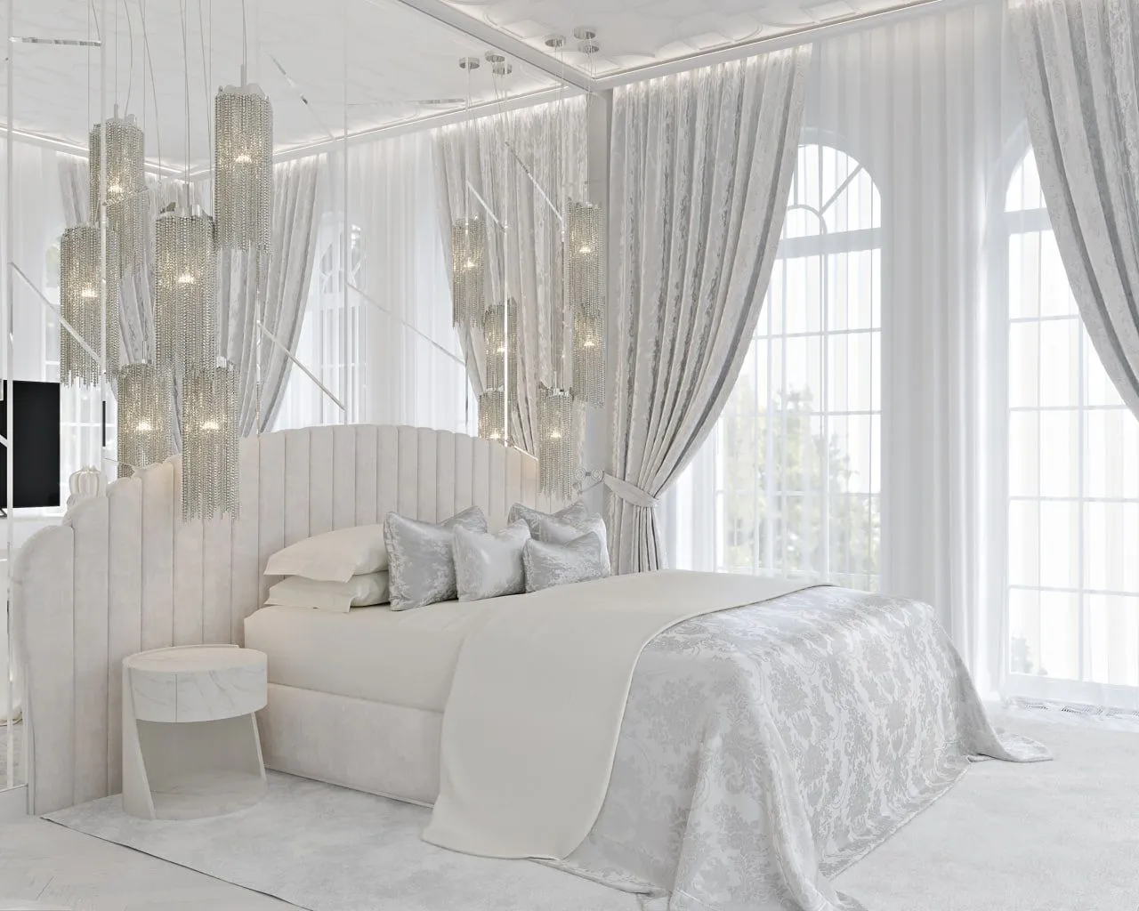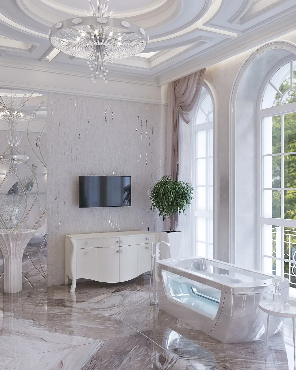 This concept of a private house of 760 m² was an attempt to reimagine classic elegance in a modern way. The project demonstrates the synthesis of exquisite decorativeness and the latest design solutions, creating a space where luxury is combined with lightness and light. The key concept is to create a living space that radiates purity, light and aristocratic tranquility. The interior plunges into the atmosphere of luxury without excessive pomp: a white palette with shades of silver and mother-of-pearl, mirror surfaces, noble stone and elegant textures. The main bedroom is made in an almost monochrome white-silver gamut, where textiles and light play the main role. A bed with a high soft headboard, drapery made of heavy fabrics, cascading lamps with metal chains create the feeling of a theatrical scene. Mirror inserts on the walls and ceiling visually double the space, enhancing the effect of radiance. The bathrooms are solved in solemn materials: marble surfaces, panels with stone patterns and mosaic accents. A separate bathroom area with large arched windows turns into a place of relaxation with a view of the garden. The combination of cream tones, deep chocolate marble and crystal lamps creates a spa atmosphere. The center of the space was the dining room with high windows, marble floors and expressive ceiling decor. Round and oval shapes in the ceiling, crystal chandeliers and light velvet chairs in pastel lilac shade emphasize elegance. A showcase wall with decorative elements and an aquarium make the interior lively, adding dynamics. The spacious hall is decorated with mirror panels and decorative inserts made of metal and glass. Light circles on the ceiling create a sense of infinity and movement, emphasizing the scale of the space. The dressing rooms are designed as galleries of light and reflections, where functionality borders on art installation. Light scenarios have become a key tool in this project. Built-in linear lamps, cascading chandeliers, decorative lights create multilayeredness and depth, emphasizing textures and architecture. The decor is based on the play of reflections, the shine of glass and polished metal. This concept of a private home demonstrates how contemporary design can interpret classical motifs, creating interiors that resemble palace halls, but at the same time remain comfortable to live in. It is an example of a bold experiment with materials, light and scale, showing new horizons for luxury in the private home.