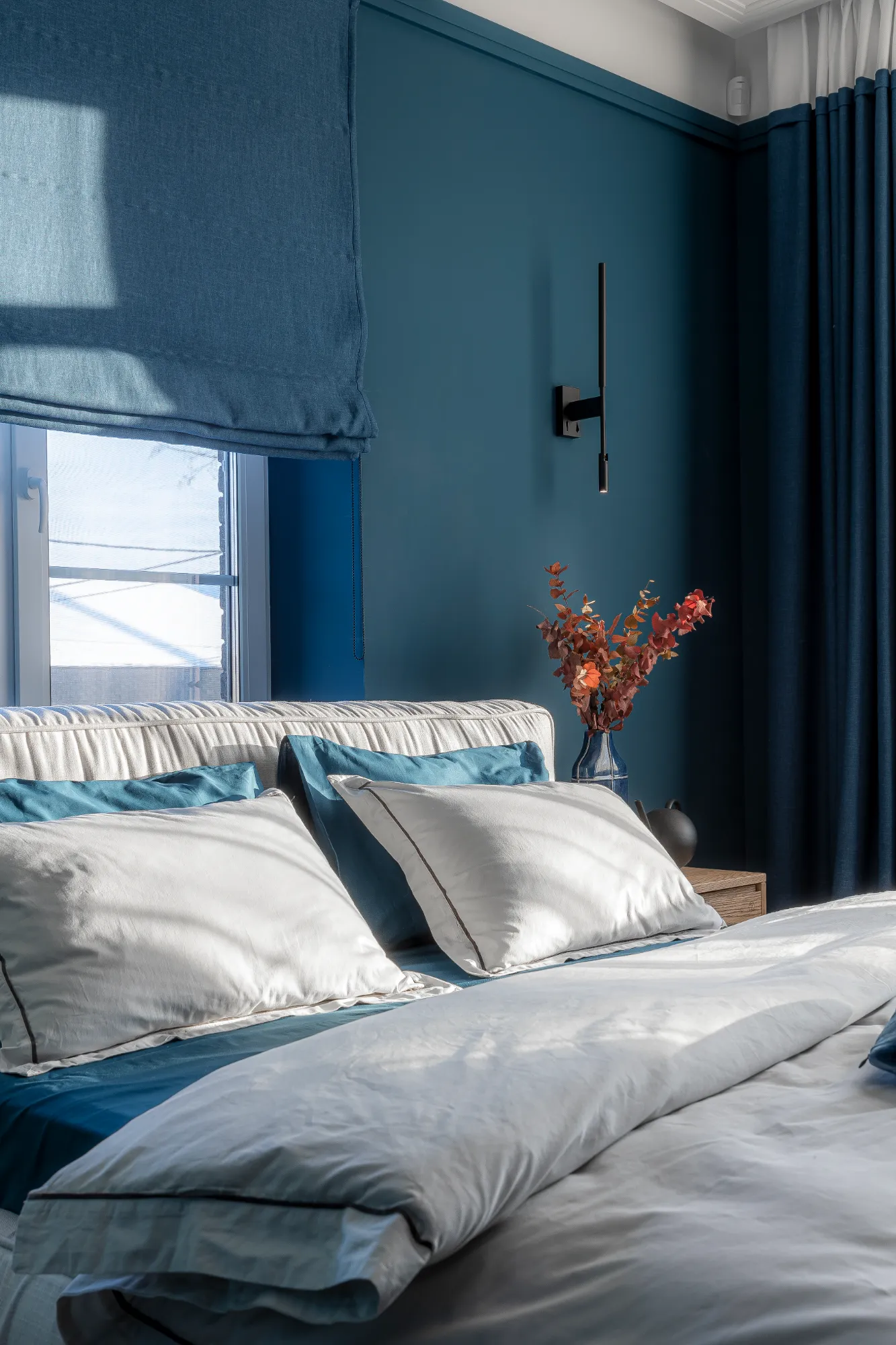 Soft colors and delicate wall paintings by Soyka Art Studio create a romantic atmosphere in the master bedroom. The comfortable Butterfly bed from Interia seems to embrace you and invite you to relax. The "Perforation" rug (designed by Yevhenii Lytvynenko) added a touch of sentimentality and coziness to the space.
