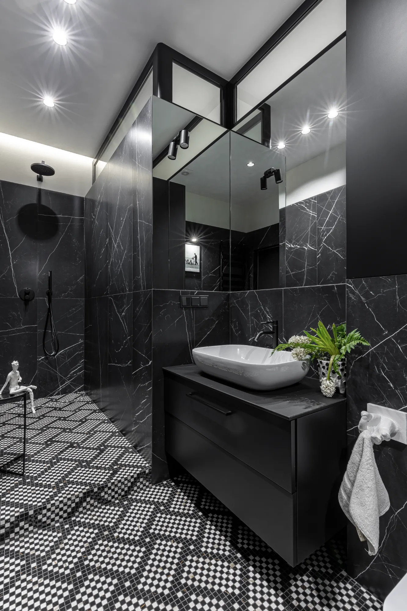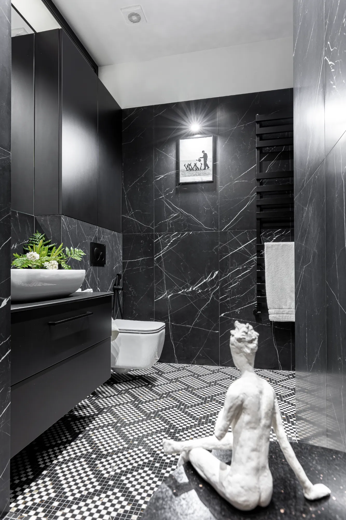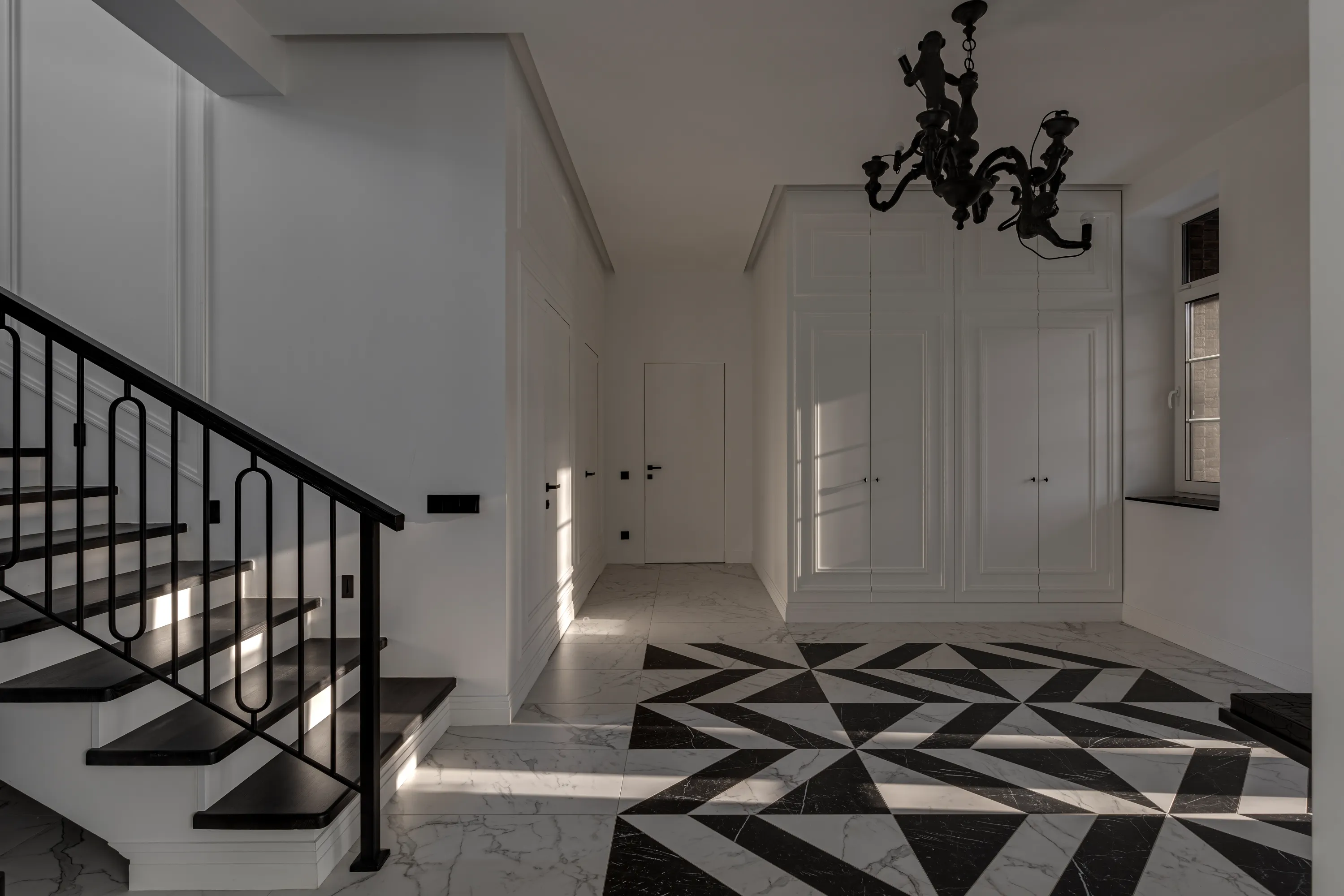 The hallway immediately sets an ironic and welcoming mood thanks to the Monkey Black lamps, designed by Marcantonio for Seletti. The graphic floor tiles from Bicolor create rhythm and dynamics. The Stability console and Spindle bench from SV-Atelier support the overall black-and-white graphics.