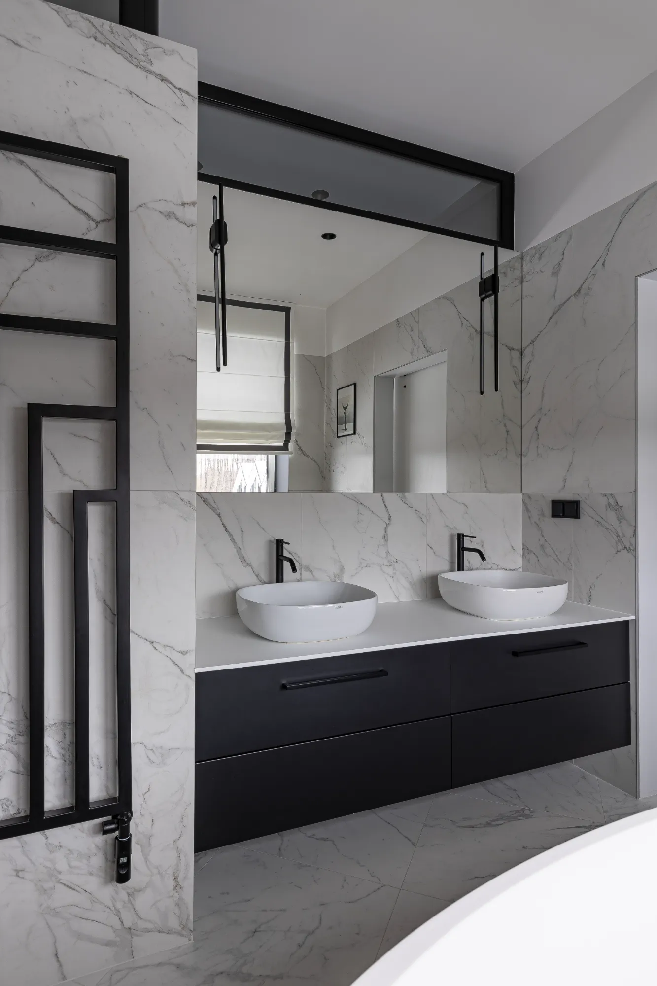 To make the home as comfortable as possible for all residents, we suggested small but constructive changes. Thus, the huge bathroom on the second floor was divided into two separate rooms. As a result, the house now has two full bathrooms. The partition between them ends with a horizontal window that provides natural light for the son’s bathroom.