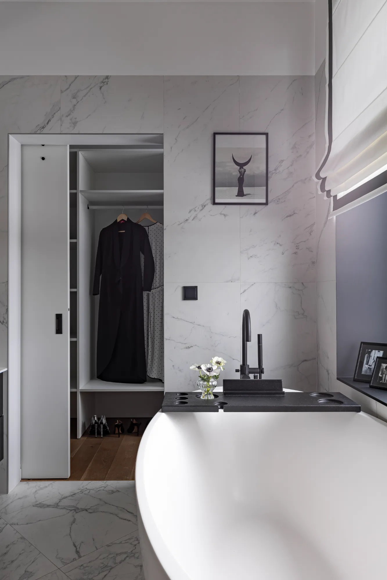 The entrance to the master bathroom was arranged through the walk-in closet.