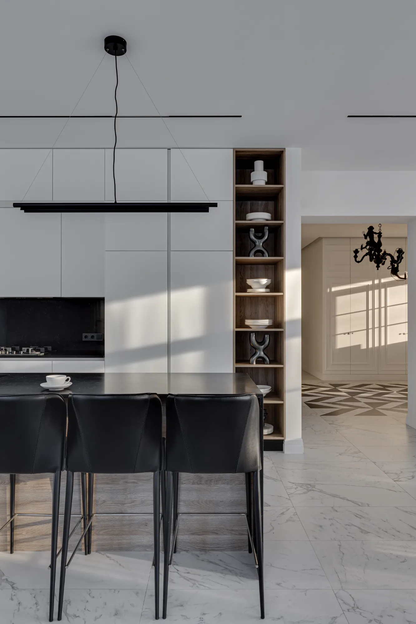 The spacious living room combines several zones: a lounge area, a kitchen, and a dining room. In the highly functional kitchen by Andrii Lisitsyn, real culinary masterpieces are created — for entertaining guests or enjoying a delicious family dinner.