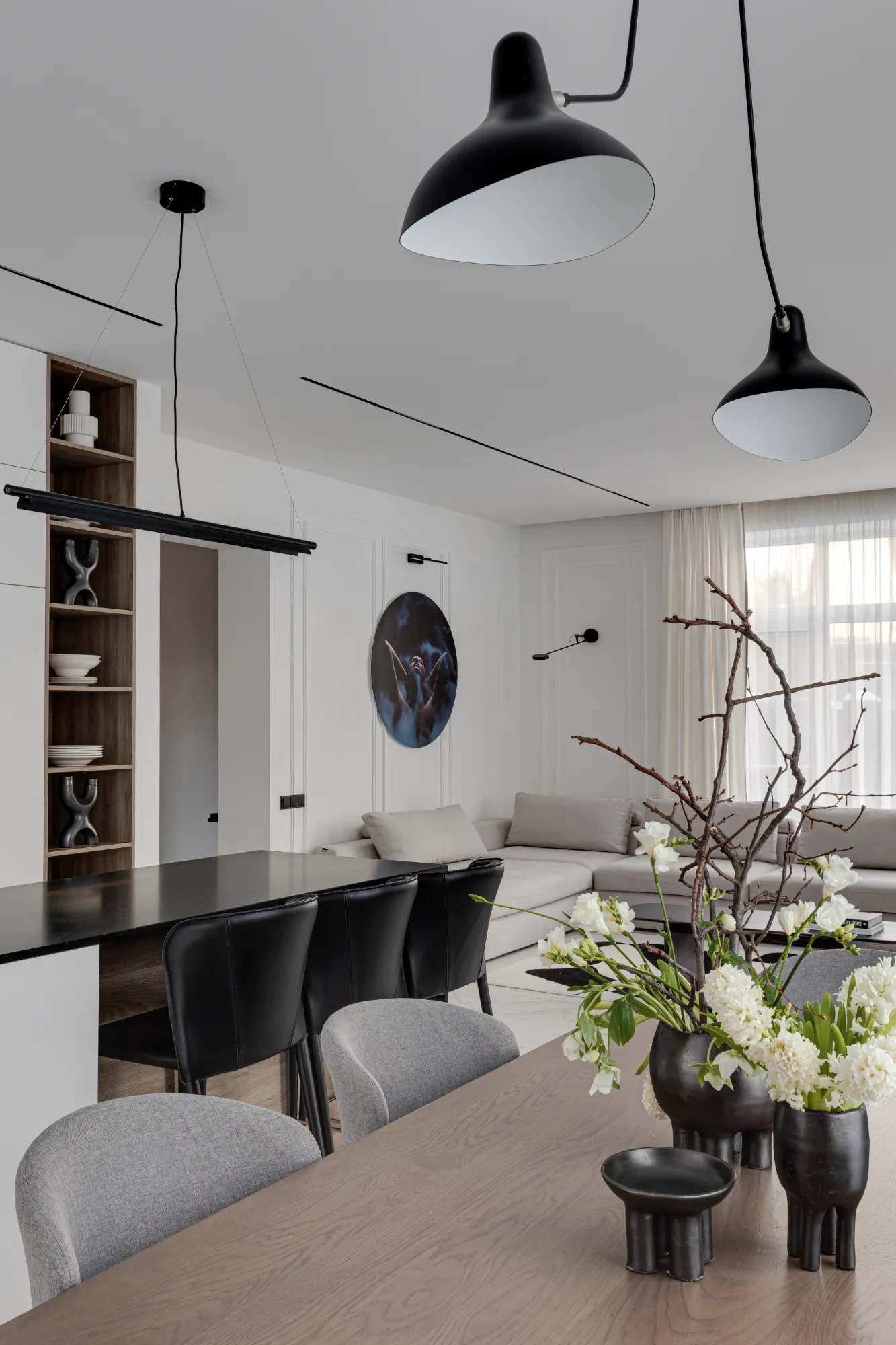 The dining room walls are decorated with trays from the Medicis collection by Svetoria. Their images are not only exquisite and elegant but also make everyone smile. Tested! Above the table hangs the Mantis lamp by Svetoria, which creates a wonderfully romantic atmosphere during dinner.
