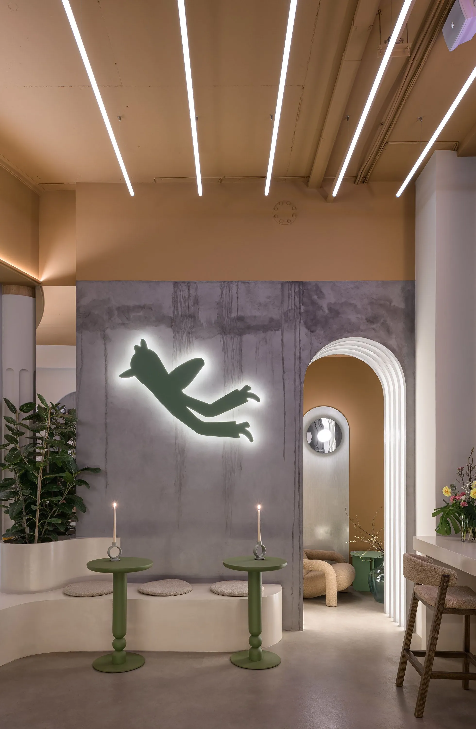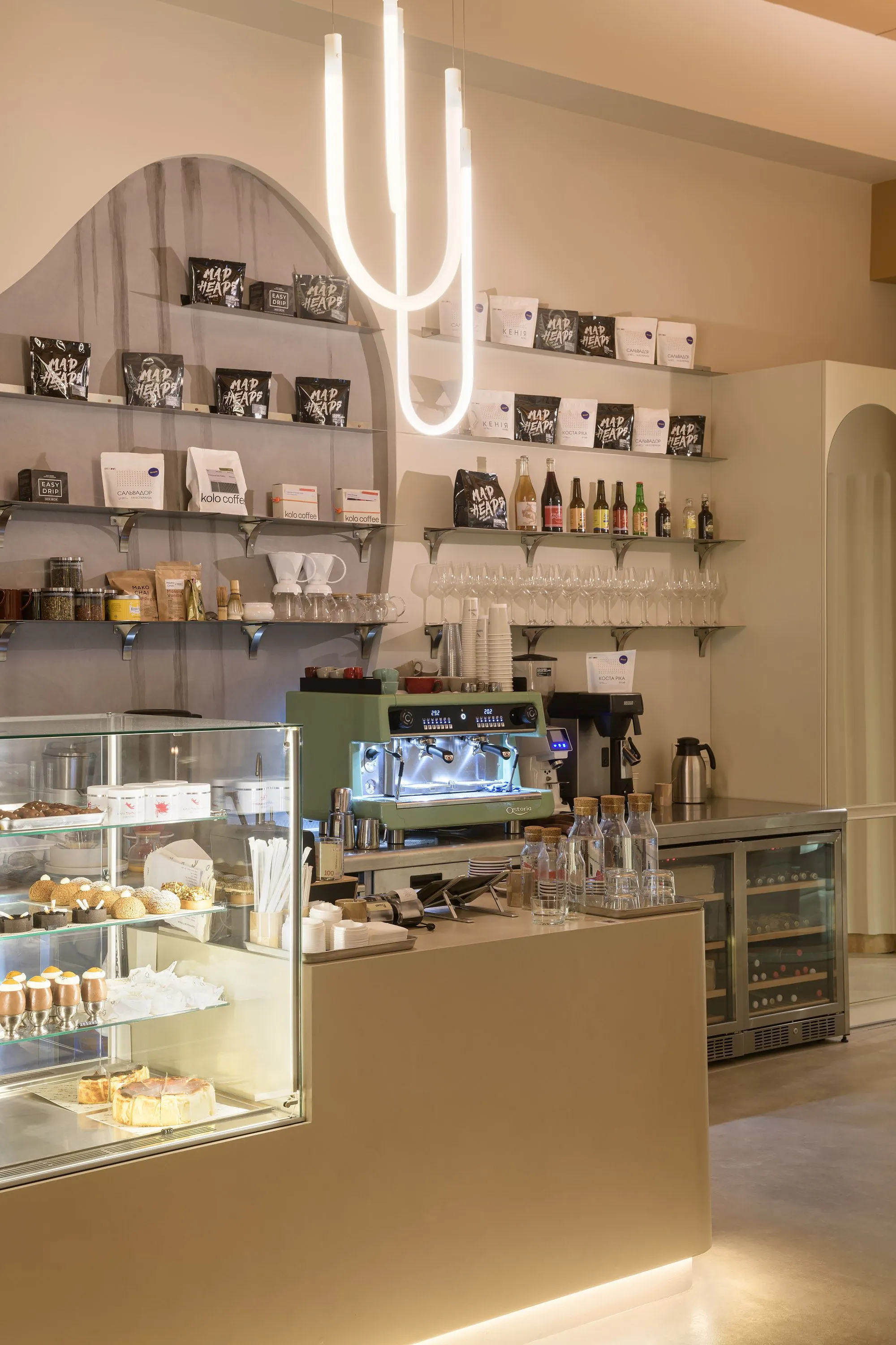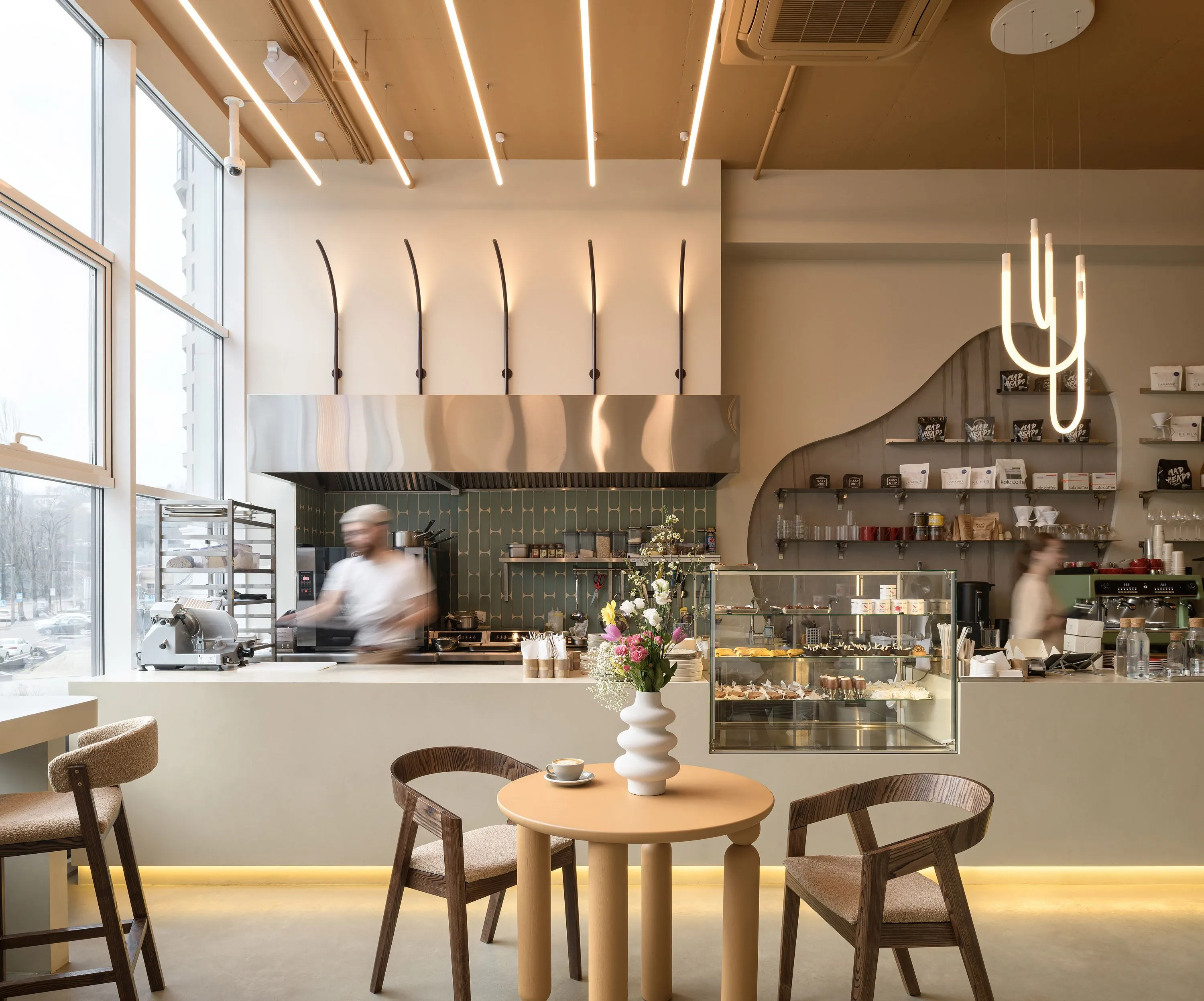 The peculiarity of this project was the maximum coherence and speed of the robotic team members: the client, the design bureau team, the brand marketer and the construction team. The concept of a single style and pastel shades in the interior came frombrandbook and were adopted as a key starting point in creating the design. Personally, we added to the elements of the corporate style of the premises a unified graphic of structural elements, in furniture (rounded shapes, arches) and elements of landscaping inthe central part of the podium. We were inspired by the vibe inherent in the idea of the name itself. Zajvornk is a man-bird, as the highest form of human being (according to the philosophy of Gregory Skovoroda). The client of this project is a special woman, a person with a strong character in business, as well as a talented pastry chef. In the concept, it was conceived toharmoniously place the technology zone and the landing area for guests, and this is all 50 m2. The project of this format required tremendous energy and finances, so she took the creation andimplementation as seriously as the creation of the most exquisitedessert. In time, the project took six months, so we all worked to the limit. A huge amount of professional kitchen equipment was imported from the USA and Germany, andthe main specialization of this cafe is to make delicious breakfasts all day with fragrant bread and croissants.
