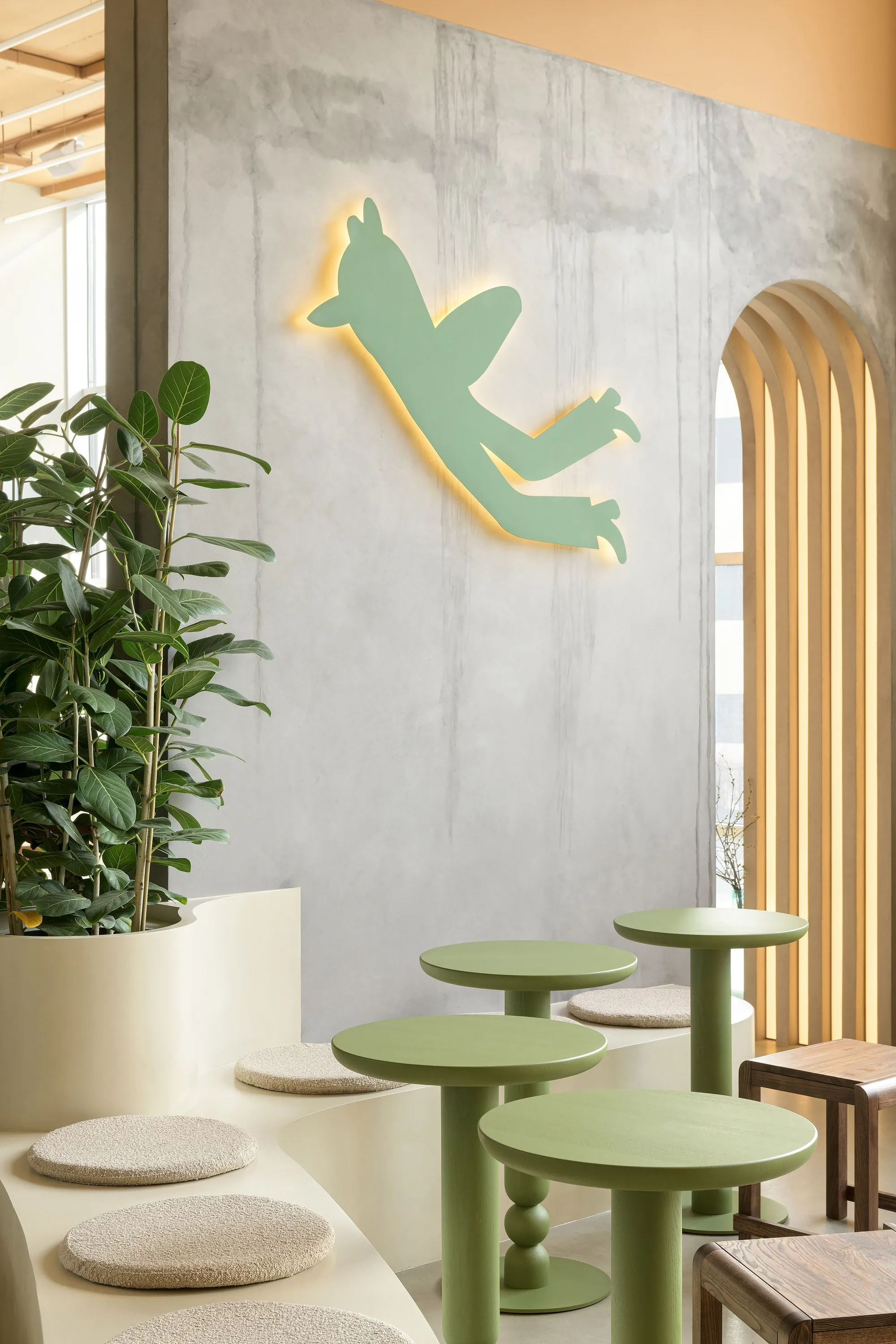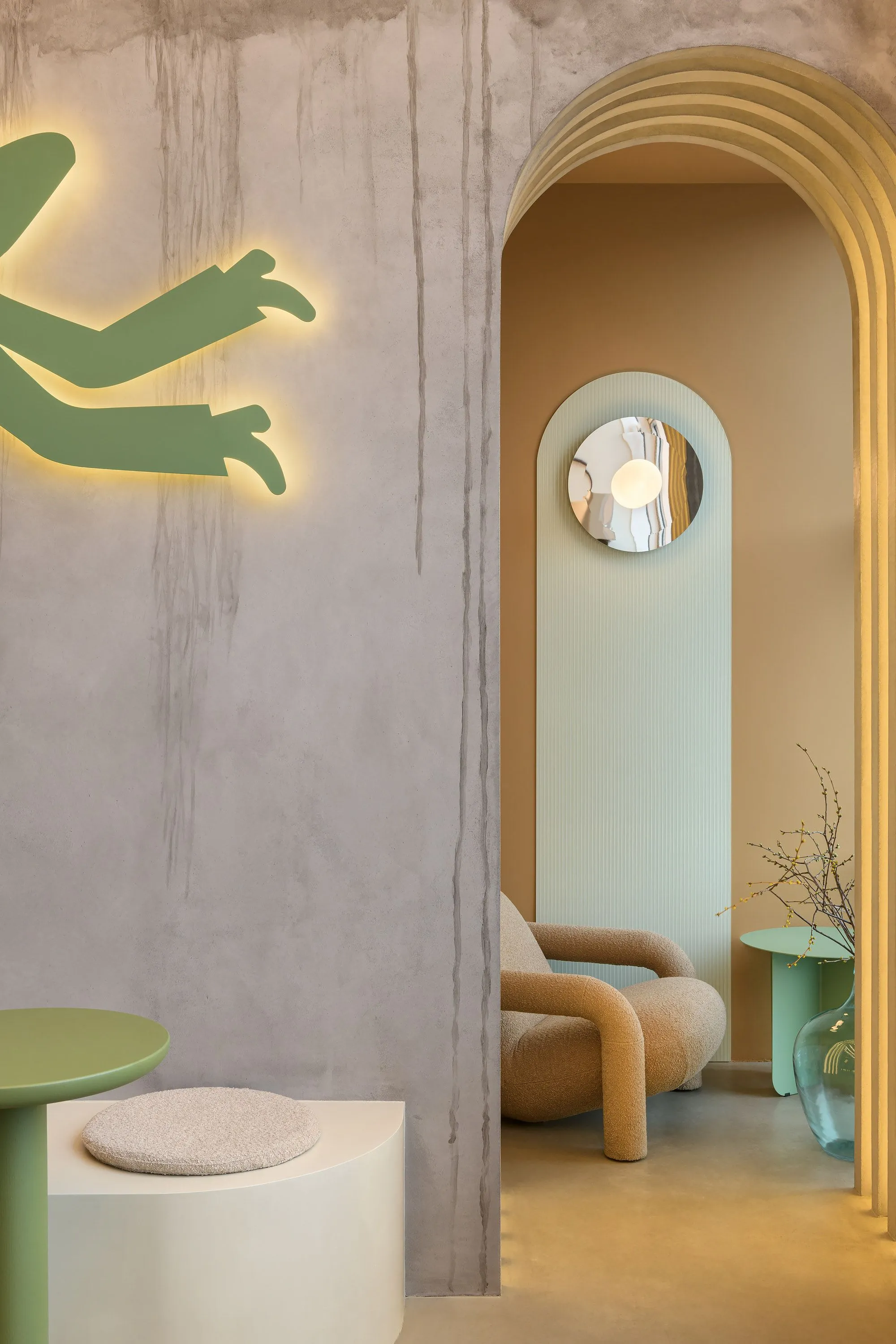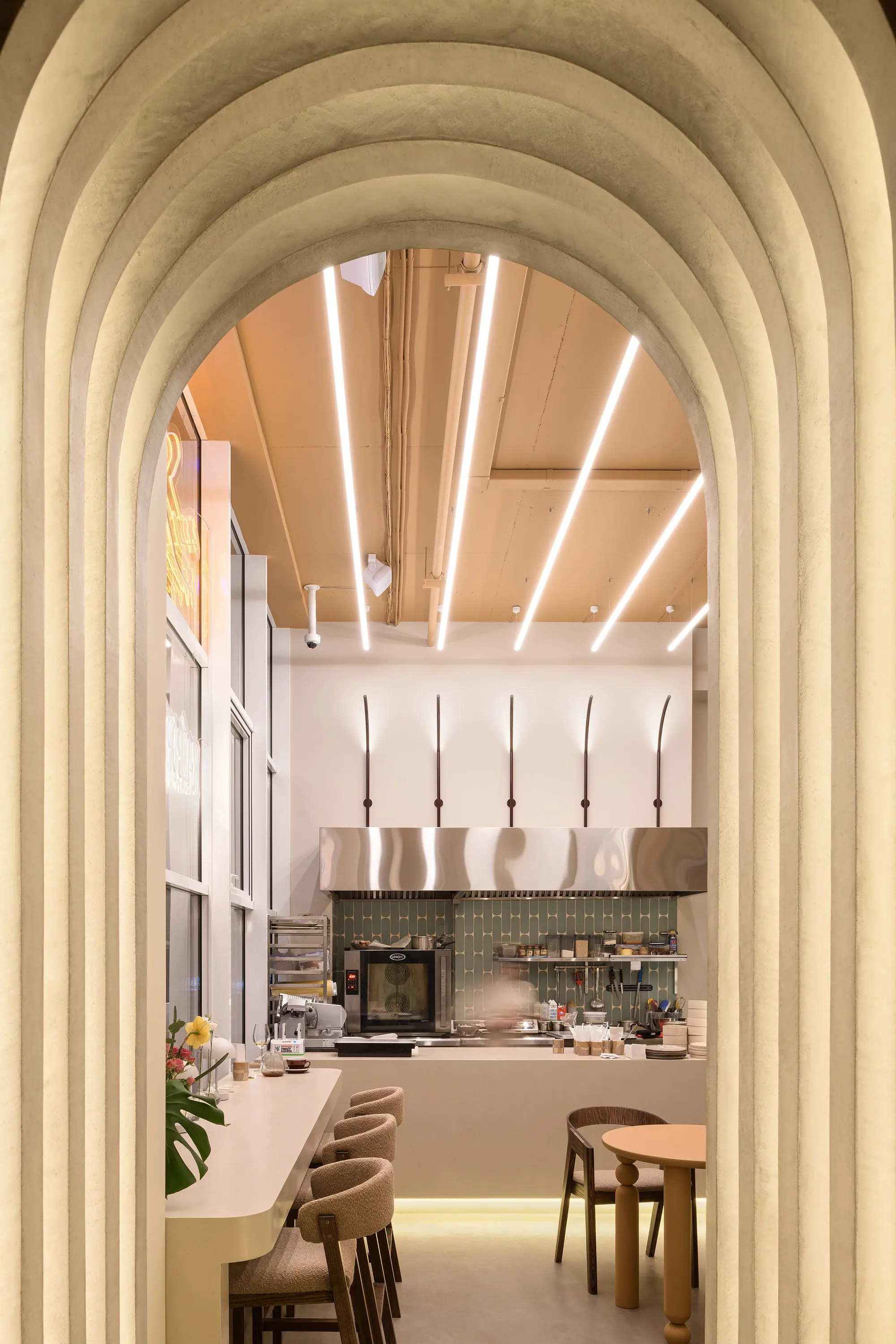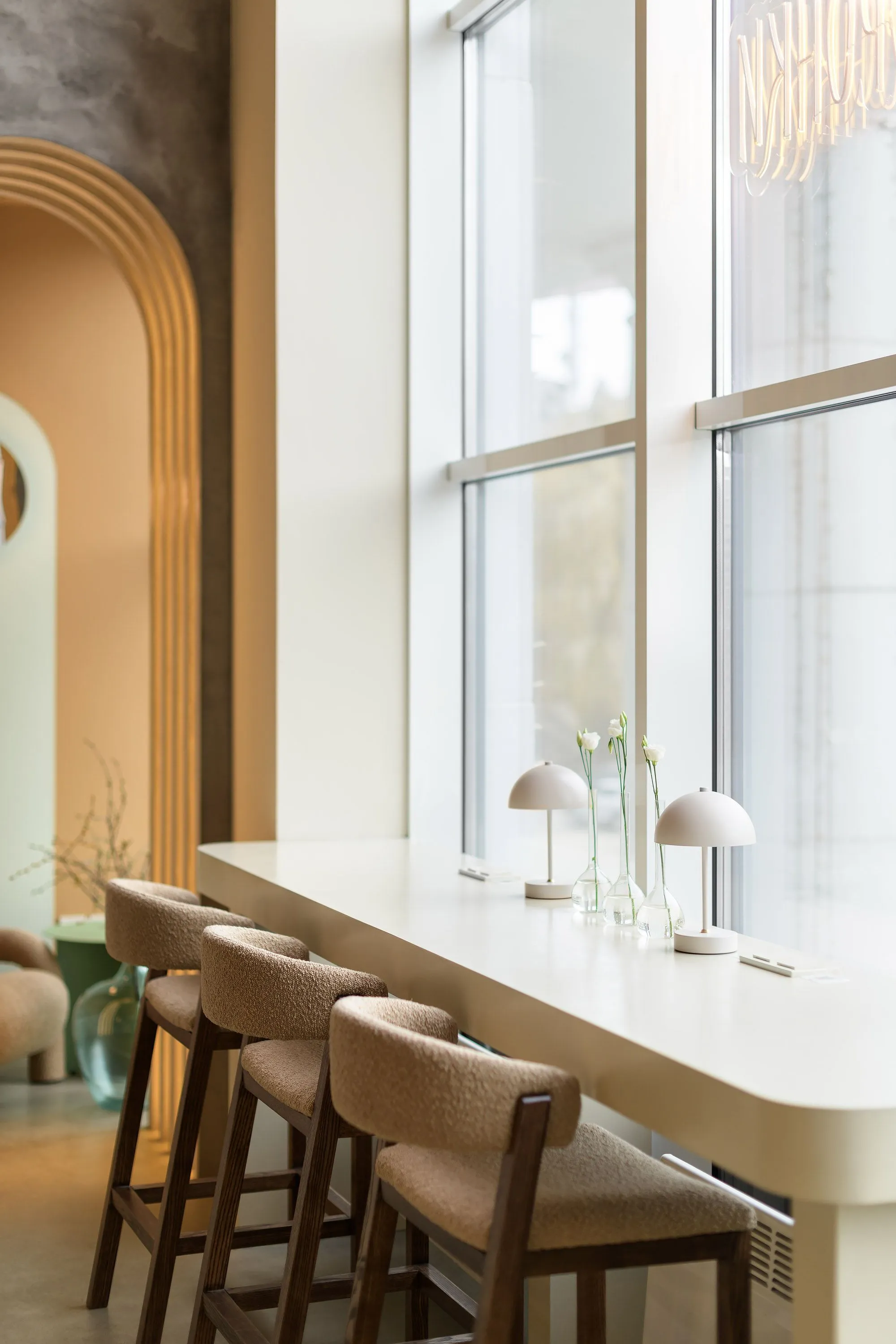 The peculiarity of this project was the maximum coherence and speed of the robotic team members: the client, the design bureau team, the brand marketer and the construction team. The concept of a single style and pastel shades in the interior came frombrandbook and were adopted as a key starting point in creating the design. Personally, we added to the elements of the corporate style of the premises a unified graphic of structural elements, in furniture (rounded shapes, arches) and elements of landscaping inthe central part of the podium. We were inspired by the vibe inherent in the idea of the name itself. Zajvornk is a man-bird, as the highest form of human being (according to the philosophy of Gregory Skovoroda). The client of this project is a special woman, a person with a strong character in business, as well as a talented pastry chef. In the concept, it was conceived toharmoniously place the technology zone and the landing area for guests, and this is all 50 m2. The project of this format required tremendous energy and finances, so she took the creation andimplementation as seriously as the creation of the most exquisitedessert. In time, the project took six months, so we all worked to the limit. A huge amount of professional kitchen equipment was imported from the USA and Germany, andthe main specialization of this cafe is to make delicious breakfasts all day with fragrant bread and croissants.