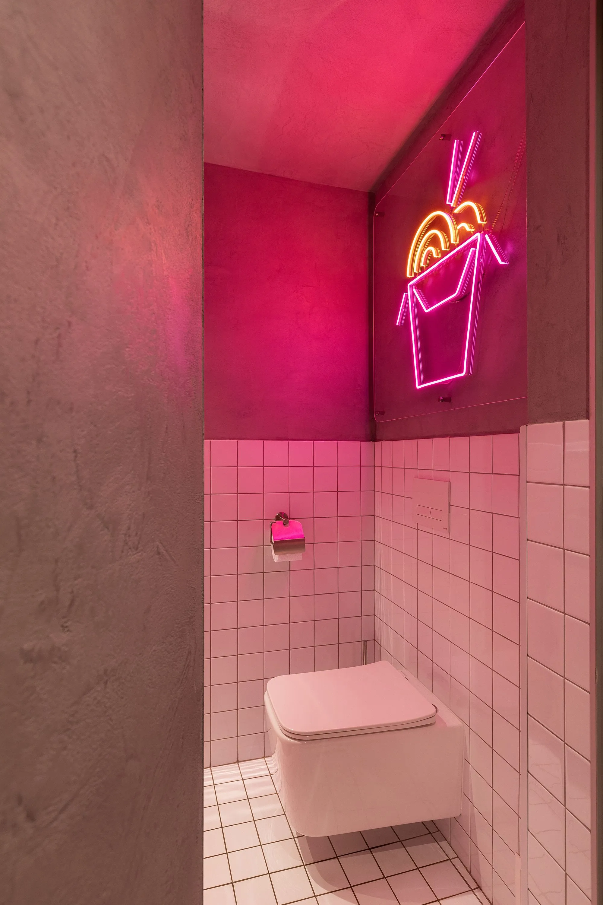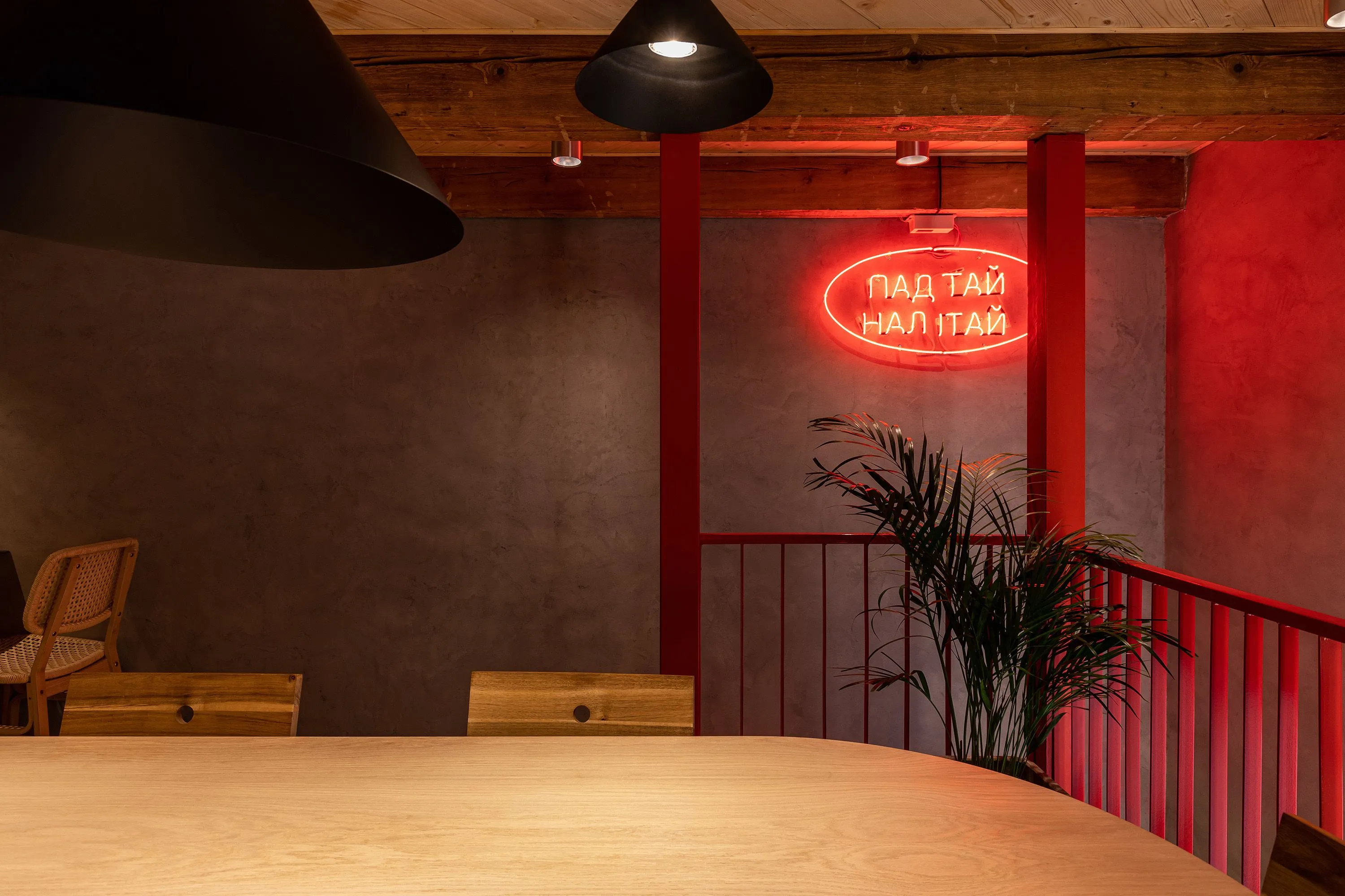Цей заклад тайської кухні із локацією в історичному центрі Чернівців створений з метою поєднання традиційного азіатського стилю із сучасними елементами. Він пропонує ідеальну атмосферу як для затишних посиденьок з друзями, так і для швидких замовлень на виніс. Основною ідеєю було створити гармонійний дизайн, що поєднує східну естетику із сучасним комфортом. Під час ремонту простір був повністю перетворений, звільнений від зайвих нашарувань попередніх власників. Це дозволило відкрити та інтегрувати в дизайн автентичні елементи будівлі: масивні історичні дерев'яні балки та цегляні стіни, які тепер стали ключовими акцентами інтер'єру, додаючи йому характеру та глибини. Існуюча конструкція другого поверху була майстерно трансформована в зону додаткових посадкових місць, забезпечивши максимально ефективне використання кожного сантиметра простору та розширивши місткість закладу. Більшість меблів для проєкту були виготовлені українськими виробниками, а частина – за індивідуальним замовленням. Це підкреслює унікальність та локальний колорит закладу, адже кожен елемент, від столів та стільців до декору, гармонійно вписаний у загальну концепцію. Для якнайкращої інтеграції внутрішнього простору з міським середовищем старі сходи були демонтовані та встановлена велика вітрина з максимальною площею засклення. Вона не лише забезпечує відмінне природне освітлення, наповнюючи приміщення світлом, але й повністю відкривається в теплу пору року, буквально перетворюючи заклад на частину вулиці, створюючи відчуття відкритого майданчика. Ключовим елементом, що передає яскраву атмосферу азіатських вулиць, стали численні різнокольорові неонові вивіски та світлові інсталяції. Їхнє яскраве світло створює захоплюючу гру контрастів і тіней, що ідеально підкреслює дизайн та занурює відвідувачів в автентичний світ тайської вуличної їжі.