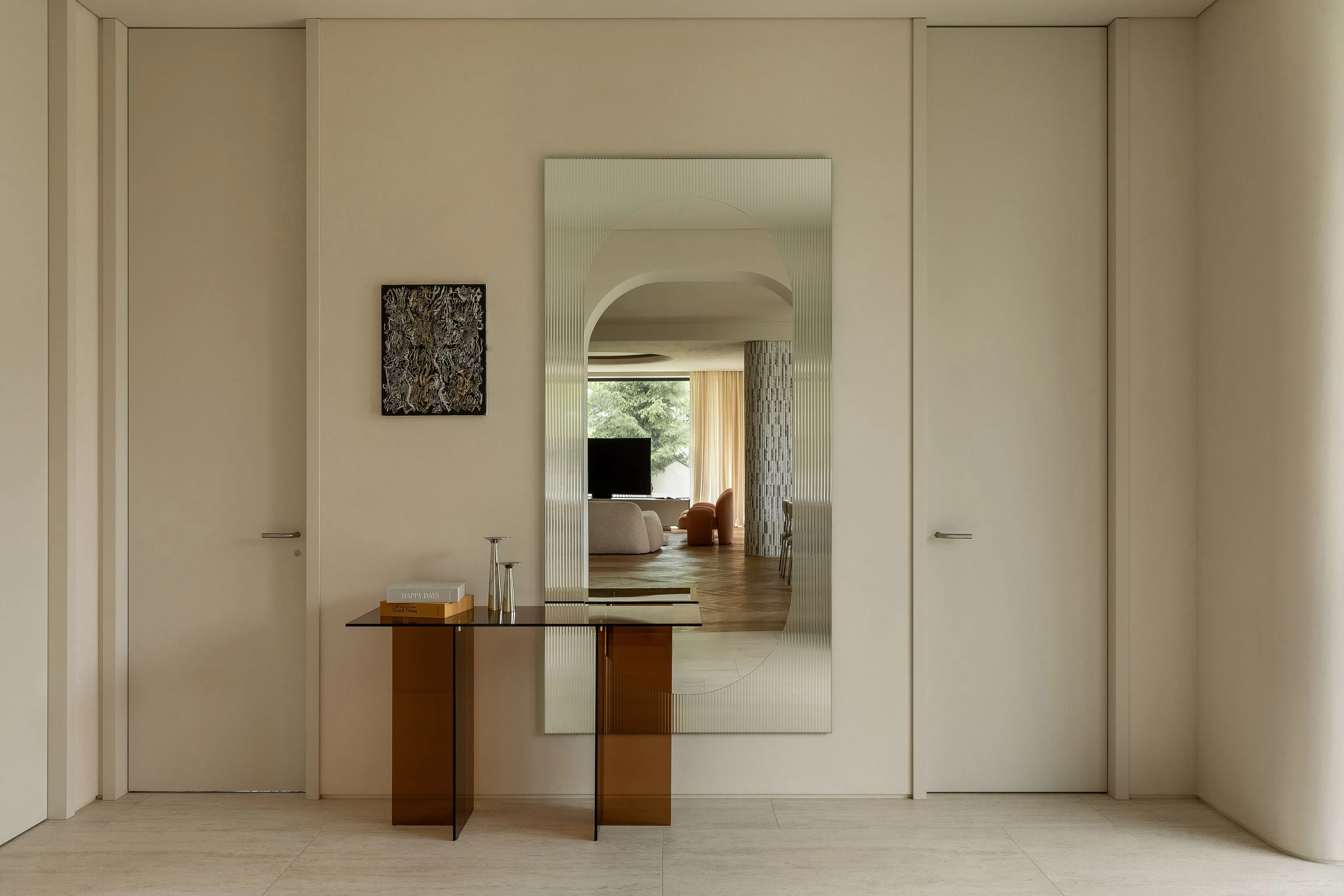 Скульптурність форм підтримується делікатним освітленням, яке не змагається з мистецтвом, а навпаки — підкреслює його. Інтер’єр не намагається бути головним героєм — він стає фоном, який розкриває життя родини, її цінності, смак та глибину інтересів.