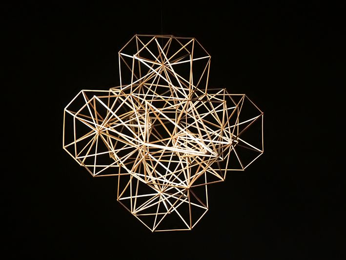 Серія повітряних скульптур «Жива геометрія» Альони Шибунової розгортається на перетині українських обрядових традицій, архаїчної символіки та авторського переосмислення сакральної геометрії. В її основі — давня слов’янська практика створення «павуків» — легких геометричних конструкцій із соломи, які слугували оберегами, гармонізували простір та втілювали зв’язок між світами.Художниця не лише відтворює традицію, а й переносить її у сучасність. Підвішена до стелі, як і століття тому, скульптура «303» формує нову естетику простору та занурює глядача у багатовимірну реальність, де кожна форма «дихає».Особливу увагу приділено використанню сталих природних матеріалів — соломин жита та пшениці, що поєднують традиційність з сучасною екологічною практикою.Ці об’єкти не фіксують минуле, а ставлять запитання про майбутнє: «Чи можливо, спираючись на знання предків, створити модель нового світу?»Кожна скульптура — це не статичний декор, а жива взаємодія з простором і світлом. Природне коливання, прозора об’ємність і символічна геометрія пробуджують чуття: світло стає матерією, тінь — мовою, форма — провідником.«Жива геометрія» — це про пам’ять, що дихає. Про красу, вкорінену в традиції, але спрямовану у майбутнє.