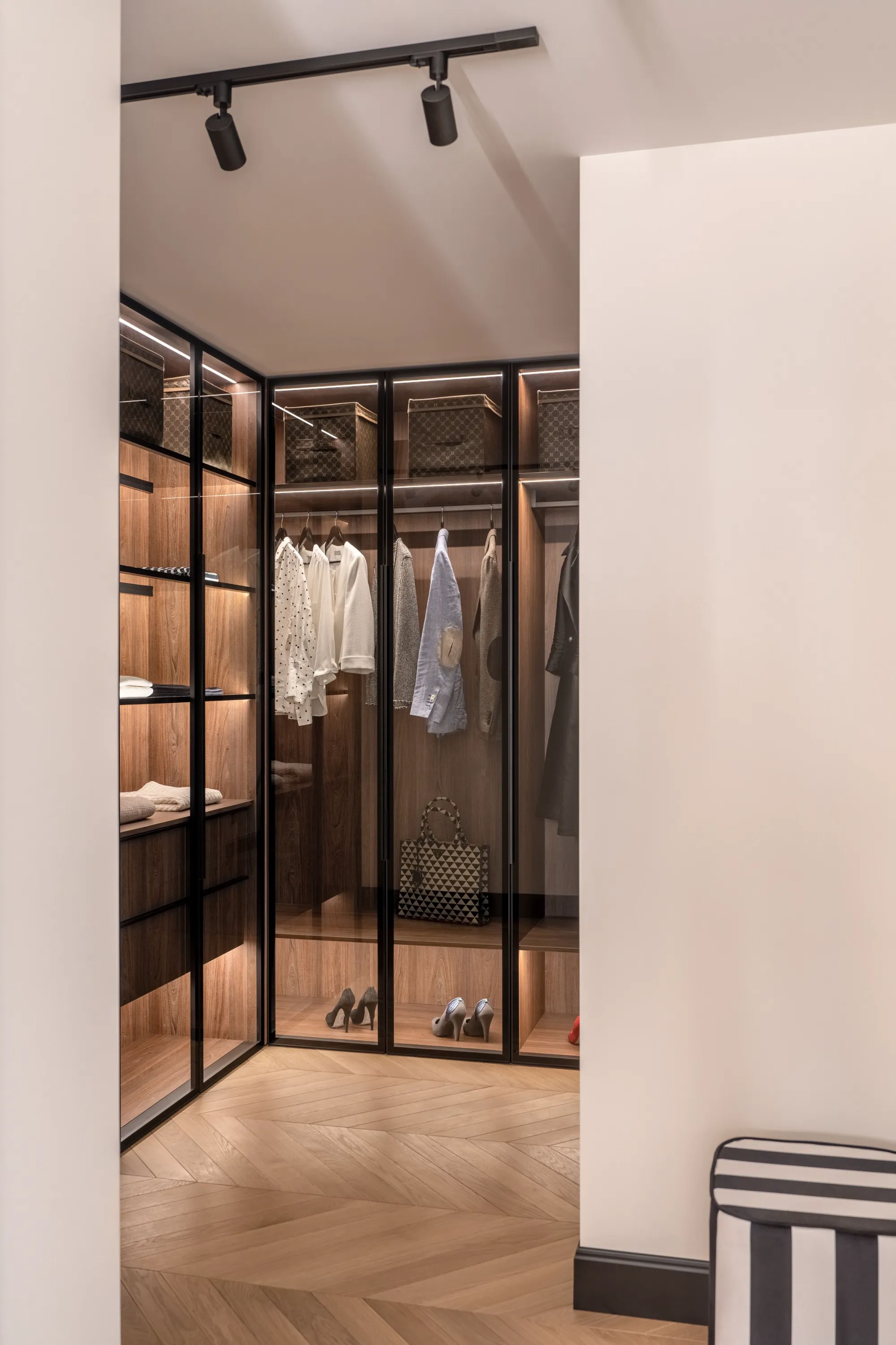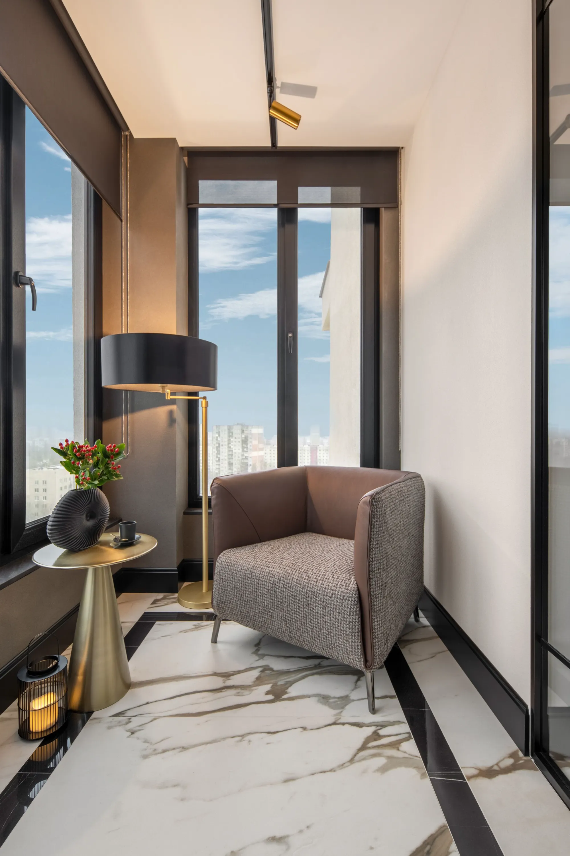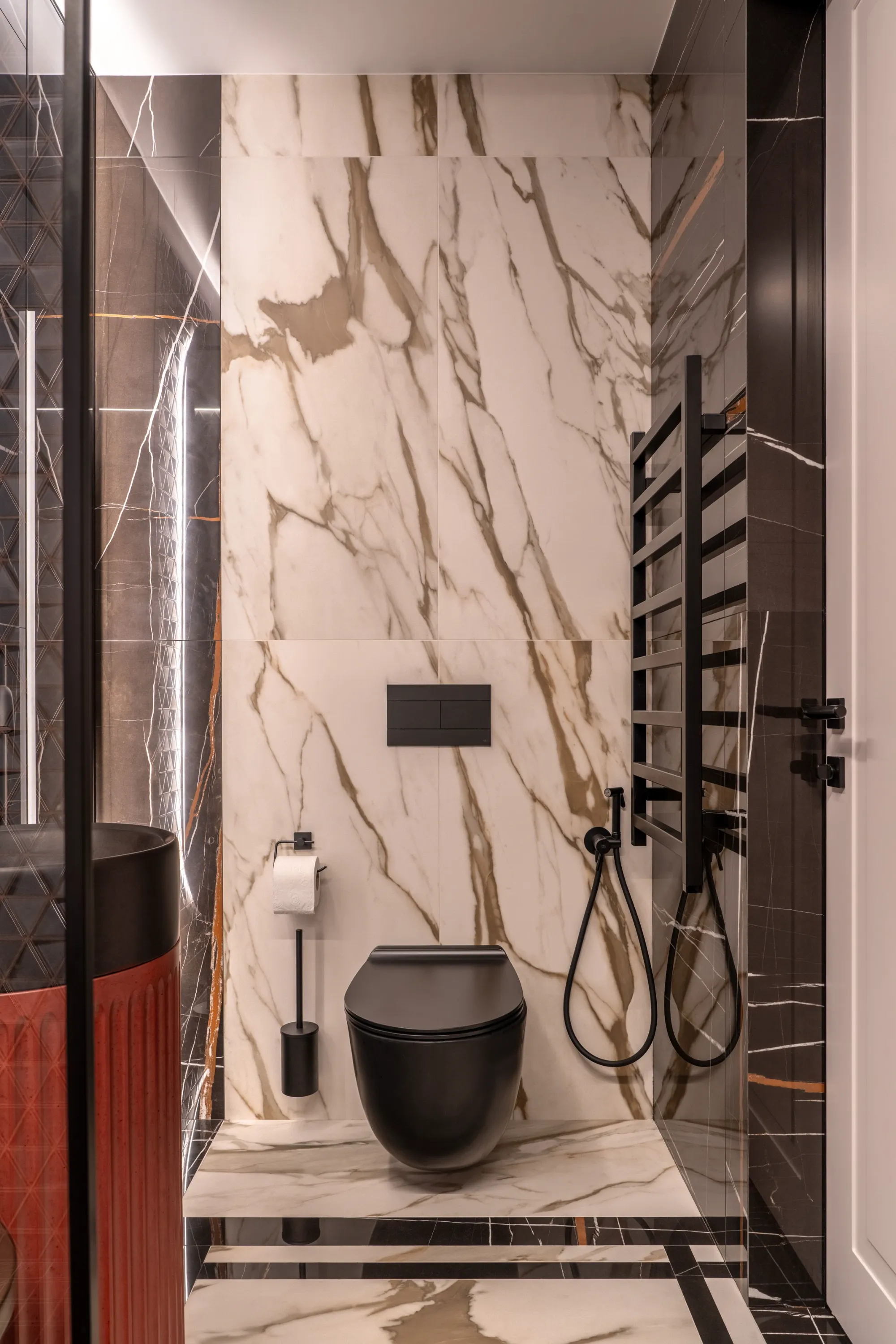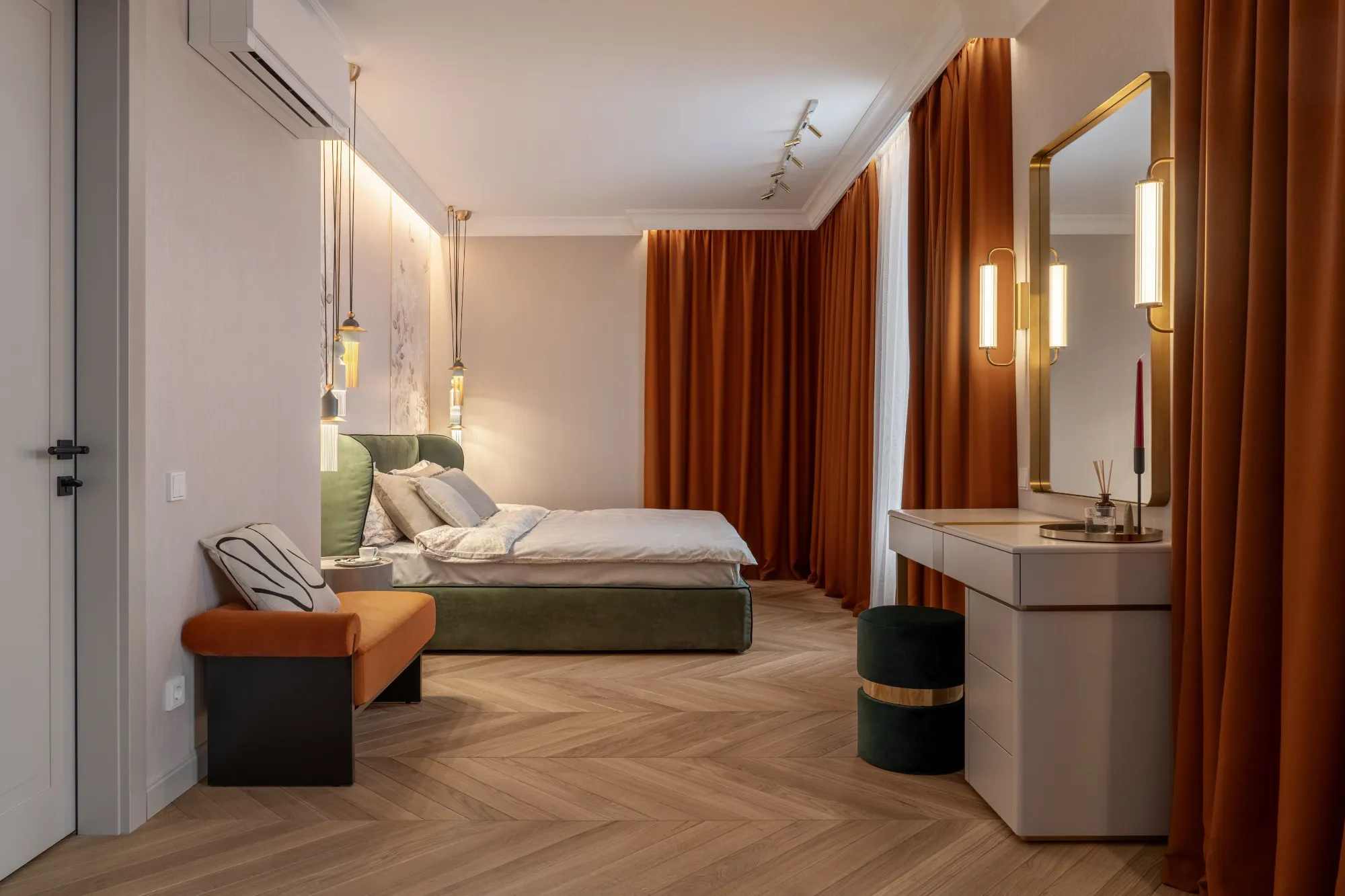 Замовники цієї квартири – молода подружня пара із дітьми – повністю поклалися на смак та досвід студії Alta Idea Design та довірили спроєктувати ергономічний простір квартири, актуальність якого не тьмянітиме найближчими роками. Для втілення проєкту було обрано поєднання неокласики з елементами ар-деко: в такому виконанні простір заграв яскравими фарбами, довівши, що сучасний інтер'єр може бути не тільки витонченим чи практичним, а й функціонувати поза часом.Відразу привертає увагу виважене зонування простору. Передпокій запрошує до загальної зони квартири і вже тут можна оцінити зручності для власників та гостей. Поруч з передпокоєм облаштована гардеробна для верхнього одягу. Меблі, шпоновані американським горіхом, виглядають вишукано, а оригінальні пуфи з ексклюзивно підібраною тканиною в монохромну смугу стали окремим декоративним акцентом.Поруч знаходиться гостьовий санвузол — яскравий приклад, як поєднати графічну стриманість і артистичність. Теракотовий підлоговий умивальник з підлоговим змішувачем ефектно контрастують на темній плитці. Це єдина кімната, де було обрано темний колір як основний, але завдяки балансуванню акцентів простір залишився невимушеним.Вже з коридору можна побачити інтер’єр кухні-їдальні та вітальні. І хоч кожен простір має свій особливий шарм, дбайливо підібрані елементи пов’язують їх у єдину композицію. Тут використано світлі відтінки, бронзові акценти, класичний паркет "ялинкою", дзеркальні поверхні та теракотові нотки, щоб об'єднати простір.Кухня хоч і компактна, але дуже функціональна. Вона зонована островом, який відокремлює робочу зону від обідньої. Облицювання робочої поверхні та стіни біля острова каменем не лише виокремлює простір, а й несе практичну функцію. Вбудована поруч техніка - холодильник, морозильна камера, мікрохвильова піч та духова шафа - потребували незначного зменшення площі вітальні, але водночас таке дизайнерське рішення дозволило збільшити функціональний простір для зберігання кухонного приладдя.Обідній стіл виготовлений на замовлення. Унікальна форма і матеріали, масивна овальна нога – все це не тільки виглядає стильно, але й є практичним для сім'ї з маленькими дітьми. Обрамлення ніжки столу, як і ніжки стільців, виконані у бронзі, що візуально підтримує інші акценти інтер'єру. До речі, обідні стільці теж унікальні. Модель Lea фабрики Midj переродилась у новому образі - тканину із геометричним візерунком "гусячі лапки" замовляли спеціально для цього проєкту.Червоні напівбарні стільці біля острова слугують бунтарською ноткою в монохромному просторі. А ще, їхня подовжена бахрома м'яко погойдується, створюючи ефект динамічності.Головним акцентом вітальні став яскравий диван, що контрастує з білою стіною, прикрашеною ліпниною ручної роботи. Ліпнина, до речі, розроблялась дизайнеркою Юлією Байдик спеціально для цього інтер'єру. Керамогранітні панелі на стіні вітальні підкреслені розшивкою металевим профілем – зі зміною кольору панелей грає і колір металу – із чорного він перероджується в золотавий. Найкраще спостерігати за грою відтінків при світлі вогню у біо-каміні.Вітальня обладнана домашнім кінотеатром, а для зручності перегляду фільмів у будь-яку пору доби на вікна підібрані штори з ефектом «блекаут». Також тут є і домашня бібліотека. Додаткового за
