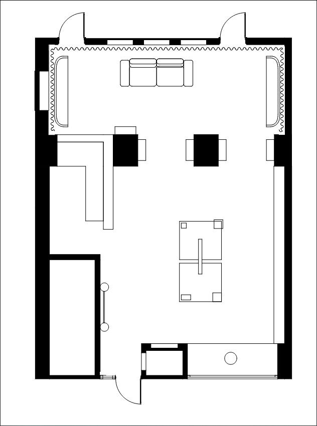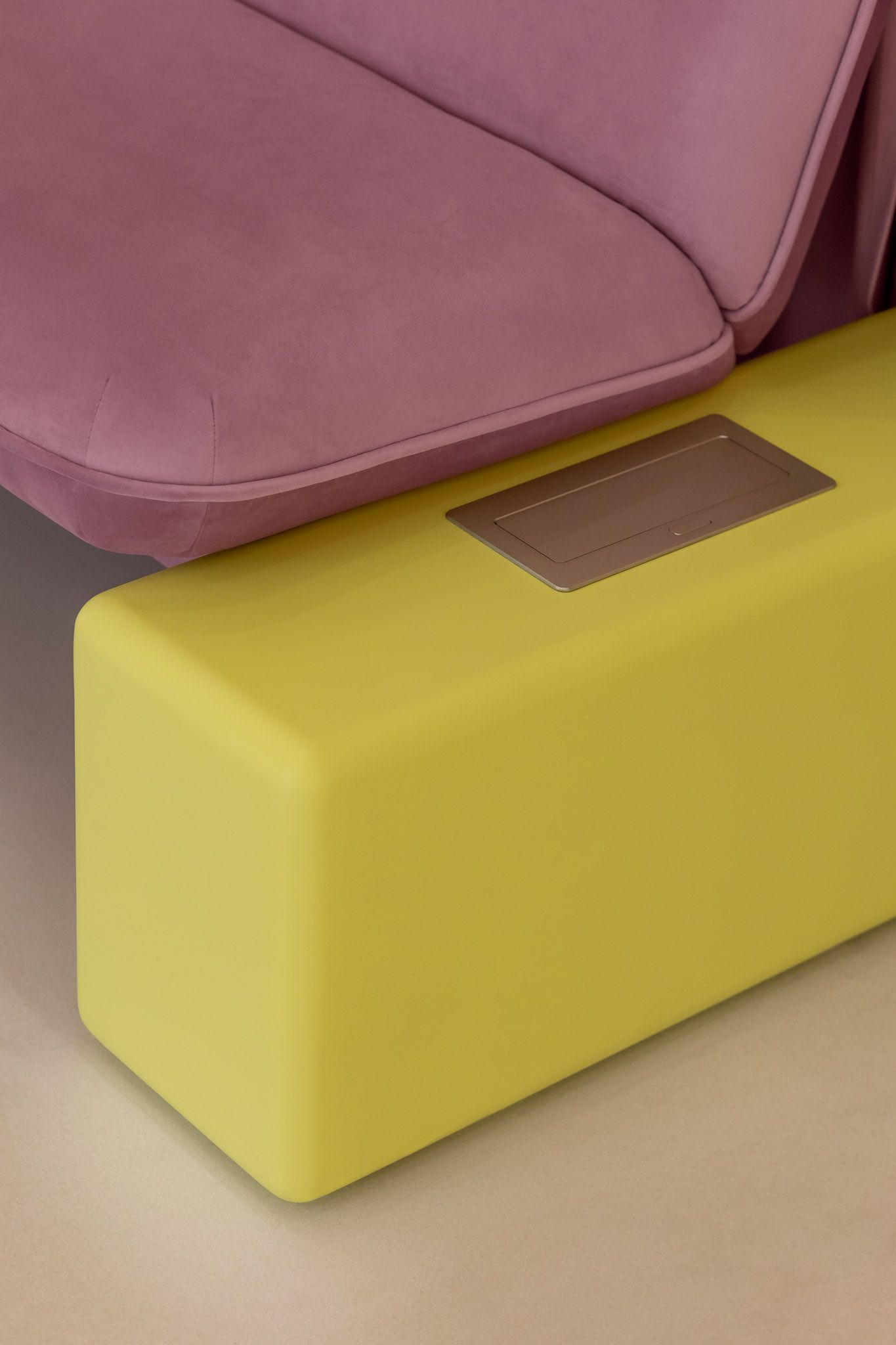 У просторі поєднано пісочні відтінки стін, масивні кам’яні п’єдестали та аркові прорізи, що створюють відчуття дюн і узбережжя. Лілові колони додають архітектурної виразності, а лимонні деталі вносять легку, свіжевасту ноту до загальної композиції.