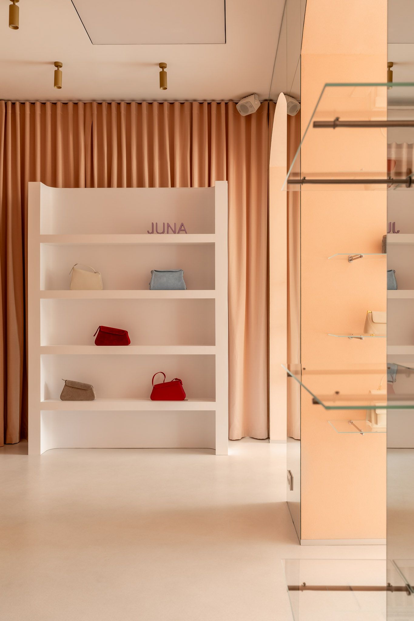 Інтер’єр водночас мінімалістичний і скульптурний, він працює як спокійний фон, у якому сумки сприймаються як експонати. Проєкт реалізовано у 2024 році.