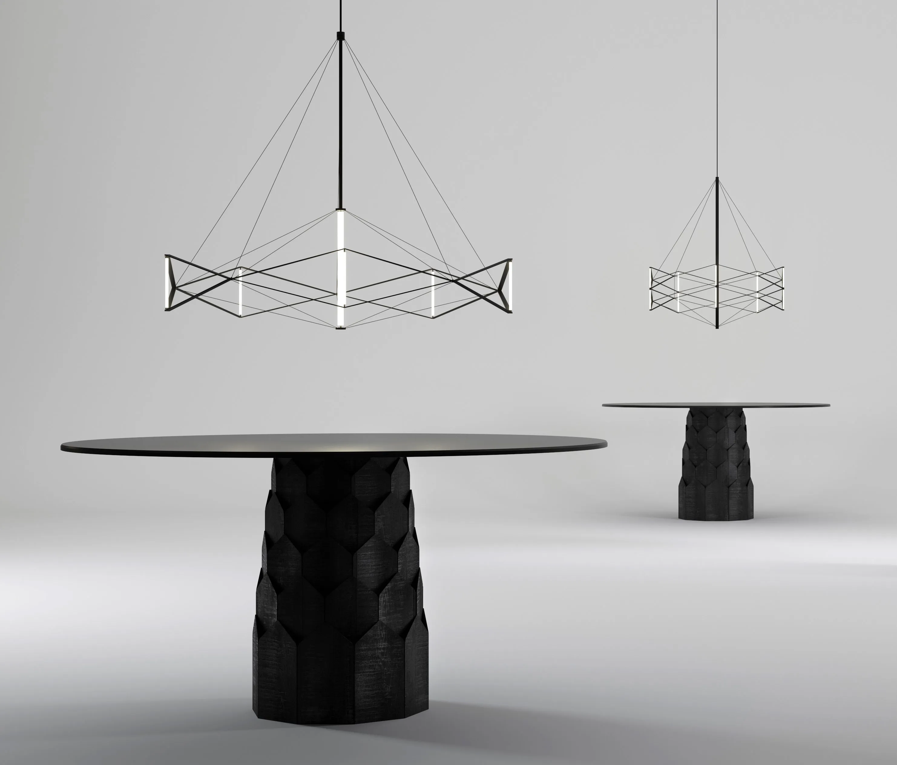 Підвісна люстра з колекції Arkan виготовлена з тонкої сталевої полоси та оснащена шістьма вертикальними світловими циліндрами. Вона відображає естетику гуцульської готики, втілюючи енергію та грацію, подібні до рухів танцю. ЇЇ силует відображає красу та гармонію, яка нагадує про чіткі рухи танцюристів по колу.