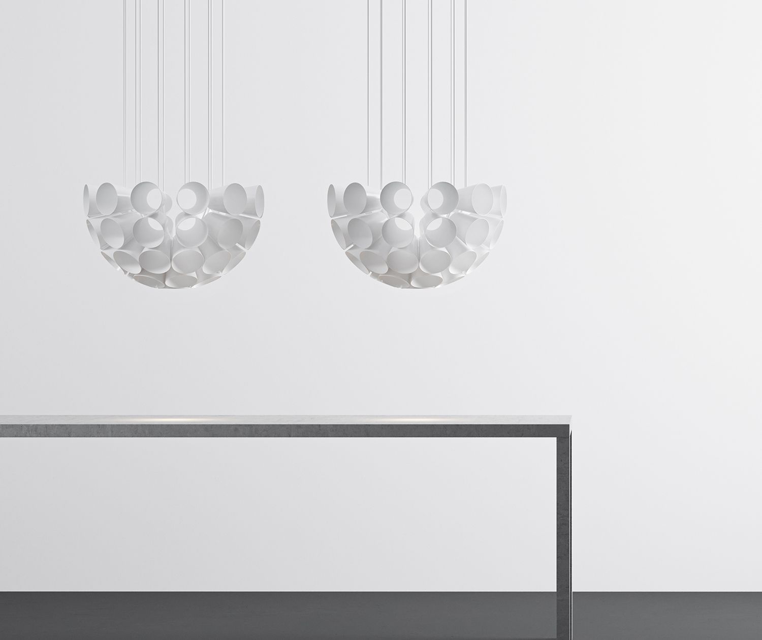 Світильник «Bellrise» - який складається з 25 конусоподібних абажурів та тонкої труби, що виконує роль каркасу і елементу кріплення. Інспірований фільмом «Тіні забутих предків». Його дизайн символізує багатовікові традиції та спадщину Гуцульщини. Не лише стильний акцент для вашого приміщення, «Bellrise» також має глибокий духовний зміст, який пробуджує, очищує та відновлює енергетику простору. Він є мостом між минулим і сучасністю, нагадуючи про важливість збереження та передачі культурних традицій для наступних поколінь.