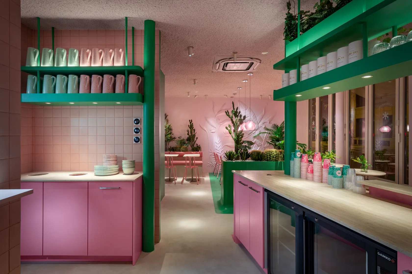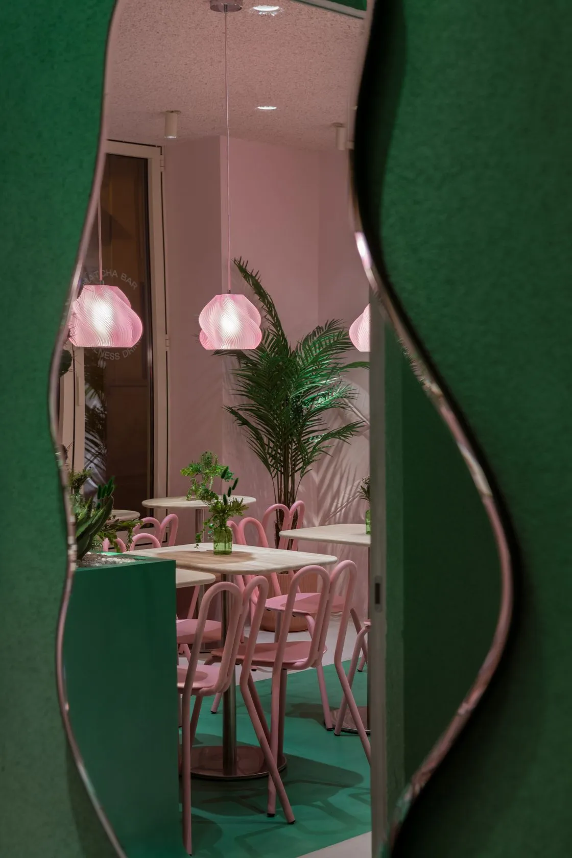 Простір створено таким чином, щоб гості хотіли його досліджувати. Продумані сценарії розташування меблів і декору мотивують відвідувачів до інтерактиву. Столи та стільці яскравих рожевих відтінків чудово контрастують із пишною зеленню, яка прикрашає кафе, створюючи динамічну та привабливу атмосферу.