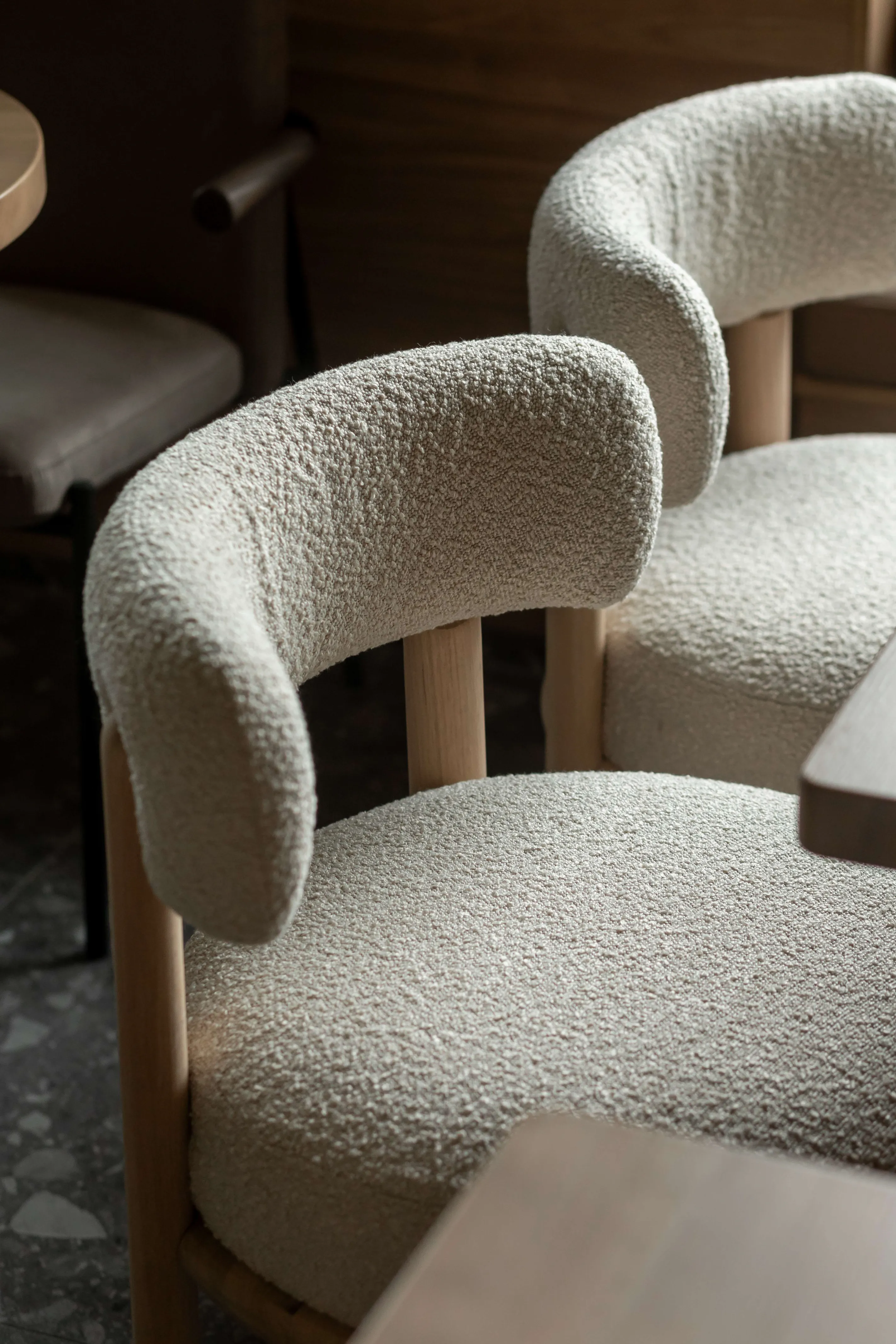 Інтер’єр побудований на поєднанні текстури дерева й глини з пісочно-попелястими відтінками. Всі стільниці, барна стійка та декоративні перегородки виготовлені з натурального дерева - їхні відтінки й текстури були підібрані таким чином, аби окремі об’єкти не конфліктували між собою, а навпаки єдиним тандемом підкреслювали цілісність інтер’єру.