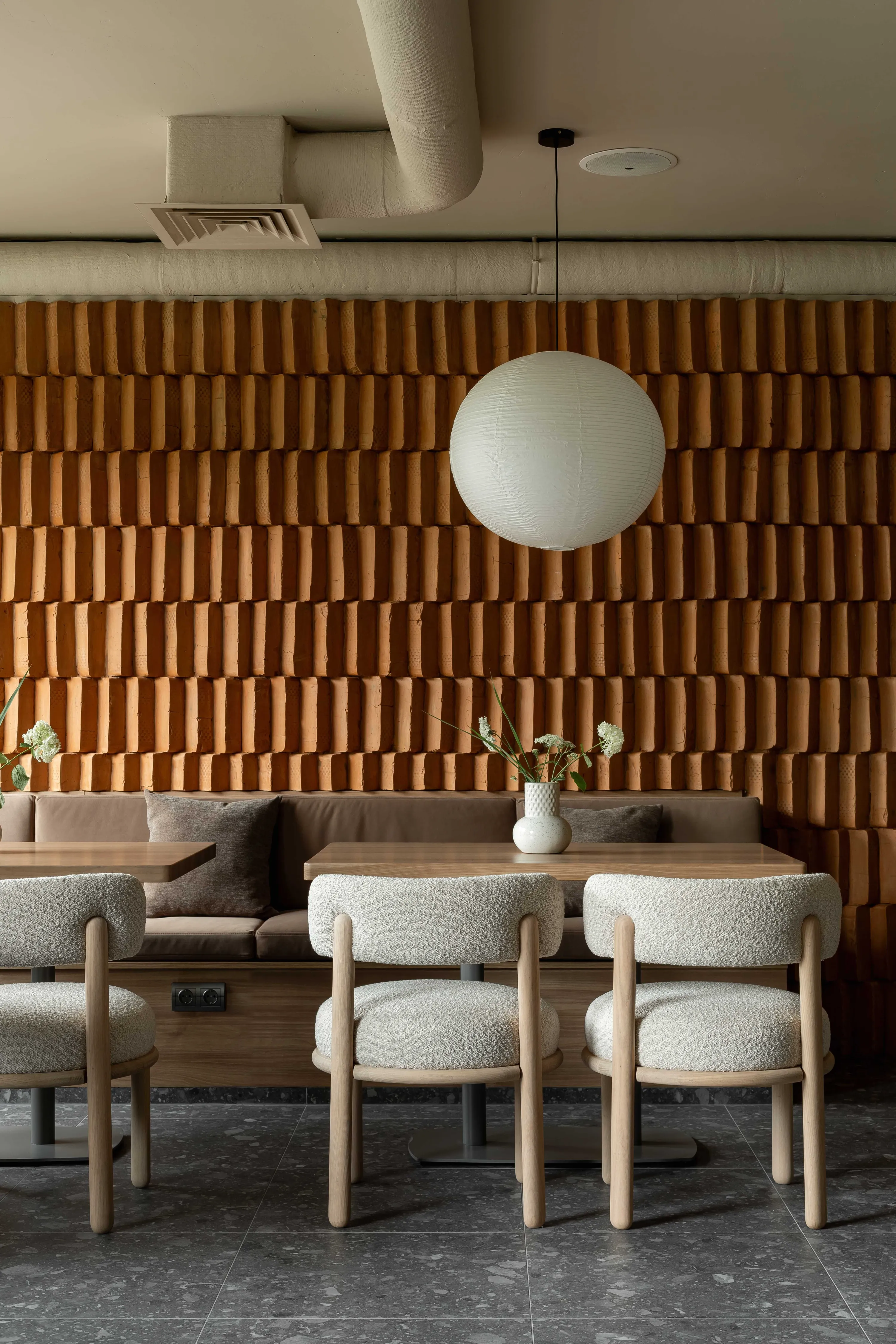 Зрештою, фінальний вигляд проєкту не лише передає характерну естетику закладу, а й опосередковано розповідає історію його створення через окремі деталі. Так, одним з основних візуальних акцентів інтер’єру Bonsai є фактурна цегляна стіна в торці приміщення. Втілення цього елементу в проєкті вимагало особливого підходу й унікальної техніки кладки - саме тим він врешті є настільки цінним, адже подібні нестандартні рішення не так часто зустрічаються в закладах невеликих містечок. Для Bonsai та його власників це не просто частина проєкту - це його візуальна точка тяжіння, що привертає увагу гостей, щойно ті потрапляють у простір закладу.
